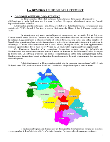 LA DEMOGRAPHIE DU DEPARTEMENT LA GEOGRAPHIE DU DEPARTEMENT Le département de l’Isère fait partie des 8 départements de la région administrative « Rhône-Alpes », mais également en lien avec le même découpage administratif quant au Conseil Régional ordinal de référence. L’Isère est en grande partie dans l’arc Alpin, avec la Savoie & la Haute-Savoie, correspondant à un territoire de l’ARS, duquel il faut ôter le secteur limitrophe du Rhône, à lier à d’autres territoires de l’ARS. Le département est vaste, particulièrement montagneux sur sa partie Sud et Est, avec d’autres massifs moins élevés au Centre et au Sud-Ouest, déterminant alors des successions de vallées ou de plateaux. L’agglomération la plus importante est celle de Grenoble. Elle réalise une vallée appelée « Y Grenoblois » et porteuse d’une activité économique et universitaire intenses et également à la pointe de la technologie. D’autres villes importantes sont à citer : Vienne, Bourgoin-Jallieu, les deux agglomérations se situant à proximité de Lyon, mais encore Voiron ou La Tour du Pin en plein centre du département. Ce département bénéficie d’un dynamisme économique certain, mais les inégalités de développement sont assez importantes et souvent à mettre en lien avec les facilités ou difficultés de moyen de locomotion. On retrouve d’ailleurs les mêmes correspondances entre zone démographique faible, développement économique bas et implantation des professionnels de santé et notamment des masseurskinésithérapeutes. Administrativement, le département comptait plus de cinquante cantons jusqu’en 2015, puis 29 depuis mars 2015, mais est surtout divisé en 13 territoires, tel qu’illustré par la carte suivante : Il peut aussi être plus aisé de raisonner en découpant le département en zones plus étendues et correspondant à des réalités de relief et d’activité humaine. On trouve alors le découpage suivant : 1 - l’Agglomération Grenobloise, correspondant essentiellement au territoire portant ce nom et au « Y Grenoblois » le Grand Sud du département, essentiellement montagneux, correspondant aux territoires de la Matheysine, de l’Oisans, du Trièves & du Vercors le Grésivaudan, à l’est de l’agglomération grenobloise en direction de la Savoie, entre le massif de Chartreuse et de Belledonne le Centre Isère Nord avec les territoires des Vals du Dauphiné et du Voirionnais-Chartreuse le Centre Isère Sud avec les territoires de Bièvre-Valloire & du Sud Grésivaudan le Nord Isère avec les territoires du Haut Rhône Dauphinois & des Portes des Alpes l’Isère Rhodanienne, territoire à part entière. La carte suivante permet de mieux se rendre compte de ce découpage : LE DECOMPTE DE POPULATION DU DEPARTEMENT Le dernier recensement dépassait légèrement les 1 million cent mille habitants pour une densité de 154 habitants au km², mais avec de fortes disparités, le Sud de l’Isère et plus globalement les zones montagneuses de faible densité et l’agglomération grenobloise proposant la plus forte densité, comme Grenoble intramuros qui présente près de 12 fois la densité moyenne du territoire d’implantation. On peut noter, par exemple le faible pourcentage de superficie (moins de 9%) de l’agglomération grenobloise pour une population approchant le tiers (35,63%) de la population iséroise, alors que le Sud Isère propose le rapport exactement inverse, soit 4,2% de la population pour 27,45% de la superficie. Après les bornes posées par les situations extrèmes, on peut noter les autres secteurs géographiques, la plupart s’approchant de la moyenne de densité du département ; - 19,11% de la population (2ème rang) et 16,5% (3ème rang) de la superficie pour le Nord-Isère, essentiellement dans la partie « Portes des Alpes » - 13,47% de la population (3ème rang) et 12,8% (4ème rang) de la superficie pour le Centre Isère Nord, essentiellement dans la partie « Voironnais Chartreuse » 2 plus de 8%(8,46) de la population (5ème rang) et près de 7.6% (5ème rang) de la superficie pour le Grésivaudan, sauf pour les secteurs suivants de densité s’éloignant de la moyenne du département ; - presque 10%(9,67) de la population (6ème rang) et près de 6,3% (7ème rang) de la superficie pour l’Isère Rhodanienne, avec densité faible surtout dans le canton de Roussillon. - presque 10%(9,46) de la population (4ème rang) et presque 21% (2ème rang) de la superficie pour le Centre Isère Sud, d’où une densité réellement plus faible - On retrouve également des disparités au niveau de la démographie des masseurskinésithérapeutes isérois. Avant de s’intéresser au tableau synthétique ci-dessous, il est nécessaire de rappeler que le total de professionnels inscrits au 7 juin 2016 est de 1661 (dont 152 remplaçants, contre 140 en février, 106 en juin, 131 en septembre, 133 en décembre 2014, 139 en mars 2015, 136 en juin 2015, 151 en septembre 2015, 155 en décembre 2015 & 146 en mars 2016) dans le collège libéral, dont 33 (2,4%) avec une activité mixte, de 262 dans le collège salarié (dont 14 contre 21 précédemment en remplacement ou encore 4 intérimaires contre 10), et donc un total de 1923, auquel il est bon d’ajouter 22 sociétés d’exercice professionnel. Ce qui donne 1.23 kiné libéral pour 1000 habitants (hors remplaçants & 1,354 en intégrant les remplaçants), 0,214 kiné salarié pour 1000 habitants et au total 1.564 kiné pour 1000 habitants, même s’il faudra plutôt prendre en compte les chiffres relatifs à l’exercice libéral qui compte pour un peu plus de 86 % de l’exercice de la masso-kinésithérapie et qui sont plus à même d’être mis en rapport avec la densité de population. Notons que : - la densité de masseurs-kinésithérapeutes est souvent la plus forte dans le territoire de l’agglomération grenobloise ou dans celui du Grésivaudan, en alternance