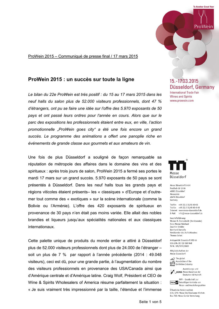 ProWein 2015 – Communiqué de presse final / 17 mars 2015 ProWein 2015 : un succès sur toute la ligne Le bilan du 22e ProWein est très positif : du 15 au 17 mars 2015 dans les neuf halls du salon plus de 52.000 visiteurs professionnels, dont 47 % d’étrangers, ont pu se faire une idée sur l’offre des 5.970 exposants de 50 pays et ont passé leurs ordres pour l‘année en cours. Alors que sur le parc des expositions les professionnels étaient entre eux, en ville, l’action promotionnelle „ProWein goes city“ a été une fois encore un grand succès. Le programme des animations a offert une panoplie riche en événements de grande classe aux gourmets et aux amateurs de vin. Une fois de plus Düsseldorf a souligné de façon remarquable sa réputation de métropole des affaires dans le domaine des vins et des spiritueux : après trois jours de salon, ProWein 2015 a fermé ses portes le mardi 17 mars sur un grand succès. 5.970 exposants de 50 pays se sont présentés à Düsseldorf. Dans les neuf halls tous les grands pays et régions viticoles étaient présents– les « classiques » d’Europe et d’outremer tout comme des « exotiques » sur la scène internationale (comme la Bolivie ou l’Arménie). L’offre des 420 exposants de spiritueux en provenance de 30 pays n’en était pas moins variée. Elle allait des nobles brandies et liqueurs jusqu’aux spécialités nationales et aux classiques internationaux. Cette palette unique de produits du monde entier a attiré à Düsseldorf plus de 52.000 visiteurs professionnels dont plus de 24.000 de l’étranger – soit un plus de 7 % par rapport à l’année précédente (2014 : 49.048 visiteurs), ceci est dû, pour une grande partie, à l’augmentation du nombre des visiteurs professionnels en provenance des USA/Canada ainsi que d’Amérique centrale et d’Amérique latine. Craig Wolf, Président et CEO de Wine & Spirits Wholesalers of America résume parfaitement la situation : « Je suis vraiment très impressionné par la taille, l’étendue et l’immense Seite 1 von 5 variété de produits de qualité qui sont présentés sur ProWein en provenance du monde entier – et tout cela, dans des halls modernes, facilement accessibles et conviviaux. ProWein a fait un travail formidable. Il est en passe de devenir l’un des premiers salons professionnels, créant de multiples opportunités tant pour les acheteurs que pour les vendeurs. » Cela fait aussi plaisir de voir que les acheteurs ont largement commandé sur ProWein : 40 % des visiteurs professionnels ont déjà commandé directement sur le salon et environ 44 % envisagent de passer leurs ordres après le salon. « La force de rayonnement internationale de ProWein et son importance comme plate-forme de passation de commande pour le commerce, la restauration et l’hôtellerie sont vraiment uniques. Nos visiteurs viennent de 123 pays – soit une fois encore, 13 pays de plus que l’an passé », selon Hans Werner Reinhard, Directeur de Messe Düsseldorf, pour étayer le succès de ProWein 2015. « Ce qui compte surtout, c’est la forte propension des acheteurs à passer des ordres sur le salon voire, après le salon. Pour être clair : ProWein est sans conteste le salon le plus important au monde pour la filière des vins et spiritueux comme salon professionnel et comme salon de prises d’ordres. » Ce qui intéresse le plus les visiteurs de ProWein ce sont – comme par le passé – les vins d’Allemagne, d’Italie, de France, d’Espagne et d’Autriche. Mais on constate aussi un intérêt croissant des professionnels pour le champagne (20 %), les vins mousseux & effervescents (19 %) ainsi que pour les spiritueux (21 %). La demande de vins allemands a encore progressé par rapport à l’an passé de 9 % atteignant 59 %. Et donc, le bilan de l’Institut allemand des Vins est positif. « Le nouveau concept des halls de ProWein est bien du point de vue des exposants allemands et a été bien perçu par les visiteurs. Du fait du déménagement dans les nouveaux halls du salon ce sont quelque 120 entreprises allemandes de plus en provenance des régions viticoles allemandes sur un total de 960 exposants allemands qui cette année ont pu exposer et se présenter ainsi Seite 2 von 5 à un public international », comme le résume Monika Reule, Directrice de l’Institut allemand des Vins (DWI). « Le millésime 2014 attendu avec impatience a trouvé un large écho auprès des visiteurs professionnels. Il a produit des vins blancs très fruités et agréablement légers qui séduisent par leur fraîcheur stimulante. La récolte de ce millésime légèrement supérieure à celle de l’an passé est tout à fait appropriée à la situation actuelle du marché. Nous pouvons ainsi mieux répondre à une demande soutenue des marchés intérieur et export, comme l‘a prouvé aussi cette session de ProWein. » L’Autriche – avec près de 5.000 m2, le cinquième plus grand pays exposant sur ProWein 2015 – en tire également un bilan positif. « ProWein est le salon des vins le plus important en Europe et dans le monde. Cela vaut en particulier pour la filière autrichienne des vins », comme le souligne Wilhelm Klinger, Directeur de Österreich Wein Marketing. « Du fait de la nouvelle répartition des halls avec un déménagement nécessaire du hall 7.0 dans le hall 17, nous sommes passés à l‘offensive et avons réalisé un concept d’exposition entièrement nouveau tant au niveau du design, de la circulation que du catering. Et je peux dire que le concept a bien pris. Nos vignerons ont eu de nombreux contacts intéressants de nos principaux marchés export, comme l’Allemagne, les USA et le Benelux – mais aussi des entretiens très prometteurs avec des acheteurs professionnels de Chine et d’Europe de l’Est. Un programme varié de dégustations et d‘animations Un élément fixe de ProWein fut cette année encore le programme des animations avec