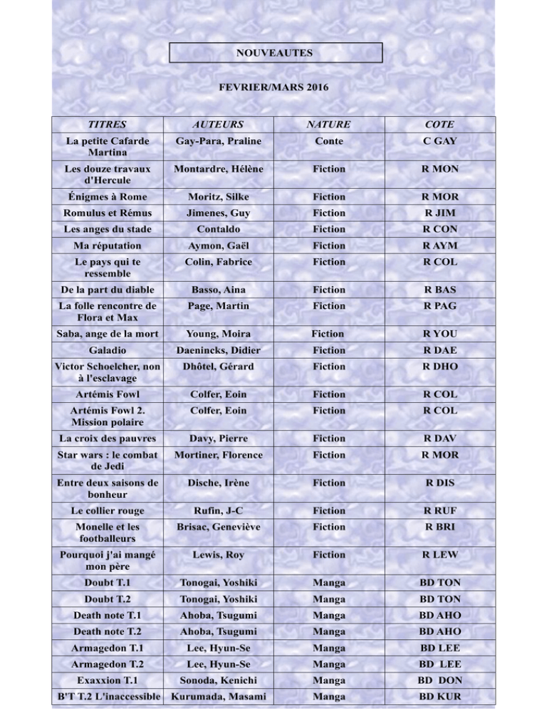 NOUVEAUTES FEVRIER/MARS 2016 TITRES AUTEURS NATURE COTE La petite Cafarde Martina Gay-Para, Praline Conte C GAY Les douze travaux d'Hercule Montardre, Hélène Fiction R MON Énigmes à Rome Moritz, Silke Fiction R MOR Romulus et Rémus Jimenes, Guy Fiction R JIM Les anges du stade Contaldo Fiction R CON Ma réputation Aymon, Gaël Fiction R AYM Le pays qui te ressemble Colin, Fabrice Fiction R COL De la part du diable Basso, Aina Fiction R BAS La folle rencontre de Flora et Max Page, Martin Fiction R PAG Saba, ange de la mort Young, Moira Fiction R YOU Galadio Daenincks, Didier Fiction R DAE Victor Schoelcher, non à l'esclavage Dhôtel, Gérard Fiction R DHO Artémis Fowl Colfer, Eoin Fiction R COL Artémis Fowl 2. Mission polaire Colfer, Eoin Fiction R COL La croix des pauvres Davy, Pierre Fiction R DAV Star wars : le combat de Jedi Mortiner, Florence Fiction R MOR Entre deux saisons de bonheur Dische, Irène Fiction R DIS Le collier rouge Rufin, J-C Fiction R RUF Monelle et les footballeurs Brisac, Geneviève Fiction R BRI Pourquoi j'ai mangé mon père Lewis, Roy Fiction R LEW Doubt T.1 Tonogai, Yoshiki Manga BD TON Doubt T.2 Tonogai, Yoshiki Manga BD TON Death note T.1 Ahoba, Tsugumi Manga BD AHO Death note T.2 Ahoba, Tsugumi Manga BD AHO Armagedon T.1 Lee, Hyun-Se Manga BD LEE Armagedon T.2 Lee, Hyun-Se Manga BD LEE Exaxxion T.1 Sonoda, Kenichi Manga BD DON Manga BD KUR B'T T.2 L'inaccessible Kurumada, Masami Basara T.2 Tamura, Yumi Manga BD TAM Striker T.1 Ninagawa, Ryoji Manga BD NIN Last man T.1 Balak Manga BD BAL Kingdom hearts T.1 Amano, Shiro Manga BD AMA Max et Lili trouvent leur cousin angoissé De Saint Mars, Dominique BD BD DES Lili veut être une star De Saint Mars, Dominique BD BD DES Alex est handicapé De Saint Mars, Dominique BD BD DES Max est timide De Saint Mars, Dominique BD BD DES Max ne respecte rien De Saint Mars, Dominique BD BD DES Pas facile de grandir Gep Album BD GEP Seuls T.7 Les terres basses Gazzotti BD Bd gaz Game Over T.2 Midam BD BD MID Cluedo T.1 Un crime presque parfait ! Barféty BD BD BAR Cache-cache avec les suricates : A travers l'histoire Wainwright, Jen BD JEUX BD WAI Cache-cache avec les suricates : Vive les vacances ! Wainwright, Jen BD JEUX BD WAI Les rugbymen T.10 Beka BD BD BEK Les colombes du RoiSoleil T. 3 Charlotte, la rebelle Desplat-Duc BD BD DES Chasseurs de dragons T.2 Copains comme zombies Venant BD BD VEN La souris de M. Grimaud Asch, Frank BD BD ASC Les légendaires T.17 Sobral, Patrick BD BD SOB Le collège invisible T.1 Cancrus supremus Ange BD BD ANG Scooby-Doo ! T.5 Pétoche et lampes de Rozum, John BD BD ROZ Lanteust de troy T.4 Arleston BD BD ARL Titeuf T.14 Bienvenue en adolescence ! Zep BD BD ZEP Bohemian galian T. 1 Coeur de pirate L'hermenier BD BD LHE Donjon T. 101 Le cimetière des dragons Sfar, Joann BD BD SFA Le train des orphelins Charlot, Philippe BD BD CHA Blacksad T.4 L'enfer, Diaz BD BD DIA Trolls de Troy T. 17 Arleston BD BD ARL La rose écarlate T.6 Lyfoung, Patricia BD BD LYF Les nombrils T.6 Un été trop mortel ! Delaf BD BD DEL Louca T.4 L'espoir fait vivre Dequier, Bruno BD BD DEQ Malala pour le droit des filles à l'éducation Frier, Raphaël BD BD FRO Carnets14/18 quatre histoires de France et d'Allemagne Hogh, Alexander BD BD HOG Les taxis de la Marne Le Naour BD BD LEN Studio danse T.6 Crip et Béka BD BD BEK Nanami T.1 Le théâtre du vent Nauriel BD BD NAU Le fayot T.1 Veys BD BD VEY Le fayot T.2 Veys BD BD VEY Garfield T.57 Crazy kart Davis, Jim BD BD DAV Femmes en résistance T.1 Amy Johnson Polack BD BD POL Le temps des bombes Moynot BD BD MOY Lucien père et fils Margerin, Frank BD BD MAR L'instit Latouche T.1 Seul contre toutes ! Leogrin, Falzar BD BD FAL Yoko Tsuno : Le dragon de Hong Kong T.16 Leloup, Roger BD BD LEL Millenium T.1 Runberg et Homs BD BD RUN Niki de Saint Phalle : le jardin secret Martin, Sandrine Biographie 720 DES Baïonnette aux crayons Auclert, Jean-Pierre Documentaire 741.5 AUC Les grandes dates de l'histoire du rock Assante, Ernesto Documentaire 781.66 ASS Le football, ma grande encyclopédie Ambrosiano Documentaire 796.083 AMB Génération Ado le dico El Don, Guillermo Dictionnaire 155.5 ELD Guinness world records 2016 Livre de records 034 GUI Dictionnaire Anglaisfrançais illustré Dictionnaire 423 DIC Les fauves Beaumont, Emilie Documentaire 599.75 BEA Les portes-avions Dayan, Jacques Documentaire 623 DAY Le téléphone Beaumont, Jacques Documentaire 621 BEA L'invisible Beaumont, Jack Documentaire 500.83 BEA Le moyen âge Beaumont, Emilie Documentaire 940.1 BEA Le cyclisme Beaumont, Jack Documentaire 796.6 BEA Le football et les sports collectifs Lamy, Anne Documentaire 796.083 LAM Oh ! La terre Woodward, John Documentaire 551 WOO Miniatures passion Deguilhem Guide pratique 684 DEG Architecture Larroche Caroline Documentaire 720 LAR Les légendes noires Lamoureux, Sophie Biographie 920.02 LES Muscle tes maths Godsmith, Mike Documentaire 510 GOL 10 grands empires Feiner Documentaire 903 FEI La grande aventure de l'évolution Panafieu (de) Documentaire 576.8 PAN Le travail secret de la nature Tordjman, Nathalie Documentaire 577.083 TOR Mon premier quiz sports Jackson, Tom Quiz 796.07 JAC Comment dessiner la mode Watanabe, Naoki Guide pratique 391 WAT Chapeau, C3RV34U Panafieu(de) Documentaire 611.8 PAN Sur la piste des ours Marion Documentaire 599.78 MAR Équitation Carre, Emmanuelle Documentaire 798.2 CAR BMX freestyle Thomas, Isabel Documentaire 796.6 THO La calligraphie Sold, Jeanine Guide 745.6 SOL Dessiner les mangas Henri-Olivier Guide 741.5 HEN Parlons-en ! Trop gros, trop maigres ? Clerc, Odile Documentaire 616.39 CLE Les mythes romains pour réfléchir Korda, Isabelle Documentaire 292 KOR Annale 510 MAT Réussite-brevet : mathématiques 3e La résistance en France 1940-1944 Vast, Cécile Documentaire 940.53 VAS Israël/Palestine : une terre pour deux Dhôtel, Gérard Documentaire 320.95 DHO L'abcdaire de la citoyenneté pour mieux vivre ensemble Rousseau, Ni
