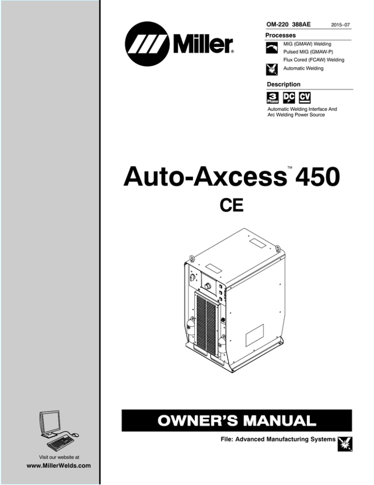 OM-220 388AE 2015−07 Processes MIG (GMAW) Welding Pulsed MIG (GMAW-P) Flux Cored (FCAW) Welding Automatic Welding Description Automatic Welding Interface And Arc Welding Power Source Auto-Axcess 450 ™ CE File: Advanced Manufacturing Systems Visit our website at www.MillerWelds.com From Miller to You Thank you and congratulations on choosing Miller. Now you can get the job done and get it done right. We know you don’t have time to do it any other way. That’s why when Niels Miller first started building arc welders in 1929, he made sure his products offered long-lasting value and superior quality. Like you, his customers couldn’t afford anything less. Miller products had to be more than the best they could be. They had to be the best you could buy. Today, the people that build and sell Miller products continue the tradition. They’re just as committed to providing equipment and service that meets the high standards of quality and value established in 1929. This Owner’s Manual is designed to help you get the most out of your Miller products. Please take time to read the Safety precautions. They will help you protect yourself against potential hazards on the worksite. We’ve made installation and operation quick and easy. With Miller you can count on years of reliable service with proper maintenance. And if for some reason the unit needs repair, there’s a Troubleshooting section that will help you figure out what the problem is. The Miller is the first welding parts list will then help you to decide the equipment manufacturer in exact part you may need to fix the problem. the U.S.A. to be registered to the ISO 9001 Quality System Warranty and service information for your Standard. particular model are also provided. Miller Electric manufactures a full line of welders and welding related equipment. For information on other quality Miller products, contact your local Miller distributor to receive the latest full line catalog or individual specification sheets. To locate your nearest distributor or service agency call 1-800-4-A-Miller, or visit us at www.MillerWelds.com on the web. Mil_Thank 2009−09 Working as hard as you do − every power source from Miller is backed by the most hassle-free warranty in the business. TABLE OF CONTENTS SECTION 1 − SAFETY PRECAUTIONS - READ BEFORE USING . . . . . . . . . . . . . . . . . . . . . . . . . . . . . . . . . 1-1. Symbol Usage . . . . . . . . . . . . . . . . . . . . . . . . . . . . . . . . . . . . . . . . . . . . . . . . . . . . . . . . . . . . . . . . . . . . . . . 1-2. Arc Welding Hazards . . . . . . . . . . . . . . . . . . . . . . . . . . . . . . . . . . . . . . . . . . . . . . . . . . . . . . . . . . . . . . . . . 1-3. Additional Symbols For Installation, Operation, And Maintenance . . . . . . . . . . . . . . . . . . . . . . . . . . . . . 1-4. California Proposition 65 Warnings . . . . . . . . . . . . . . . . . . . . . . . . . . . . . . . . . . . . . . . . . . . . . . . . . . . . . . 1-5. Principal Safety Standards . . . . . . . . . . . . . . . . . . . . . . . . . . . . . . . . . . . . . . . . . . . . . . . . . . . . . . . . . . . . . 1-6. EMF Information . . . . . . . . . . . . . . . . . . . . . . . . . . . . . . . . . . . . . . . . . . . . . . . . . . . . . . . . . . . . . . . . . . . . . SECTION 2 − CONSIGNES DE SÉCURITÉ − LIRE AVANT UTILISATION . . . . . . . . . . . . . . . . . . . . . . . . . . . 2-1. Symboles utilisés . . . . . . . . . . . . . . . . . . . . . . . . . . . . . . . . . . . . . . . . . . . . . . . . . . . . . . . . . . . . . . . . . . . . . 2-2. Dangers relatifs au soudage à l’arc . . . . . . . . . . . . . . . . . . . . . . . . . . . . . . . . . . . . . . . . . . . . . . . . . . . . . . 2-3. Dangers supplémentaires en relation avec l’installation, le fonctionnement et la maintenance . . . . . 2-4. Proposition californienne 65 Avertissements . . . . . . . . . . . . . . . . . . . . . . . . . . . . . . . . . . . . . . . . . . . . . . 2-5. Principales normes de sécurité . . . . . . . . . . . . . . . . . . . . . . . . . . . . . . . . . . . . . . . . . . . . . . . . . . . . . . . . . 2-6. Informations relatives aux CEM . . . . . . . . . . . . . . . . . . . . . . . . . . . . . . . . . . . . . . . . . . . . . . . . . . . . . . . . . SECTION 3 − DEFINITIONS . . . . . . . . . . . . . . . . . . . . . . . . . . . . . . . . . . . . . . . . . . . . . . . . . . . . . . . . . . . . . . . . . . 3-1. Additional Safety Symbols and Definitions . . . . . . . . . . . . . . . . . . . . . . . . . . . . . . . . . . . . . . . . . . . . . . . . 3-2. Miscellaneous Symbols And Definitions . . . . . . . . . . . . . . . . . . . . . . . . . . . . . . . . . . . . . . . . . . . . . . . . . . SECTION 4 − SPECIFICATIONS . . . . . . . . . . . . . . . . . . . . . . . . . . . . . . . . . . . . . . . . . . . . . . . . . . . . . . . . . . . . . . 4-1. Serial Number And Rating Label Location . . . . . . . . . . . . . . . . . . . . . . . . . . . . . . . . . . . . . . . . . . . . . . . . 4-2. Unit Specifications . . . . . . . . . . . . . . . . . . . . . . . . . . . . . . . . . . . . . . . . . . . . . . . . . . . . . . . . . . . . . . . . . . . . 4-3. Dimensions And Weight . . . . . . . . . . . . . . . . . . . . . . . . . . . . . . . . . . . . . . . . . . . . . . . . . . . . . . . . . . . . . . . 4-4. Duty Cycle And Overheating . . . . . . . . . . . . . . . . . . . . . . . . . . . . . . . . . . . . . . . . . . . . . . . . . . . . . . . . . . . 4-5. Volt-Ampere Curves . . . . . . . . . . . . . . . . . . . . . . . . . . . . . . . . . . . . . . . . . . . . . . . . . . . . . . . . . . . . . . . . . . 4-6. Environmental Specifications . . . . . . . . . . . . . . . . . . . . . . . . . . . . . . . . . . . . . . . . . . . . . . . . . . . . . . . . . . . SECTION 5 − INSTALLATION . . . . . . . . . . . . . . . . . . . . . . . . . . . . . . . . . . . . . . . . . . . . . . . . . . . . . . . . . . . . . . . . 5-1. Selecting A Location . . . . . . .