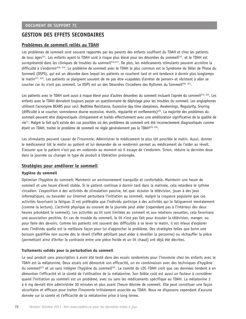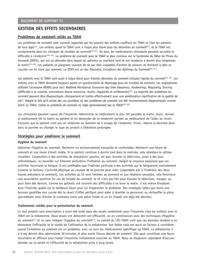 DOCUMENT DE SUPPORT 7C GESTION DES EFFETS SECONDAIRES Problèmes de sommeil reliés au TDAH Les problèmes de sommeil sont souvent rapportés par les parents des enfants souffrant du TDAH et chez les patients de tous âges214. Les enfants ayant le TDAH sont à risque plus élevé pour les désordres du sommeil215, et le TDAH est surreprésenté dans les cliniques de troubles du sommeil216,217. De plus, les médicaments stimulants peuvent accroître la difficulté à s’endormir218, 219. Le problème de sommeil avec le TDAH le plus commun est le Syndrome du Délai de Phase du Sommeil (DSPS), qui est un désordre dans lequel les patients se couchent tard et ont tendance à dormir plus longtemps le matin217, 220. Les patients se plaignent souvent de ne pas être «capables d’arrêter de penser» et résistent à aller se coucher car ils n’ont pas sommeil. Le DSPS est un des Désordres Circadiens des Rythmes du Sommeil220, 221. Les patients avec le TDAH sont aussi à risque élevé pour d’autres désordres du sommeil incluant l’apnée du sommeil215, 222. Les enfants avec le TDAH devraient toujours passer un questionnaire de dépistage pour les troubles du sommeil. Les anglophones utilisent l’acronyme BEARS pour ceci: Bedtime Resistance, Excessive day time sleepiness, Awakenings, Regularity, Snoring (difficulté à se coucher, somnolence diurne excessive, réveils, régularité et ronflements)223. La majorité des problèmes du sommeil peuvent être diagnostiqués cliniquement et traités effectivement avec une amélioration significative de la qualité de vie11. Malgré le fait qu’il existe des cas possibles où des problèmes de sommeil ont été incorrectement diagnostiqués comme étant un TDAH, traiter le problème de sommeil ne règle généralement pas le TDAH219, 220. Les stimulants peuvent causer de l’insomnie: Administrer le médicament le plus tôt possible le matin. Aussi, donner le médicament tôt le matin au patient et lui demander de se rendormir permet au médicament de l’aider au réveil. S’assurer que le patient n’est pas en «rebond» au moment où il essaye de s’endormir. Sinon, réduire la dernière dose dans la journée ou changer le type de produit à libération prolongée. Stratégies pour améliorer le sommeil Hygiène du sommeil Optimiser l’hygiène du sommeil: Maintenir un environnement tranquille et confortable. Maintenir une heure de sommeil et une heure d’éveil stable. Si le patient continue à dormir tard dans la matinée, cela retardera le rythme circadien. L’exposition à des activités de stimulation passive, tel que: écouter la télévision, jouer à des jeux informatiques, ou bavarder sur Internet perturbera l’initiation au sommeil, malgré la croyance populaire que ces activités favorisent la fatigue. Il est préférable que l’individu participe à des activités qui le fatigueront mentalement (comme la lecture). L’activité physique au courant de la journée peut aider (cependant pas à l’intérieur des deux heures précédant le sommeil). Les activités au lit sont limitées au sommeil et aux relations sexuelles, cela favorisera une association positive. En cas de trouble du sommeil, le lit n’est pas fait pour écouter la télévision, manger, ou pour faire des devoirs. Comme les patients ont souvent des difficultés à se lever le matin, il est mieux d’explorer avec l’individu quelle est la meilleure façon pour lui d’approcher le problème. Des stratégies telles que boire une boisson gazéifiée non sucrée dès le réveil (l’effet pétillant peut aider à réveiller la personne) ou réchauffer la pièce (permettant ainsi d’éviter le contraste entre une pièce froide et un lit chaud) ont déjà été décrites. Traitements validés pour la perturbation du sommeil Le seul produit sans prescription à avoir été testé dans des essais randomisés pour l’insomnie chez les enfants avec le TDAH est la mélatonine. Deux essais ont démontré son efficacité, un en combinaison avec des techniques d’hygiène du sommeil221 et un sans intégrer l’hygiène du sommeil225. Le comité du LDC-TDAH croit que ces données tendent à en démontrer l’efficacité et la sûreté de l’utilisation de la mélatonine. Son faible coût est aussi un facteur à considérer quand l’initiation au sommeil est un problème, avec ou sans les médicaments spécifique au TDAH. La mélatonine 3 à 6 mg devrait être administrée 30 minutes et plus avant l’heure désirée de sommeil. Elle peut constituer une façon sécuritaire et efficace pour traiter l’insomnie initialement associée au TDAH. Nous ne disposons cependant d’aucune donnée sur la sûreté et l’efficacité de la mélatonine prise à long terme. 72 Version: Octobre 2011. Voir www.caddra.ca pour les dernières mises à jour Traitements non validés pour les perturbations du sommeil Les suggestions suivantes n’ont pas été investiguées suffisamment pour prouver leur efficacité. D’avantage de recherches seront requises. En tout temps, le patient est invité à consulter son médecin pour discuter de ces possibilités. Certaines collations diététiques peuvent avoir un effet sédatif: les interventions diététiques sont souvent des aliments hauts en tryptophane, un acide aminé commun qu’on retrouve dans des aliments tels: la dinde, les fèves, le riz, l’humus, les lentilles, les noisettes, les arachides, les graines de sésame, le thon, le lait de soya, le lait de vache, et d’autres produits laitiers. Un exemple de collation est un sandwich au beurre d’arachides avec graines de sésame hachées et un verre de lait, consommés une heure avant le sommeil. Remèdes naturopathiques: la racine de valériane (extrait de 450-900 mg) n’a pas été investiguée cliniquement mais est reconnue comme étant relativement sécuritaire et des rapports anecdotiques suggèrent son efficacité. D’autres médicaments sans prescription: incluent le Be