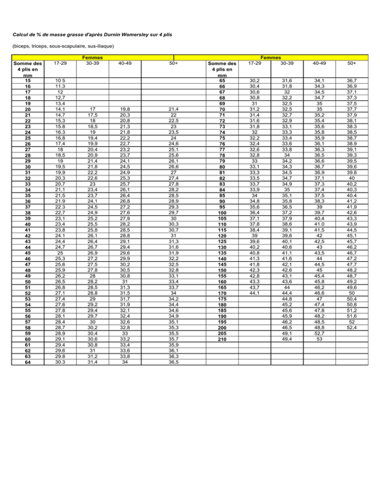 Calcul de % de masse grasse d'après Durnin Womersley sur 4 plis (biceps, triceps, sous-scapulaire, sus-iliaque) Somme des 4 plis en mm 15 16 17 18 19 20 21 22 23 24 25 26 27 28 29 30 31 32 33 34 35 36 37 38 39 40 41 42 43 44 45 46 47 48 49 50 51 52 53 54 55 56 57 58 59 60 61 62 63 64 17-29 10 5 11.3 12 12,7 13,4 14.1 14,7 15,3 15.8 16.3 16,8 17,4 18 18,5 19 19,5 19,9 20,3 20,7 21,1 21,5 21.9 22.3 22,7 23,1 23,4 23,8 24.1 24,4 24,7 25 25,3 25,6 25,9 26,2 26,5 26,8 27,1 27,4 27,6 27,8 28,1 28,4 28,7 28,9 29,1 29,4 29,6 29.8 30.3 Femmes 30-39 17 17,5 18 18,5 19 19,4 19,9 20,4 20,9 21,4 21,8 22,2 22,6 23 23,4 23,7 24,1 24,5 24,9 25,2 25,5 25,8 26,1 26,4 26,7 26,9 27,2 27,5 27,8 28 28,2 28,5 28,8 29 29,2 29,4 29,7 30 30,2 30,4 30,6 30,8 31 31,2 31,4 40-49 19,8 20,3 20,8 21,3 21,8 22,2 22,7 23,2 23,7 24,1 24,5 24,9 25,3 25,7 26,1 26,4 26,8 27,2 27,6 27,9 28,2 28,5 28,8 29,1 29,4 29,6 29,9 30,2 30,5 30,8 31 31,3 31,5 31,7 31,9 32,1 32,4 32,6 32,8 33 33,2 33,4 33,6 33,8 34 50+ 21,4 22 22,5 23 23,5 24 24,6 25,1 25,6 26,1 26,6 27 27,4 27,8 28,2 28,5 28,9 29,3 29,7 30 30,3 30,7 31 31,3 31,6 31,9 32,2 32,5 32,8 33,1 33,4 33,7 34 34,2 34,4 34,6 34,9 35,1 35,3 35,5 35,7 35,9 36,1 36,3 36,5 Somme des 4 plis en mm 65 66 67 68 69 70 71 72 73 74 75 76 77 78 79 80 81 82 83 84 85 90 95 100 105 110 115 120 125 130 135 140 145 150 155 160 165 170 175 180 185 190 195 200 205 210 Femmes 17-29 30-39 30,2 30,4 30,6 30,8 31 31,2 31,4 31,6 31,8 32 32,2 32,4 32,6 32,8 33 33,1 33,3 33,5 33,7 33,9 34 34,8 35,6 36,4 37,1 37,8 38,4 39 39,6 40,2 40,8 41,3 41,8 42,3 42,8 43,3 43,7 44,1 31,6 31,8 32 32,2 32,5 32,5 32,7 32,9 33,1 33,3 33,4 33,6 33,8 34 34,2 34,3 34,5 34,7 34,9 35 35,1 35,8 36,5 37,2 37,9 38,6 39,1 39,6 40,1 40,6 41,1 41,6 42,1 42,6 43,1 43,6 44 44,4 44,8 45,2 45,6 45,9 46,2 46,5 49,1 49,4 40-49 50+ 34,1 34,3 34,5 34,7 35 35 35,2 35,4 35,6 35,8 35,9 36,1 36,3 36,5 36,6 36,7 36,9 37,1 37,3 37,4 37,5 38,3 39 39,7 40,4 41.0 41,5 42 42,5 43 43,5 44 44,5 45 45,4 45,8 46,2 46,6 47 47,4 47,8 48,2 48,5 48,8 52,7 53 36,7 36,9 37,1 37,3 37,5 37,7 37,9 38,1 38.3 38,5 38,7 38.9 39,1 39,3 39,5 39,6 39.8 40 40,2 40,3 40.4 41,2 41,9 42,6 43,3 43,9 44,5 45,1 45,7 46,2 46,7 47,2 47,7 48,2 48,7 49,2 49,6 50 50,4 50,8 51,2 51,6 52 52,4