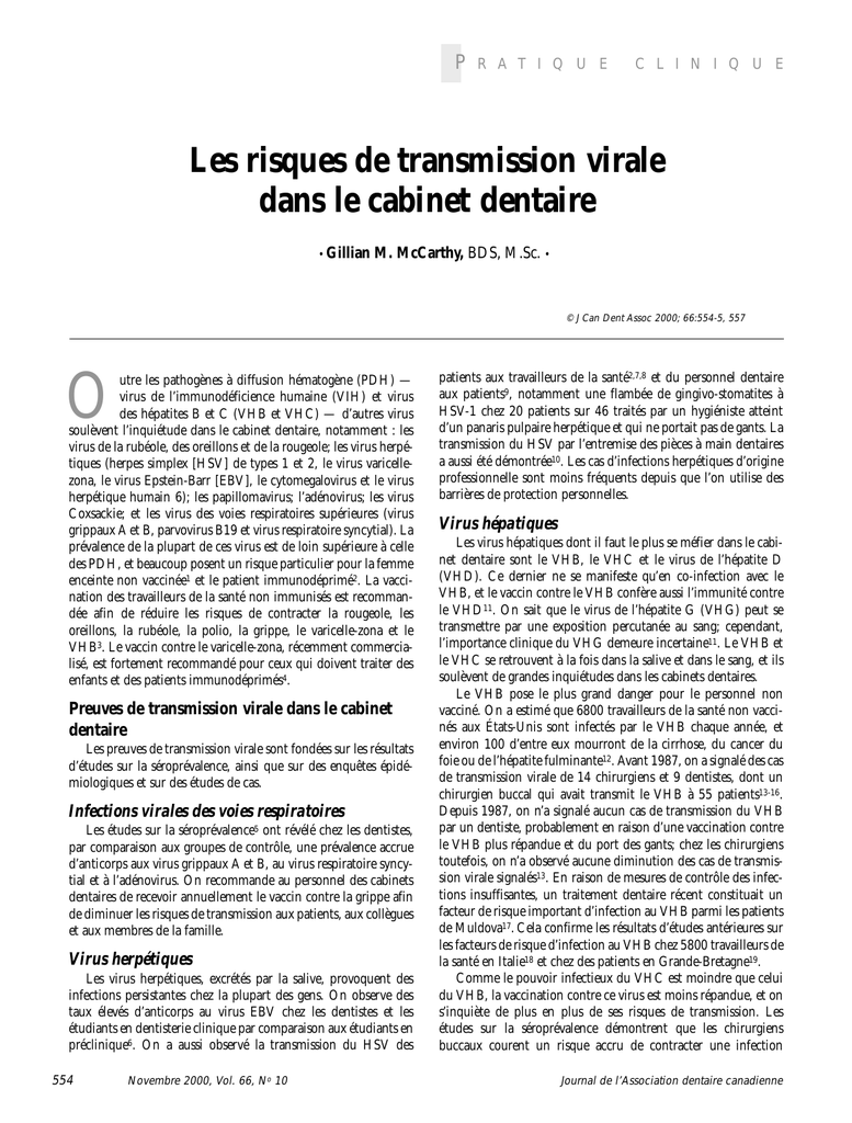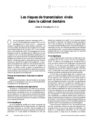 P R A T I Q U E C L I N I Q U E Les risques de transmission virale dans le cabinet dentaire • Gillian M. McCarthy, BDS, M.Sc. • © J Can Dent Assoc 2000; 66:554-5, 557 O utre les pathogènes à diffusion hématogène (PDH) — virus de l’immunodéficience humaine (VIH) et virus des hépatites B et C (VHB et VHC) — d’autres virus soulèvent l’inquiétude dans le cabinet dentaire, notamment : les virus de la rubéole, des oreillons et de la rougeole; les virus herpétiques (herpes simplex [HSV] de types 1 et 2, le virus varicellezona, le virus Epstein-Barr [EBV], le cytomegalovirus et le virus herpétique humain 6); les papillomavirus; l’adénovirus; les virus Coxsackie; et les virus des voies respiratoires supérieures (virus grippaux A et B, parvovirus B19 et virus respiratoire syncytial). La prévalence de la plupart de ces virus est de loin supérieure à celle des PDH, et beaucoup posent un risque particulier pour la femme enceinte non vaccinée1 et le patient immunodéprimé2. La vaccination des travailleurs de la santé non immunisés est recommandée afin de réduire les risques de contracter la rougeole, les oreillons, la rubéole, la polio, la grippe, le varicelle-zona et le VHB3. Le vaccin contre le varicelle-zona, récemment commercialisé, est fortement recommandé pour ceux qui doivent traiter des enfants et des patients immunodéprimés4. Preuves de transmission virale dans le cabinet dentaire Les preuves de transmission virale sont fondées sur les résultats d’études sur la séroprévalence, ainsi que sur des enquêtes épidémiologiques et sur des études de cas. Infections virales des voies respiratoires Les études sur la séroprévalence5 ont révélé chez les dentistes, par comparaison aux groupes de contrôle, une prévalence accrue d’anticorps aux virus grippaux A et B, au virus respiratoire syncytial et à l’adénovirus. On recommande au personnel des cabinets dentaires de recevoir annuellement le vaccin contre la grippe afin de diminuer les risques de transmission aux patients, aux collègues et aux membres de la famille. Virus herpétiques Les virus herpétiques, excrétés par la salive, provoquent des infections persistantes chez la plupart des gens. On observe des taux élevés d’anticorps au virus EBV chez les dentistes et les étudiants en dentisterie clinique par comparaison aux étudiants en préclinique6. On a aussi observé la transmission du HSV des 554 Novembre 2000, Vol. 66, No 10 patients aux travailleurs de la santé2,7,8 et du personnel dentaire aux patients9, notamment une flambée de gingivo-stomatites à HSV-1 chez 20 patients sur 46 traités par un hygiéniste atteint d’un panaris pulpaire herpétique et qui ne portait pas de gants. La transmission du HSV par l’entremise des pièces à main dentaires a aussi été démontrée10. Les cas d’infections herpétiques d’origine professionnelle sont moins fréquents depuis que l’on utilise des barrières de protection personnelles. Virus hépatiques Les virus hépatiques dont il faut le plus se méfier dans le cabinet dentaire sont le VHB, le VHC et le virus de l’hépatite D (VHD). Ce dernier ne se manifeste qu’en co-infection avec le VHB, et le vaccin contre le VHB confère aussi l’immunité contre le VHD11. On sait que le virus de l’hépatite G (VHG) peut se transmettre par une exposition percutanée au sang; cependant, l’importance clinique du VHG demeure incertaine11. Le VHB et le VHC se retrouvent à la fois dans la salive et dans le sang, et ils soulèvent de grandes inquiétudes dans les cabinets dentaires. Le VHB pose le plus grand danger pour le personnel non vacciné. On a estimé que 6800 travailleurs de la santé non vaccinés aux États-Unis sont infectés par le VHB chaque année, et environ 100 d’entre eux mourront de la cirrhose, du cancer du foie ou de l’hépatite fulminante12. Avant 1987, on a signalé des cas de transmission virale de 14 chirurgiens et 9 dentistes, dont un chirurgien buccal qui avait transmit le VHB à 55 patients13-16. Depuis 1987, on n’a signalé aucun cas de transmission du VHB par un dentiste, probablement en raison d’une vaccination contre le VHB plus répandue et du port des gants; chez les chirurgiens toutefois, on n’a observé aucune diminution des cas de transmission virale signalés13. En raison de mesures de contrôle des infections insuffisantes, un traitement dentaire récent constituait un facteur de risque important d’infection au VHB parmi les patients de Muldova17. Cela confirme les résultats d’études antérieures sur les facteurs de risque d’infection au VHB chez 5800 travailleurs de la santé en Italie18 et chez des patients en Grande-Bretagne19. Comme le pouvoir infectieux du VHC est moindre que celui du VHB, la vaccination contre ce virus est moins répandue, et on s’inquiète de plus en plus de ses risques de transmission. Les études sur la séroprévalence démontrent que les chirurgiens buccaux courent un risque accru de contracter une infection Journal de l’Association dentaire canadienne Les risques de transmission virale dans le cabinet dentaire au VHC, surtout dans les régions où le taux d’incidence est élevé20-21. On note aussi que le traitement dentaire est étroitement relié à la présence d’anticorps au VHC chez les patients atteints d’hépatite non A et non B aiguë sans antécédents de transfusion sanguine ni d’usage de drogues injectables par voie intraveineuse22. VIH Selon le laboratoire de santé publique23, en juin 1999, on comptait 319 cas d’infection au VIH d’origine professionnelle parmi les travailleurs de la santé dans le monde. Parmi ceux-ci, 102 ont été confirmés (résultat négatif au test de la valeur de base du VIH après l’exposition, avec séroconversion subséquente, ou sous-typage ou génotypage pour déceler une souche identique du VIH à la source et chez les personnes exposées). Sur 217 cas possibles ou probables, 9 conc