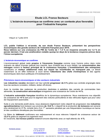 COMMUNIQUE DE PRESSE Etude LCL France Secteurs L’éclaircie économique se confirme avec un contexte plus favorable pour l’industrie française Villejuif, le 7 juillet 2016 LCL publie l’édition à mi-année, de son étude France Secteurs, présentant les perspectives économiques des grands secteurs de l’industrie française pour 2016. Nous tablons sur une croissance du PIB de l’ordre de + 1,5 % en moyenne annuelle (vs 1,2 % en janvier dernier). C’est une amélioration notable quoiqu’en deçà de la tendance moyenne prévue dans l’Union européenne. L’éclaircie économique se confirme L’environnement global reste propice à l’économie française comme nous l’avions prévu dans notre scénario de début d’année (pétrole bon marché, taux d’intérêt bas et euro faible). La consommation des ménages restera le facteur principal de la croissance française. L’investissement des entreprises constituera un moteur additionnel mais sur lequel les incertitudes ne manquent pas. Le Brexit notamment va en effet renforcer à court terme l’attentisme des chefs d’entreprises et des agents économiques dans leurs politiques d’investissement. Prévisions macro-économiques et des secteurs industriels Les industries navales devraient voir leur activité progresser de 6 % grâce aux contrats engrangés dans tous les secteurs (croisière, militaire, éolien off-shore). Avec la montée des cadences de production destinées à satisfaire des carnets de commandes bien alimentés, la construction aéronautique enregistrera une croissance de l’ordre de +4 %. L’industrie automobile française bénéficie de la dynamique européenne. Nous maintenons nos objectifs de croissance de +4 % tant pour le segment des voitures particulières et des véhicules légers que pour celui de l’équipement automobile. Suite à une demande plutôt atone, nous abaissons légèrement notre objectif de progression des industries agroalimentaires hors boisson aux environs de +0,6 %. L’objectif de la production de boissons est ramené plus sévèrement à +1 %, compte tenu d’un 1er semestre pénalisé par une fréquentation touristique en berne et des conditions climatiques peu favorables. La filière du bâtiment confirmera son redressement et nous relevons l’objectif de croissance autour de +2,5 % grâce au segment du logement neuf. En revanche, les travaux publics resteront encore déprimés avec un repli attendu de -4 %. Contacts presse : Olivier TASSAIN Brigitte NEIGE 01.42.95.54.77 01.42.95.39.97 [email protected] [email protected] Plus d’info : http://www.lcl.com Crédit Lyonnais - SA au capital de 1 847 860 375 € - Siren 954 509 741 - RCS LYON – Siège central : 20, avenue de Paris 94 800 Villejuif Les secteurs d’activité de l’étude LCL France Secteurs détaille les prévisions 2016 des secteurs suivants : Secteurs à caractère d’indicateurs avancés : Composants électroniques, Carton Ondulé, Publicité, Travail temporaire. Secteurs fondamentaux : Agroalimentaire dont boissons, Aéronautique, Industrie automobile, Bâtiment et Travaux publics. Industries et recyclage : Filière déchets, Verre, Industrie papetière, Sidérurgie, Fonderie. Autres industries : Industries mécaniques, Industries navales, Industries chimiques, Industries pharmaceutiques, Industries graphiques. Services : Services informatiques, Services télécoms, Grand commerce, Edition, Transport routier de marchandises. L’étude LCL France Secteurs L’étude LCL France Secteurs est réalisée pour le compte de LCL Banque des Entreprises par les ingénieurs conseils et économistes de la Direction des Etudes Economiques de Crédit Agricole S.A. Depuis 1973, LCL France Secteurs détaille chaque année les prévisions d’activité par grands secteurs de l’industrie française. Ces prévisions sont à nouveau publiées avant l’été pour tenir compte des grands événements économiques du premier semestre. Cette étude, entièrement refondue en janvier dernier, propose également une description du contexte économique français et de ses prévisions, ainsi que des éclairages sur les principales ressources des entreprises (contexte énergétique, matières premières agricoles, métaux, financements, …). A propos de LCL: LCL, filiale de Crédit Agricole SA, est l’une des plus grandes banques de détail en France. LCL est une banque de proximité qui compte aujourd’hui 20 000 collaborateurs au service de 6 000 000 de clients particuliers, 330 000 clients professionnels et 28 000 clients entreprises et institutionnels. LCL Banque des Entreprises compte 69 implantations géographiques dédiées aux entreprises françaises (CA > 7 millions euros) et aux filiales de groupes étrangers en France. La Banque des Entreprises est présente sur deux grands métiers : la banque commerciale (flux domestiques et internationaux, financements à court, moyen et long terme, placements) et le « corporate finance », activité spécialisée notamment dans les opérations de transmission et de reprise d'entreprises. Contacts presse : Olivier TASSAIN Brigitte NEIGE 01.42.95.54.77 01.42.95.39.97 [email protected] [email protected] Plus d’info : http://www.lcl.com Crédit Lyonnais - SA au capital de 1 847 860 375 € - Siren 954 509 741 - RCS LYON – Siège central : 20, avenue de Paris 94 800 Villejuif