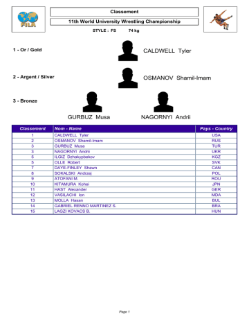 Classement 11th World University Wrestling Championship STYLE : FS 74 kg 1 - Or / Gold CALDWELL Tyler 2 - Argent / Silver OSMANOV Shamil-Imam 3 - Bronze GURBUZ Musa Classement 1 2 3 3 5 5 7 8 9 10 11 12 13 14 15 NAGORNYI Andrii Nom - Name Pays - Country CALDWELL Tyler OSMANOV Shamil-Imam GURBUZ Musa NAGORNYI Andrii ILGIZ Dzhakypbekov OLLE Robert DAYE-FINLEY Shawn SOKALSKI Andrzej ATOFANI M. KITAMURA Kohei HAST Alexander VASILACHI Ion MOLLA Hasan GABRIEL RENNO MARTINEZ S. LAGZI KOVACS B. USA RUS TUR UKR KGZ SVK CAN POL ROU JPN GER MDA BUL BRA HUN Page 1