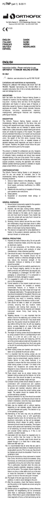 PQ TNP (part 1) B-05/11 ORTHOFIX Srl Via Delle Nazioni 9 - 37012 Bussolengo (Verona) - Italy Telephone 0039-0456719000 - Fax 0039-0456719380 0123 ENGLISH ITALIANO FRANÇAIS DEUTSCH ESPAÑOL DANSK SUOMI NORSK NEDERLANDS ENGLISH Instruction leaflet - Please read prior to use ORTHOFIX® TITANIUM NAILING SYSTEM RX ONLY Attention, see instructions for use PQ TNP, PQ ISP Limitations and restrictions on reprocessing PRODUCTS LABELED FOR SINGLE-USE MUST NOT BE REUSED. Repeated reprocessing has minimal effect on reusable instruments. End of life is normally determined by wear and damage due to use. INDICATIONS Each nail within the Orthofix Titanium Nailing System is intended for insertion into the medullary canal of a specific long bone – humerus, femur and tibia –for the alignment, stabilization and fixation of various types of fractures or deformities caused by trauma or disease (provided that the epiphyses are closed). These include: traumatic fractures, re-fractures, non-union, reconstruction, malunion, malalignment, pathological fractures and impending pathological fractures. DESCRIPTION The Orthofix Titanium Nailing System consists of Intramedullary Nailing Implants for the femur, tibia and humerus with respective end-caps, locking screws, washers, nuts. These implants are not intended to replace normal healthy bone. Loads produced by weight bearing and activity levels will dictate the longevity of the implant. The patient should understand that stress on an implant can be produced without actual weight bearing. In the absence of solid bony union, the weight of the limb alone, muscular forces associated with moving a limb, or repeated stresses of apparent relatively small magnitude, can result in failure of the implant. Therefore, the patient should follow the postoperative instructions given by the surgeon. The product is intended for professional use only. Surgeons who supervise the use of the product must have full awareness of orthopedic fixation procedures and should have received adequate training in the use of the product. Prior to surgery, surgeons should be familiar with the devices, instruments and surgical procedure, including the application and removal. Detailed operative technique guidance is available on request; please contact Orthofix or your local distributor. CONTRAINDICATIONS The Orthofix Titanium Nailing System is not designed or sold for any use except as indicated. Use of the Intramedullary Nailing Implants is contraindicated in the following situations: 1. Active or latent infection in the affected area. 2. General medical conditions including: impaired blood supply, pulmonary insufficiency (i.e. ARDS, fat embolism). 3. Patients who are unwilling or incapable of following post-operative care instructions. 4. Obese patients. 5. Suspected or documented metal allergy or intolerance. GENERAL WARNINGS 1) Ensure that all components needed for the operation are available in the operating theatre. 2) Implants, nail end caps, locking screws, washers, nuts as well as certain parts of the instrumentation (where indicated on the label), are for single use only and must never be reused. If any implant has come into contact with any body fluid it should be considered to have been used. 3) Smoking, chronic steroid use and the use of other anti-inflammatory drugs have been shown to affect bone healing and could potentially have an adverse effect on bone repair during fracture healing. 4) This device is not approved for screw attachment or fixation to the posterior elements (pedicles) of the cervical, thoracic or lumbar spine. GENERAL PRECAUTIONS 1) Implants are made of titanium alloy. Do not use with implants of dissimilar metals, since this may cause an electrolytic reaction. 2) Do not use components of the Orthofix nailing system in conjunction with products of other manufacturers, unless otherwise specified. 3) Care should be used in the handling and storage of the components. The implants should not be scratched, notched or otherwise damaged as these may reduce the functional strength of the component. Contours or bending of an implant should be avoided. 4) All components should be carefully examined prior to use. Product integrity, sterility (in the case of sterile products) and performance are assured only if the packaging is undamaged. DO NOT USE if packaging is compromised or if a component is believed to be faulty, damaged or suspect. 5) It is suggested to verify all the system assembly prior to the implantation. 6) Correct selection of the implant model and size is extremely important. An unstable or severely comminuted fracture, or a fracture in the metaphyseal area, may need a larger and longer nail for adequate stabilization. The appropriate type and size should be selected for the patient. Failure to use the largest possible components or their improper positioning may result in loosening, bending, cracking, or fracture of the device or bone or both. 7) Care should be taken to attach all components correctly, ensuring that any location marks correspond, and locking them securely. It is important to check that the required joint between instrument remain firmly fixed during the procedure. 8) Targeting devices: it is very important that the anterior hole for the stabilizing rod is drilled in the center of the bone, over the nail. If any doubt exists about this, the position should be checked with Xrays before drilling the hole. As with any targeting device, success depends on many factors and cannot be guaranteed in all cases. A free hand technique can be used alternatively. 9) The length of locking screws should be determined by using a proper K-wire in a corresponding K-wire Guide, or a drill bit and a drill stop in a corresponding drill guide, and measuring, with the aid of the correct scale provided with the system, the amount of K-wire protruding from the K-wire guide or the drill bit protruding beyond the drill stop from the drill guide. 10) When locking screws