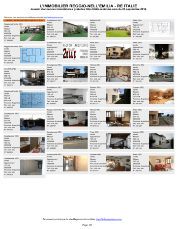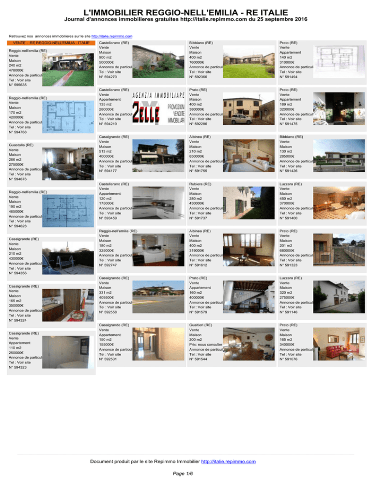 L'IMMOBILIER REGGIO-NELL'EMILIA - RE ITALIE Journal d'annonces immobilieres gratuites http://italie.repimmo.com du 25 septembre 2016 Retrouvez nos annonces immobilières sur le site http://italie.repimmo.com VENTE - RE REGGIO-NELL'EMILIA - ITALIE Reggio-nell'emilia (RE) Vente Maison 240 m2 478000€ Annonce de particulier Tel : Voir site N° 595635 Reggio-nell'emilia (RE) Vente Maison 170 m2 420000€ Annonce de particulier Tel : Voir site N° 594768 Guastalla (RE) Vente Maison 266 m2 275000€ Annonce de particulier Tel : Voir site N° 594676 Reggio-nell'emilia (RE) Vente Maison 190 m2 465000€ Annonce de particulier Tel : Voir site N° 594628 Casalgrande (RE) Vente Maison 210 m2 430000€ Annonce de particulier Tel : Voir site N° 594356 Casalgrande (RE) Vente Maison 165 m2 350000€ Annonce de particulier Tel : Voir site N° 594324 Casalgrande (RE) Vente Appartement 110 m2 250000€ Annonce de particulier Tel : Voir site N° 594323 Castellarano (RE) Vente Maison 900 m2 500000€ Annonce de particulier Tel : Voir site N° 594270 Bibbiano (RE) Vente Maison 400 m2 760000€ Annonce de particulier Tel : Voir site N° 592366 Prato (RE) Vente Appartement 140 m2 310000€ Annonce de particulier Tel : Voir site N° 591494 Castellarano (RE) Vente Appartement 135 m2 280000€ Annonce de particulier Tel : Voir site N° 594219 Prato (RE) Vente Maison 400 m2 380000€ Annonce de particulier Tel : Voir site N° 592286 Prato (RE) Vente Appartement 189 m2 320000€ Annonce de particulier Tel : Voir site N° 591475 Casalgrande (RE) Vente Maison 513 m2 400000€ Annonce de particulier Tel : Voir site N° 594177 Albinea (RE) Vente Maison 210 m2 850000€ Annonce de particulier Tel : Voir site N° 591755 Bibbiano (RE) Vente Maison 130 m2 285000€ Annonce de particulier Tel : Voir site N° 591426 Castellarano (RE) Vente Appartement 120 m2 175000€ Annonce de particulier Tel : Voir site N° 593459 Rubiera (RE) Vente Maison 280 m2 430000€ Annonce de particulier Tel : Voir site N° 591737 Luzzara (RE) Vente Maison 450 m2 370000€ Annonce de particulier Tel : Voir site N° 591400 Reggio-nell'emilia (RE) Vente Maison 180 m2 325000€ Annonce de particulier Tel : Voir site N° 592747 Albinea (RE) Vente Maison 400 m2 319000€ Annonce de particulier Tel : Voir site N° 591612 Prato (RE) Vente Maison 201 m2 680000€ Annonce de particulier Tel : Voir site N° 591323 Casalgrande (RE) Vente Maison 331 m2 409500€ Annonce de particulier Tel : Voir site N° 592558 Prato (RE) Vente Appartement 160 m2 400000€ Annonce de particulier Tel : Voir site N° 591579 Luzzara (RE) Vente Maison 320 m2 275000€ Annonce de particulier Tel : Voir site N° 591146 Casalgrande (RE) Vente Appartement 150 m2 155000€ Annonce de particulier Tel : Voir site N° 592501 Gualtieri (RE) Vente Maison 200 m2 Prix: nous consulter Annonce de particulier Tel : Voir site N° 591544 Prato (RE) Vente Maison 165 m2 340000€ Annonce de particulier Tel : Voir site N° 591076 Document produit par le site Repimmo Immobilier http://italie.repimmo.com Page 1/6 L'IMMOBILIER REGGIO-NELL'EMILIA - RE ITALIE Journal d'annonces immobilieres gratuites http://italie.repimmo.com du 25 septembre 2016 Quattro-castella (RE) Vente Appartement 122 m2 259000€ Annonce de particulier Tel : Voir site N° 590821 Reggio-nell'emilia (RE) Vente Maison 130 m2 300000€ Annonce de particulier Tel : Voir site N° 587424 Reggio-nell'emilia (RE) Vente Maison 250 m2 520000€ Annonce de particulier Tel : Voir site N° 585302 Brescello (RE) Vente Maison 200 m2 295000€ Annonce de particulier Tel : Voir site N° 582090 Luzzara (RE) Vente Maison 300 m2 250000€ Annonce de particulier Tel : Voir site N° 590644 Reggio-nell'emilia (RE) Vente Maison 240 m2 255000€ Annonce de particulier Tel : Voir site N° 587252 Cadelbosco-di-sopra (RE) Vente Maison 300 m2 Prix: nous consulter Annonce de particulier Tel : Voir site N° 585187 Brescello (RE) Vente Maison 330 m2 260000€ Annonce de particulier Tel : Voir site N° 581600 Albinea (RE) Vente Appartement 188 m2 370000€ Annonce de particulier Tel : Voir site N° 589746 Prato (RE) Vente Appartement 100 m2 260000€ Annonce de particulier Tel : Voir site N° 587210 Reggio-nell'emilia (RE) Vente Maison 200 m2 540000€ Annonce de particulier Tel : Voir site N° 585027 Villa-minozzo (RE) Vente Maison 200 m2 260000€ Annonce de particulier Tel : Voir site N° 581565 Albinea (RE) Vente Maison 315 m2 290000€ Annonce de particulier Tel : Voir site N° 589589 Albinea (RE) Vente Maison 470 m2 675000€ Annonce de particulier Tel : Voir site N° 587088 Prato (RE) Vente Appartement 100 m2 280000€ Annonce de particulier Tel : Voir site N° 584793 Vezzano-sul-crostolo (RE) Vente Maison 200 m2 280000€ Annonce de particulier Tel : Voir site N° 581344 Guastalla (RE) Vente Maison 260 m2 250000€ Annonce de particulier Tel : Voir site N° 588888 Prato (RE) Vente Maison 143 m2 340000€ Annonce de particulier Tel : Voir site N° 586917 Albinea (RE) Vente Maison 109 m2 290000€ Annonce de particulier Tel : Voir site N° 584266 Rubiera (RE) Vente Maison 190 m2 250000€ Annonce de particulier Tel : Voir site N° 581244 Guastalla (RE) Vente Maison 250 m2 295000€ Annonce de particulier Tel : Voir site N° 588869 Prato (RE) Vente Maison 330 m2 750000€ Annonce de particulier Tel : Voir site N° 586313 Prato (RE) Vente Maison 110 m2 280000€ Annonce de particulier Tel : Voir site N° 583398 Casalgrande (RE) Vente Appartement 168 m2 300000€ Annonce de particulier Tel : Voir site N° 581123 Albinea (RE) Vente Maison 254 m2 345000€ Annonce de particulier Tel : Voir site N° 587812 Prato (RE) Vente Maison 120 m2 280000€ Annonce de particulier Tel : Voir site N° 585620 Scandiano (RE) Vente Maison 160 m2 345000€ Annonce de particulier Tel : Voir site N° 582440 Casalgrande (RE) Vente Maison 314 m2 270000€ Annonce de particulier Tel : Voir site N° 581069 Document produit par le site Repimmo Immobilier http://italie.repimmo.com Page 2