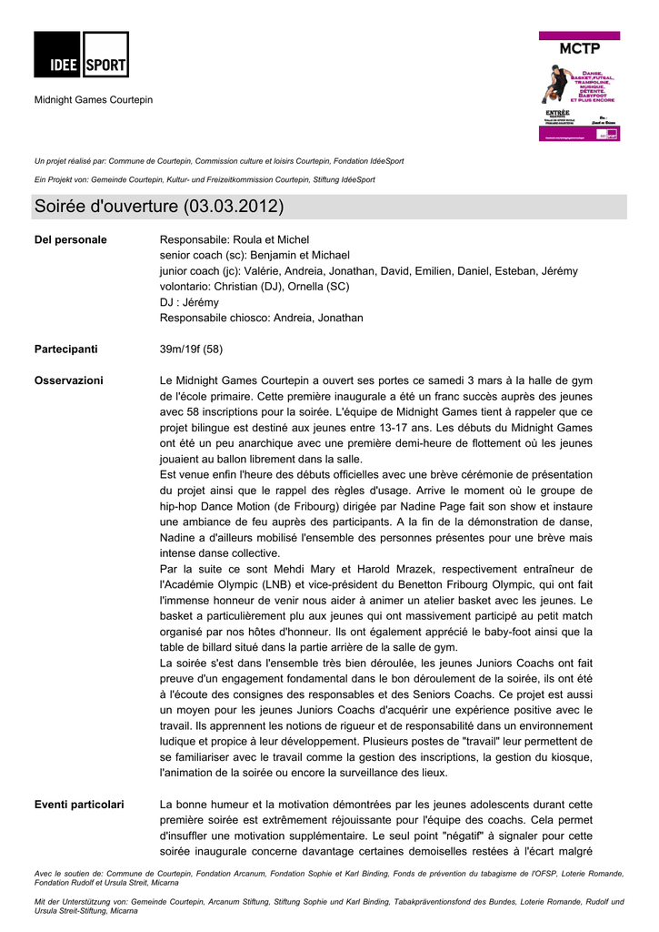 Midnight Games Courtepin Un projet réalisé par: Commune de Courtepin, Commission culture et loisirs Courtepin, Fondation IdéeSport Ein Projekt von: Gemeinde Courtepin, Kultur- und Freizeitkommission Courtepin, Stiftung IdéeSport Soirée d'ouverture (03.03.2012) Del personale Responsabile: Roula et Michel senior coach (sc): Benjamin et Michael junior coach (jc): Valérie, Andreia, Jonathan, David, Emilien, Daniel, Esteban, Jérémy volontario: Christian (DJ), Ornella (SC) DJ : Jérémy Responsabile chiosco: Andreia, Jonathan Partecipanti 39m/19f (58) Osservazioni Le Midnight Games Courtepin a ouvert ses portes ce samedi 3 mars à la halle de gym de l'école primaire. Cette première inaugurale a été un franc succès auprès des jeunes avec 58 inscriptions pour la soirée. L'équipe de Midnight Games tient à rappeler que ce projet bilingue est destiné aux jeunes entre 13-17 ans. Les débuts du Midnight Games ont été un peu anarchique avec une première demi-heure de flottement où les jeunes jouaient au ballon librement dans la salle. Est venue enfin l'heure des débuts officielles avec une brève cérémonie de présentation du projet ainsi que le rappel des règles d'usage. Arrive le moment où le groupe de hip-hop Dance Motion (de Fribourg) dirigée par Nadine Page fait son show et instaure une ambiance de feu auprès des participants. A la fin de la démonstration de danse, Nadine a d'ailleurs mobilisé l'ensemble des personnes présentes pour une brève mais intense danse collective. Par la suite ce sont Mehdi Mary et Harold Mrazek, respectivement entraîneur de l'Académie Olympic (LNB) et vice-président du Benetton Fribourg Olympic, qui ont fait l'immense honneur de venir nous aider à animer un atelier basket avec les jeunes. Le basket a particulièrement plu aux jeunes qui ont massivement participé au petit match organisé par nos hôtes d'honneur. Ils ont également apprécié le baby-foot ainsi que la table de billard situé dans la partie arrière de la salle de gym. La soirée s'est dans l'ensemble très bien déroulée, les jeunes Juniors Coachs ont fait preuve d'un engagement fondamental dans le bon déroulement de la soirée, ils ont été à l'écoute des consignes des responsables et des Seniors Coachs. Ce projet est aussi un moyen pour les jeunes Juniors Coachs d'acquérir une expérience positive avec le travail. Ils apprennent les notions de rigueur et de responsabilité dans un environnement ludique et propice à leur développement. Plusieurs postes de "travail" leur permettent de se familiariser avec le travail comme la gestion des inscriptions, la gestion du kiosque, l'animation de la soirée ou encore la surveillance des lieux. Eventi particolari La bonne humeur et la motivation démontrées par les jeunes adolescents durant cette première soirée est extrêmement réjouissante pour l'équipe des coachs. Cela permet d'insuffler une motivation supplémentaire. Le seul point "négatif" à signaler pour cette soirée inaugurale concerne davantage certaines demoiselles restées à l'écart malgré Avec le soutien de: Commune de Courtepin, Fondation Arcanum, Fondation Sophie et Karl Binding, Fonds de prévention du tabagisme de l'OFSP, Loterie Romande, Fondation Rudolf et Ursula Streit, Micarna Mit der Unterstützung von: Gemeinde Courtepin, Arcanum Stiftung, Stiftung Sophie und Karl Binding, Tabakpräventionsfond des Bundes, Loterie Romande, Rudolf und Ursula Streit-Stiftung, Micarna l'intervention de notre équipe pour les motiver. La clôture de la soirée s'est bien déroulée ainsi que le nettoyage. Un contact téléphonique avec le concierge ce lundi matin (5 mars) a confirmé que l'état de propreté de la salle était impeccable. C'est encourageant pour la suite. Organizzazione Il y avait deux co-responsables présents pour cette soirée: Roula et Michel. L'équipe a été composée de deux Seniors Coachs: Benjamin et Michaël ainsi que de 8 Juniors Coachs: Daniel, Jonathan, Valérie, Andreia, David, Emilien, Esteban et Jérémy qui a officié durant la soirée comme DJ. Nous avons pu recueillir l'aide de deux bénévoles: Christian, DJ et Ornella, Senior Coach, qui est venu apporter un coup de main. C'est aussi l'occasion de remercier chaleureusement le concierge de l'école primaire, M. Daniel Peruzzi, qui s'est beaucoup investi dans l'aventure. Sans oublier évidemment le comité d'organisation sans qui le projet n'aurait pas vu le jour. Nous remercions donc le dicastère de culture, loisir et jeunesse de la commune de Courtepin ainsi que toutes les personnes qui ont participé à l'élaboration de ce projet ! Temi discussi Durant le bilan de fin de soirée de notre équipe nous avons pu discuter du déroulement de cette première inaugurale et échanger nos impressions en vue d'améliorer la gestion des soirées à venir. L'équipe s'est penchée sur la stratégie à adopter en vue d'améliorer l'implication et l'intégration des jeunes filles dans les activités. Nous avons également évoqué la possibilité d'établir un programme sur les différentes activités de chaque soirées et de publier le planning sur internet (Facebook). Nous vous rappelons par la même occasion qu'il est possible de s'inscrire sur notre page Facebook (si vous possédez un compte ouvert Facebook), Midnight Games Courtepin, pour être tenu au courant des informations et d'interagir avec nous ! Nous avons également un service sms gratuit qui envoie les informations chaque vendredi après-midi pour la soirée du samedi. Il vous suffit d'envoyer "start MCTP" au 723 ! Roula et Michel, responsables de projet