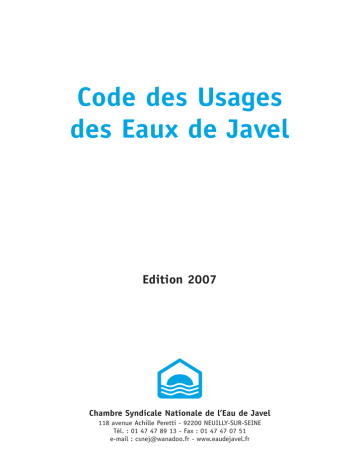 Code des Usages des Eaux de Javel Edition 2007 Chambre Syndicale Nationale de l’Eau de Javel 118 avenue Achille Peretti - 92200 NEUILLY-SUR-SEINE Tél. : 01 47 47 89 13 - Fax : 01 47 47 07 51 e-mail : [email protected] - www.eaudejavel.fr La Chambre Syndicale Nationale de l’Eau de Javel (CSNEJ) La CSNEJ regroupe : ■ les Javeliers, c’est-à-dire les fabricants d’Eau de Javel à destination : • du Grand Public • des Professionnels : hôpitaux, collectivités – crèches, maisons de retraite, écoles - restauration collective, piscines… ■ les Chloriers, c’est-à-dire les fabricants d’hypochlorite de sodium, matière première de base de l’Eau de Javel. La CSNEJ : ■ assure la représentation de ses adhérents et la promotion de leurs intérêts professionnels ■ participe au développement de l’image de l’Eau de Javel en particulier comme produit d’hygiène publique et d’hygiène préventive par le biais de présentations lors de colloques, séminaires … ■ agit pour promouvoir les meilleures utilisations de l’Eau de Javel par la mise à disposition d’affichettes, de brochures et de conseils téléphoniques … CSNEJ - Code des Usages des Eaux de Javel - 02/07 1/17 Table des matières Introduction ........................................................................ 3 1 - Champ d’application ........................................................................ 3 2 - Réglementation applicable ........................................................................ 4 3 - Spécificités des produits ........................................................................ 4 ........................................................................ 5 ........................................................................ 6 Présentation du Code Objectifs et portée du Code 3.1 - Instabilité 3.2 - Rétrogradation 3.3 - Entreposage et conservation 4 - Emballage et étiquetage 4.1 - L’Eau de Javel 4.2 - Le Concentré de Javel 5 - Contrôle 5.1 - Contrôle de la teneur en principe actif 5.2 - Contrôle de la teneur en soude libre dans les Eaux et Concentrés de Javel 6 - Informations sur les produits ........................................................................ 7 7 - Entrée en vigueur ........................................................................ 7 Annexes ........................................................................ 8 6.1 - Fiches de données de sécurité (FDS) 6.2 - Déclarations aux centres antipoison Annexe I - Réglementation Annexe II - Méthode de contrôle de la teneur en chlore actif et de la densité Annexe III - Méthodes de dosage de l’alcalinité 1 - Dosage de l’alcalinité libre et totale par méthode volumétrique 2 - Dosage de l’alcalinité libre et totale par méthode potentiométrique CSNEJ - Code des Usages des Eaux de Javel - 02/07 2/17 Introduction Présentation du Code Dans un souci de garantir la qualité et la sécurité des Eaux de Javel commercialisées en France, les professionnels de l’Eau de Javel regroupés au sein de la Chambre Syndicale Nationale de l’Eau de Javel (CSNEJ) sont convenus de consigner dans le présent Code, qui annule et remplace celui édité en septembre 1994 les dispositions auxquelles ils entendent se référer. Ce Code recense les usages de la profession et tient lieu de référentiel pour les professionnels de l’Eau de Javel dans leurs relations avec les autorités, les organismes de contrôle, la distribution et les consommateurs. Objectifs et portée du Code Ce Code est conçu pour : ■ aider les professionnels de l’Eau de Javel à assurer la qualité et la sécurité des produits notamment par : • une classification adéquate des produits • le contrôle de la qualité globale des produits • le contrôle de la teneur en chlore actif • le contrôle de la “teneur en soude libre” ■ assurer une information optimale des consommateurs par l’harmonisation de l’étiquetage. Ce Code ne se substitue pas aux réglementations et normes en vigueur. Il est de la responsabilité des professionnels de s’y référer et de veiller à leur respect. Ce Code se veut être l’outil privilégié des professionnels de l’Eau de Javel pour l’observation de règles claires, précises et loyales, relatives à leurs produits. Il est de l’intérêt général, comme de l’intérêt de la profession, que les principes énoncés dans ce Code soient appliqués par tous les professionnels de l’Eau de Javel. Pour atteindre cet objectif, ce Code a été approuvé en Conseil d’Administration puis en Assemblée Générale des Adhérents de la CSNEJ, qui s’engagent ainsi à le respecter et à le transmettre à leurs partenaires. 1 - Champ d’application Ce Code s’applique aux Eaux et Concentrés de Javel traditionnels et parfumés tels que définis dans le décret n° 2001-881 du 25 septembre 2001 (ci-après “Décret Javel“). Ces produits sont commercialisés en France auprès du grand public et des professionnels principalement sous les deux concentrations suivantes : ■ l’Eau de Javel (2,6 % de chlore actif) présentée sous différents formats, majoritairement en flacons de 1 ou 2 litres et en jerricans de 5 litres. ■ le Concentré de Javel (9,6 % de chlore actif) à diluer présenté : • en doses recharges de 250 ml pour le grand public. • en doses recharges, jerricans et cubitainers pour les utilisateurs professionnels. La teneur en hypochlorite de sodium est exprimée en pourcentage, poids pour poids de chlore actif en accord avec les réglementations européennes et françaises. Les règles et méthodes décrites dans le présent Code sont définies par référence à ces deux concentrations qui sont les plus présentes sur le marché français. Ces méthodes doivent, le cas échéant, être adaptées pour les produits vendus sous d’autres concentrations conformes au Décret Javel. CSNEJ - Code des Usages des Eaux de Javel - 02