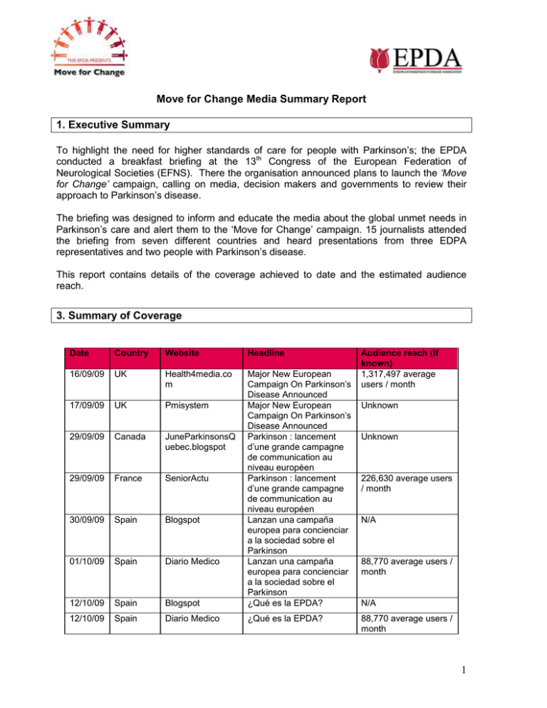 Move for Change Media Summary Report 1. Executive Summary To highlight the need for higher standards of care for people with Parkinson‟s; the EPDA conducted a breakfast briefing at the 13th Congress of the European Federation of Neurological Societies (EFNS). There the organisation announced plans to launch the ‘Move for Change’ campaign, calling on media, decision makers and governments to review their approach to Parkinson‟s disease. The briefing was designed to inform and educate the media about the global unmet needs in Parkinson‟s care and alert them to the „Move for Change‟ campaign. 15 journalists attended the briefing from seven different countries and heard presentations from three EDPA representatives and two people with Parkinson‟s disease. This report contains details of the coverage achieved to date and the estimated audience reach. 3. Summary of Coverage Date Country Website Headline 16/09/09 UK Health4media.co m 17/09/09 UK Pmisystem 29/09/09 Canada JuneParkinsonsQ uebec.blogspot 29/09/09 France SeniorActu 30/09/09 Spain Blogspot 01/10/09 Spain Diario Medico 12/10/09 Spain Blogspot Major New European Campaign On Parkinson‟s Disease Announced Major New European Campaign On Parkinson‟s Disease Announced Parkinson : lancement d‟une grande campagne de communication au niveau européen Parkinson : lancement d‟une grande campagne de communication au niveau européen Lanzan una campaña europea para concienciar a la sociedad sobre el Parkinson Lanzan una campaña europea para concienciar a la sociedad sobre el Parkinson ¿Qué es la EPDA? 12/10/09 Spain Diario Medico ¿Qué es la EPDA? Audience reach (if known) 1,317,497 average users / month Unknown Unknown 226,630 average users / month N/A 88,770 average users / month N/A 88,770 average users / month 1 29/10/09 UK PharmaTimes Call to improve treatment for Parkinson's disease patients Early treatment needed for Parkinson‟s disease Move for Change – European campaign to tackle ignorance of Parkinson‟s 393,154 average users / month Oct 09 UK Nov 09 UK Geriatric Medicine (GM) London Student Journal of Medicine Nov / Dec UK Progress in Neurology and Psychiatry Parkinson‟s disease – challenging misconceptions 18,000 monthly circulation 11/12/09 France Care Vox Parkinson : sensibiliser les pays européens 455,096 average users / month 11/12/09 France Cap Retraite Parkinson : sensibiliser les pays européens 321,664 average users / month 11/12/09 France Cozop Parkinson : sensibiliser les pays européens Unknown Dec 09 France Générations Nouvelle champagne d‟information et de sensibilisation sur la maladie de Parkinson Unknown 20/01/10 France Age Village Maladie de Parkinson Lancement d'une campagne de sensibilsation au niveau européen Unknown 25,000 monthly circulation Unknown Minimum total reach: 2,934,581 In addition to the above, further coverage is also confirmed in: Dialogue & Sante (consumer publication), Belgium, April 2010 ACNR (medical publication), UK, Spring 2010 2 4. Full Coverage Publication Date Traffic Country health4media.com 16/09/09 Avg users/month 1,317,497 UK http://www.health4media.com/uk/pressrelease.php?id=6012&mo=3&referencekey=8ac7be542664ee8bd89d974e4f a75fe0 Major New European Campaign On Parkinson’s Disease Announced National and European Parliaments, neurological specialists and members of the general public throughout Europe will be targeted in a major new action campaign spearheaded by the European Parkinson‟s Disease Association (EPDA); which represents the interests of more than a million people with Parkinson‟s disease. Recent research into Parkinson‟s care in Italy has highlighted failings in the early diagnosis, access to specialist care and knowledge of the condition among the medical profession.1 The EPDA is concerned that these issues may not be confined just to Italy and that millions of Euros every year may be wasted by governments failing to provide proper treatment for those people affected by Parkinson‟s. The EPDA is now initiating more detailed investigations within other EU countries to establish the extent of the problem across Europe. According to Professor Fabrizio Stocchi, Director of the Parkinson‟s Disease and Movement Disorders Research Centre at the IRCCS San Raffaele, Rome, “The medical profession could do more for people with Parkinson‟s. Current gaps in understanding about management and treatment are leading to failures in both diagnosis and care. Even when there is a correct diagnosis in place the tendency is often to delay treatment for as long as possible. 3 This practice is not only negatively impacting patients‟ lives but also wasting taxpayers‟ money. Early Parkinson‟s intervention may slow disease progression, improve the quality of patients‟ lives and is also associated with significant direct and indirect cost savings.” In the Netherlands, where action is being taken, people with Parkinson‟s have experienced significant improvements in care. The Netherlands‟ ParkinsonNet regional programme has led to patients receiving earlier diagnoses, improved multidisciplinary care and early access to treatments that can slow symptom progression. Consequently, the human costs of this devastating disease have been reduced, coupled with the government reportedly saving an estimated €42 million directly because of the programme. EPDA patron, Mary G Baker MBE, commented, “Parkinson‟s is a costly disease. It‟s been 12 years since the World Health Organization initiated the EPDA‟s Charter in Parkinson‟s, yet Parkinson‟s care is still substandard in many countries. In an ageing population, the human and economic impact of this terrible disease will continue to rise if not addressed.” This warning came during a presentation today by the EPDA at the 13th Congress of the European Federation of Neurological Societies (EFNS), where the organisation announced plans to launch a major new campaign calling on Europ
