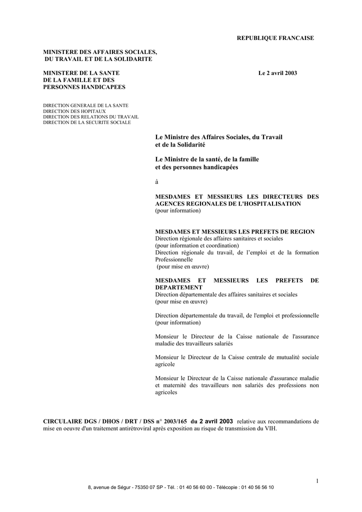 REPUBLIQUE FRANCAISE MINISTERE DES AFFAIRES SOCIALES, DU TRAVAIL ET DE LA SOLIDARITE MINISTERE DE LA SANTE DE LA FAMILLE ET DES PERSONNES HANDICAPEES Le 2 avril 2003 DIRECTION GENERALE DE LA SANTE DIRECTION DES HOPITAUX DIRECTION DES RELATIONS DU TRAVAIL DIRECTION DE LA SECURITE SOCIALE Le Ministre des Affaires Sociales, du Travail et de la Solidarité Le Ministre de la santé, de la famille et des personnes handicapées à MESDAMES ET MESSIEURS LES DIRECTEURS DES AGENCES REGIONALES DE L'HOSPITALISATION (pour information) MESDAMES ET MESSIEURS LES PREFETS DE REGION Direction régionale des affaires sanitaires et sociales (pour information et coordination) Direction régionale du travail, de l’emploi et de la formation Professionnelle (pour mise en œuvre) MESDAMES ET MESSIEURS LES PREFETS DEPARTEMENT Direction départementale des affaires sanitaires et sociales (pour mise en œuvre) DE Direction départementale du travail, de l'emploi et professionnelle (pour information) Monsieur le Directeur de la Caisse nationale de l'assurance maladie des travailleurs salariés Monsieur le Directeur de la Caisse centrale de mutualité sociale agricole Monsieur le Directeur de la Caisse nationale d'assurance maladie et maternité des travailleurs non salariés des professions non agricoles CIRCULAIRE DGS / DHOS / DRT / DSS n° 2003/165 du 2 avril 2003 relative aux recommandations de mise en oeuvre d'un traitement antirétroviral après exposition au risque de transmission du VIH. 1 8, avenue de Ségur - 75350 07 SP - Tél. : 01 40 56 60 00 - Télécopie : 01 40 56 56 10 Résumé : Le traitement antirétroviral après exposition, ou traitement post exposition (TPE) étendu en 1998 à tous les types d'exposition a fait l'objet d'une évaluation qui conduit à proposer de nouvelles recommandations en matière de traitement. Le dispositif local d'accueil, d'orientation et de prise en charge doit être adapté afin d'améliorer son accessibilité, permettre une meilleure évaluation des risques encourus et, si nécessaire une prescription adaptée . Mots clés : Conduite à tenir après exposition au risque de transmission du VIH - recommandations organisation - évaluation. Textes de référence : - Prise en charge des personnes infectées par le VIH, recommandations du groupe d'experts sous la direction du Pr J.F. Delfraissy : rapport 2002 Rapport du CNS 12 octobre 2000 Plan national de lutte contre le sida 2001-2004 Rapport d'expertise de l'AFSSAPS du 17 octobre 2002 BEH n°36/2002: évaluation de la prise en charge thérapeutique des expositions au VIH, juillet 1999-décembre 2001 Loi n°2002-303 du 4 mars 2002 Circulaire DGS/VS2/DH/DRT n°99/680 du 8 décembre 1999 relatives aux recommandations à mettre en œuvre devant un risque de transmission du VHB et du VHC par le sang et les liquides biologiques Textes abrogés : - circulaire DGS/DH/DRT/DSS n°98/228 du 9 avril 1998 relative aux recommandations mises en œuvre d'un traitement antirétroviral après exposition au risque de transmission du VIH. Des données nouvelles permettent d’actualiser les indications du traitement antirétroviral après exposition au risque de transmission du VIH, ou traitement post exposition (TPE) et le mode de prise en charge de ces accidents. Ce sont : - l'évolution des stratégies thérapeutiques chez les patients séropositifs - l’évaluation nationale réalisée par l’InVS depuis juillet 1999 - les recommandations du groupe de travail de l’AFSSAPS saisi le 6 août 2001 par la DGS et dont la version finale a été approuvée par la commission d’AMM de l’AFSSAPS le 17 octobre 2002. Ces recommandations confirment l'intérêt d'un traitement prophylactique lors d'une exposition au VIH. Elles en précisent les indications selon le risque encouru et les modalités thérapeutiques. La présente circulaire a pour objet de faire connaître d'une part ces nouvelles recommandations thérapeutiques et d’autre part de préciser les modalités d’organisation du dispositif. Les objectifs recherchés sont : 1- de mieux déterminer les indications du traitement, 2- de prévenir par un meilleur choix des médicaments la survenue d’effets indésirables graves, 3 - d'améliorer le dispositif de prise en charge des accidents d’exposition pour toute personne en relevant, 4 - de mettre à profit la prise en charge instituée à cette occasion pour rétablir ou renforcer les conduites préventives. Il appartient aux services déconcentrés, pour permettre la réalisation de ces objectifs : - d'assurer l'adaptation du dispositif local d’accueil et de prise en charge aux besoins en lien avec les différents partenaires, 2 8, avenue de Ségur - 75350 07 SP - Tél. : 01 40 56 60 00 - Télécopie : 01 40 56 56 10 - d’informer les professionnels de santé et le public sur l’existence et le fonctionnement du dispositif, - de contrôler régulièrement la bonne marche du dispositif. I - LES MODALITES THERAPEUTIQUES D'EVALUATION DU RISQUE ET LES RECOMMANDATIONS L'avis favorable rendu par la commission de l'AMM de l'AFSSAPS quant à l’utilisation d’antirétroviraux après exposition à un risque d’infection par le VIH est assorti de nouvelles recommandations concernant la mise en œuvre d'un traitement antirétroviral et sa délivrance après un accident d'exposition qui tiennent compte des données de l'évaluation menée par l'InVS sur ce sujet. Ces recommandations en terme de prise en charge des accidents d’exposition au VIH, s’adressent aux médecins spécialistes et non spécialistes de l’infection par le VIH confrontés en urgence à une demande de conseils et de soins après risque d’exposition accidentelle au VIH. Elles doivent être relayées par les CISIH, les services référents dans la prise en charge de l’infection par le VIH et les Commissions du Médicament et des Dispositifs Médicaux Stériles (COMEDIMS) de chaque structure hospitalière en partenariat avec la médecine du travail et le C