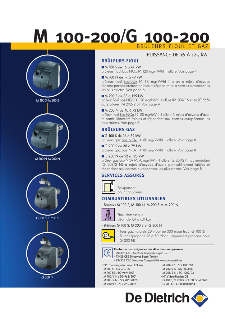 M 100-200/G 100-200 BRÛLEURS FIOUL ET GAZ PUISSANCE DE 16 À 125 kW BRÛLEURS FIOUL ■ M 100 S de 16 à 47 kW brûleurs fioul bas NOx (< 120 mg/kWh) 1 allure. Voir page 4. ■ M 100 N de 17 à 49 kW brûleurs fioul EcoNOx (< 110 mg/kWh) 1 allure à rejets d’oxydes d’azote particulièrement faibles et répondant aux normes européennes les plus strictes. Voir page 6. M 100 S-M 200 S ■ M 200 S de 38 à 125 kW brûleur fioul bas NOx (< 120 mg/kWh) 1 allure (M 200/1 S et M 201/2 S) ou 2 allures (M 202/2 S). Voir page 4. ■ M 200 N de 40 à 73 kW brûleur fioul Eco NOx (< 110 mg/kWh) 1 allure à rejets d’oxydes d’azote particulièrement faibles et répondant aux normes européennes les plus strictes. Voir page 6. BRÛLEURS GAZ ■ G 100 S de 16 à 52 kW brûleurs gaz bas NOx (< 80 mg/kWh) 1 allure. Voir page 8. ■ G 200 S de 38 à 79 kW brûleurs gaz bas NOx (< 80 mg/kWh) 1 allure. Voir page 8. M 100 N-M 200 N ■ G 200 N de 52 à 123 kW brûleur gaz Eco NOx (< 70 mg/kWh) 1 allure (G 201/2 N) ou modulant (G 203/2 N) à rejets d’oxydes d’azote particulièrement faibles et répondant aux normes européennes les plus strictes. Voir page 8. SERVICES ASSURÉS Equipement pour chaudières COMBUSTIBLES UTILISABLES - Brûleurs M 100 S, M 100 N, M 200 S et M 200 N G 100 S-G 200 S Fioul domestique débit de 1,4 à 6,0 kg/h - Brûleurs G 100 S, G 200 S et G 200 N - Tous gaz naturels 20 mbar ou 300 mbar (sauf G 100 S) - Butane/propane 28 à 50 mbar (uniquement propane pour G 200 N) Conforme aux exigences des directives européennes - 90/396 CEE Directives Appareils à gaz (G…) - 73/23 CEE Directives Basse Tension - 89/336 CEE Directives Compatibilité électromagnétique G 200 N • N° d’homologation selon EN 267 M 100 S : 5G 970/05 M 100 RS : 5G 969/2001 M 100/1 N : 5G 968/2001 M 100/2 N : 5G 986/2002 M 200/1 S : 5G 990/2002 M 201/2 S : 5G 1003/03 M 202/2 S : 5G 1004/03 M 201/2 N : 5G 1002/03 • N° d’identification CE G 100 S, G 200 S : CE 0085BM0348 G 200 N : CE 0085BP0154 PRÉSENTATION DE LA GAMME Les brûleurs fioul ou gaz des gammes M 100, M 200 et G 100, G 200 sont des brûleurs 1 allure, 2 allures ou modulant de petite puissance particulièrement compacts et silencieux, conçus pour obtenir de hauts rendements et une grande qualité de combustion. Ils sont prévus pour l’utilisation sur toute chaudière quelque soit sa marque, mais bénéficient d’un équipement parfaitement adapté aux chaudières De Dietrich de la gamme GT 120, GT 220 et Premys. LEURS POINTS FORTS • Aéraulique puissante DUO-PRESS® assurant : - un meilleur comporteemnt au démarrage en permettant de vaincre de fortes contre pressions au foyer et une stabilisation rapide de la flamme - une combustion propre grâce à des pressions d’air élevées - une grande stabilité de combustion dans le temps. PRINCIPE DU SYSTEME DUO-PRESS® Le ventilateur aspire l’air pour le refouler sous pression dans la tête de combustion. L’air comburant est aspiré dans la chambre 1 séparée de la chambre 2 par le déflecteur 3. La pression statique dans la chambre 1 étant très élevée, l’air entraîné par la turbine prend une force importante qui lui permettra de vaincre la contre pression du foyer de la chaudière. La partie de cet air qui n’acquiert par une énergie suffisante, est ramenée dans la turbine grâce à la zone dépressionnaire qui se crée dans la chambre 2. L’air ainsi réinjecté est à nouveau accéléré par la turbine, et entraîné vers la tête de combustion. Avantages Le système DUO-PRESS® permet d’atteindre des niveaux de pression très élevés pour des flux d’air faibles et ainsi de vaincre facilement les contre-pressions élevées à chaque démarrage du brûleur. En outre ce système de ventilation est peu sensible aux variations atmosphériques en fournissant d’excellentes performances même en altitude. Pression au ventilateur mbar 20 15 Système DUOPRESS ® 2 10 3 1 5 Ventilateur conventionnel 0 0 8802F080 2 20 40 60 80 100 Débit d'air m 3 /h 8802F023 PRÉSENTATION DE LA GAMME (SUITE) LEURS POINTS FORTS (SUITE) • Une grande qualité de combustion grâce à : - une plage de fonctionnement très large - de faibles émissions d’oxydes d’azote : M 100 S, M 200 S : NOx < 120 mg/kWh M 100 N, M 200 N : NOx < 110 mg/kWh G 100 S, G 200 S : NOx < 80 mg/kWh G 200 N : NOx < 70 mg/kWh par une géométrie de tête adaptée • Faible niveau sonore grâce : - à la conception du caisson d’air associé à un guidage de l’air à l’entrée du tube de flamme - à la présence d’un joint silicone de découplage acoustique au niveau de la platine porte composants - à une volute en fonte d’aluminium de forte épaisseur L’ensemble permet d’obtenir un confort acoustique unique avec un niveau sonore inférieur de 3 à 5 dB(A) par rapport aux autres brûleurs du marché. 8802Q029 • Mise en œuvre et maintenance facilitées : Poignée de manutention Ligne gicleur Platine en position horizontale de service Clé livrée Joint silicone de découplage acoustique Pied support 8802Q027 - poignée de manutention - 2 pieds support permettant de le poser pa terre - clé unique logée à l’arrière du brûleur et permettant toutes les opération de réglage et d’entretien : volet d’air, tête de combustion, pompe fioul pour M 100 S et M 200 S, pression gaz pour G 100 S et G 200 S - position de maintenance obtenue de façon rapide grâce 8802Q026 aux 4 vis de verrouillage rapide de la platine porte-composants ou aux pattes de maintien de la platine sur les vis de positionnement de la volute - raccordement par prise pré-câblée au standard européen - test et préréglage à chaud de chaque brûleur en usine - facilité de réglage du volet d’air et de la tête de combustion pour une adaptation optimale à chaque installation. 3 BRÛLEURS FIOUL M 100 S, M 200 S TABLEAU DES CARACTÉRISTIQUES TECHNIQUES Modèle M 100 RS* m 100/1 S M 100/2 S M 200/1 S M 201/2 S M 202/2 