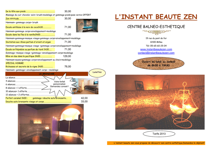 De la tête aux pieds……………………………………………………….. 30,00 30,00 L'INSTANT BEAUTE ZEN 71,00 CENTRE BALNEO-ESTHETIQUE Massage du cuir chevelu+ soin+ brush+modelage et gommage pieds:pose vernis OFFERT Zen Attitude………………………………………………………………………… Hammam+ gommage corps+ brush Escale antillaise à la noix de coco1h30……………… Hammam+gommage corps+enveloppement+modelage Escale dans les îles à la vanille2h00……………………………………………..71,00 Hammam+gommage+masque visage+gommage corps+enveloppement+modelage Invitation aux rêves parfum d'orient et argan 19 rue du pont de fer 12100 Millau 71,00 Hammam+gommage+masque visage +gommage corps+enveloppement+modelage Escale en Polynésie au parfum de tiaré 1h30…… Tèl: 05-65-60-25-04 71,00 www.instantbeautezen.com [email protected] Gommage +masque visage +gommage +enveloppement corps+modelage Rêve en duo dans le pacifique 2h00……………………. 129,00 Hammam+sauna+gommage corps+enveloppement au choix+modelage Ouvert du lundi au samedi de 8h30 à 19h30 SPECIAL HOMME Richesses et secrets de la vigne 2h00………………… 76,00 Hammam+ gommage+ enveloppement corps + modelage Lunettes LE BRONZAGE La séance………………………………………………………………………………. 4 séances………………………………………………………………………………. Votre forfait personnalisé: 6 séances……………………………………………………………………………… Demandez conseil ! 8 séances + 1 offerte…………………………………………………….. 10 séances+ 1 offerte……………………………………………………. 12 séances + 2 offertes……………………………………………….. Forfait caramel 1h00 : gommage +douche auto-bronzante… Douche auto bronzante visage et corps…………………………………………………. 42,00 33,00 Tarifs 2013 L'instant beaute zen vous propose de découvrir son centre esthétique.Demandez le dépliant! SOINS DU CORPS A LA CARTE: NOS FORFAITS: La séance de hammam……………………………………………………. INSTANT DOUCEUR……………………………………………………. 12,00 Pièce de vapeur chaude et humide. 22,00 Hammam + gommage La séance de sauna………………………………………………………….. Forfait ZEN 1h15……………………………………………………………… 10,00 Pièce très chaude.Chaleur sèche. 26,00 Hammam+sauna+gommage savon noir Forfait hammam+sauna…………………………………………………. Forfait Détente 1H30…………………………………………………….. 16,00 12,00 Gommage au savon noir……………………………………………….. 49,00 Hammam+sauna+gommage savon noir+modelage 20min Elimine les cellules mortes. Forfait oriental 1H45………………………………………………………….. Gommage au sel + huile…………………………………………………. 62,00 Hammam+sauna+gommage savon noir+enveloppement rassoul+ 15,00 Hydrate et affine le grain de peau. modelage du corps 20 min Gommage soyeux et massant à la mangue 20' Pause Zen 1H00 aux huiles essentielles et beurre de karité 27,00 18,00 Enveloppement rassoul…………………………………………………. augmentation de l’hydratation Purifie et hydrate la peau. 55,00 55,00 Forfait Aqua zen 1h30………………………………………………………. Enveloppement boues chaudes………………………………… Hammam+sauna+gommage+baignoire balnéo 23,00 Elimine les tensions musculaires. Forfait forme et beauté1h30………………………………………….. Séance baignoire Balnéo…………………………………………… 58,00 Hammam+sauna+soin du visage 38,00 Bain hydromassant. Plongez dans un état d'harmonie avec la Forfait de la sultane ou du sultan 2H00……………… chromothérapie (Défilé de couleurs). Hammam+sauna+gommage au sel+enveloppement Modelage aux huiles essentielles : 69,00 boues chaudes+ modelage 30min. 20min Formule privilège 2h30 28,00 38,00 48,00 59,00 30min 45min 60min 99,00 Hammam+sauna+enveloppement rassoul+modelage 20min+ soin du visage. Formule grand luxe 3h30……………………………………………… 135,00 Hammam+sauna+gommage+enveloppement+modelage 20min+ Modelage aux pierres chaudes………………………………… Réflexologie plantaire 45 min ………………………………. Forfait jambes lourdes (6séances)…………………………. Technispa (la séance) 3 actions minceur…………… 63,00 45,00 190,00 40,00 un soin du visage +beauté des pieds. Forfait évasion caraîbes 2h30………………………………. 119,00 Hammam+sauna+gommage+enveloppement+balnéo séance30' "Attaquer" la cellulite où elle se trouve avec la Double Dermo-Lipo-Aspiration modelage du corps 30 min. Forfait Prestige 4h…………………………………………………………… 149,00 Formule grang luxe+ un Shampoing +brushing POUR TOUS FORFAITS NOUS CONSULTER dans notre nouvel espace coiffure :l'Hair Chic ESCALES AUX SENTEURS MULTIPLES Soin du dos 45 min………………………………………………………….. 38,00 Gommage, enveloppement et modelage Escales équatoriale au cacao 1h30……………………….. 71,00 visage: gommage+masque Soin buste(gommage,modelage,masque)30 min.. 40,00 corps:exfoliant+enveloppement à la mousse pétillante de cacao modelage au cacao Les boissons vous seront offertes sur les banquettes chauffantes.