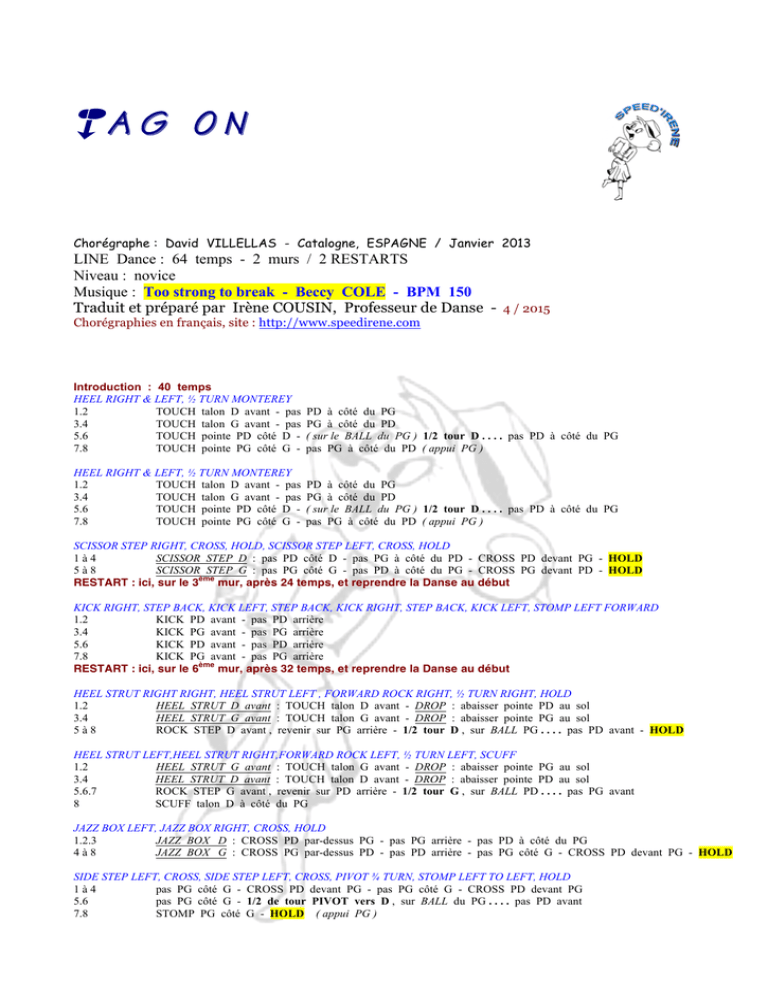 TA G O N Chorégraphe : David VILLELLAS - Catalogne, ESPAGNE / Janvier 2013 LINE Dance : 64 temps - 2 murs / 2 RESTARTS Niveau : novice Musique : Too strong to break - Beccy COLE - BPM 150 Traduit et préparé par Irène COUSIN, Professeur de Danse - 4 / 2015 Chorégraphies en français, site : http://www.speedirene.com Introduction : 40 temps HEEL RIGHT & LEFT, ½ TURN MONTEREY 1.2 TOUCH talon D avant - pas 3.4 TOUCH talon G avant - pas 5.6 TOUCH pointe PD côté D 7.8 TOUCH pointe PG côté G - PD à côté du PG PG à côté du PD ( sur le BALL du PG ) 1/2 tour D . . . . pas PD à côté du PG pas PG à côté du PD ( appui PG ) HEEL RIGHT & LEFT, ½ TURN MONTEREY 1.2 TOUCH talon D avant - pas 3.4 TOUCH talon G avant - pas 5.6 TOUCH pointe PD côté D 7.8 TOUCH pointe PG côté G - PD à côté du PG PG à côté du PD ( sur le BALL du PG ) 1/2 tour D . . . . pas PD à côté du PG pas PG à côté du PD ( appui PG ) SCISSOR STEP RIGHT, CROSS, HOLD, SCISSOR STEP LEFT, CROSS, HOLD 1à4 SCISSOR STEP D : pas PD côté D - pas PG à côté du PD - CROSS PD devant PG - HOLD 5à8 SCISSOR STEP G : pas PG côté G - pas PD à côté du PG - CROSS PG devant PD - HOLD ème RESTART : ici, sur le 3 mur, après 24 temps, et reprendre la Danse au début KICK RIGHT, STEP BACK, KICK LEFT, STEP BACK, KICK RIGHT, STEP BACK, KICK LEFT, STOMP LEFT FORWARD 1.2 KICK PD avant - pas PD arrière 3.4 KICK PG avant - pas PG arrière 5.6 KICK PD avant - pas PD arrière 7.8 KICK PG avant - pas PG arrière ème RESTART : ici, sur le 6 mur, après 32 temps, et reprendre la Danse au début HEEL STRUT RIGHT RIGHT, HEEL STRUT LEFT , FORWARD ROCK RIGHT, ½ TURN RIGHT, HOLD 1.2 HEEL STRUT D avant : TOUCH talon D avant - DROP : abaisser pointe PD au sol 3.4 HEEL STRUT G avant : TOUCH talon G avant - DROP : abaisser pointe PG au sol 5à8 ROCK STEP D avant , revenir sur PG arrière - 1/2 tour D , sur BALL PG . . . . pas PD avant - HOLD HEEL STRUT LEFT,HEEL STRUT RIGHT,FORWARD ROCK LEFT, ½ TURN LEFT, SCUFF 1.2 HEEL STRUT G avant : TOUCH talon G avant - DROP : abaisser pointe PG au sol 3.4 HEEL STRUT D avant : TOUCH talon D avant - DROP : abaisser pointe PD au sol 5.6.7 ROCK STEP G avant , revenir sur PD arrière - 1/2 tour G , sur BALL PD . . . . pas PG avant 8 SCUFF talon D à côté du PG JAZZ BOX LEFT, JAZZ BOX RIGHT, CROSS, HOLD 1.2.3 JAZZ BOX D : CROSS PD par-dessus PG - pas PG arrière - pas PD à côté du PG 4à8 JAZZ BOX G : CROSS PG par-dessus PD - pas PD arrière - pas PG côté G - CROSS PD devant PG - HOLD SIDE STEP LEFT, CROSS, SIDE STEP LEFT, CROSS, PIVOT ¾ TURN, STOMP LEFT TO LEFT, HOLD 1à4 pas PG côté G - CROSS PD devant PG - pas PG côté G - CROSS PD devant PG 5.6 pas PG côté G - 1/2 de tour PIVOT vers D , sur BALL du PG . . . . pas PD avant 7.8 STOMP PG côté G - HOLD ( appui PG ) Tag On Choreographer : David VILLELLAS 64 counts - 2 wall - 2 restarts - Novice Music : Too strong to break - Beccy COLE Sect: 1 Heel switch R & L, ½ turn Monterey 1-2 Right heel tap fwd, step right beside left 3-4 Left heel tap fwd, step left beside right 5-6 Point right to right, ½ turn right step right beside left 7-8 Point left to left, step left beside right Sect: 2Heel switch R & L, ½ turn Monterey 1-2 Right heel tap fwd, step right beside left 3-4 Left heel tap fwd, step left beside right 5-6 Point right to right, ½ turn right step right beside left 7-8 Point left to left, step left beside right Sect: 3 Scissor step R, cross, hold, Scissor step L, cross, hold 1-2 Step right to right, step left beside right 3-4 Cross right over left, hold 5-6 Stepl eft to left, step right beside left 7-8 Cross left over right, hold Sect: 4 Kick R, step back, kick L, step back, kick R, step back, kick L, stomp L fwd 1-2 Kick right fwd, step back right 3-4 Kick left fwd, step back left 5-6 Kick right fwd, step back right 7-8 Kick left fwd, step back left Sect: 5 Heel strut R, heel strut L , fwd rock R, ½ turn R, hold 1-2 Right heel tap fwd, step down right 3-4 Left heel tap fwd, step down left 5-6 Fwd rock right, recover left 7-8 ½ turn right step fwd right, hold Sect: 6 Heel strut L,heel strut R,fwd rock L, ½ turn L, scuff 1-2 Left heel tap fwd, step down left 3-4 Right heel tap fwd, step down right 5-6 Fwd rock left, recover right 7-8 ½ turn left step fwd left, scuff right beside left Sect: 7 Jazz box L, Jazz box R, cross, hold 1-2 Cross right over left, step back left 3-4 Step right beside left, cross left over right 5-6 Step back right, step left beside right 7-8 Cross right over left, hold Sect: 8 Side step L, cross, side step L, cross, pivot ¾ turn, stomp L to L, hold 1-2 Step left to left, cross right over left 3-4 Step left to left, cross right over left 5-6 Step left to left, ¾ pivot right 7-8 Stomp left to left, hold Restart at wall 3 after sect : 3 http://www.catalan.dk / Restart at wall 6 after sect : 4