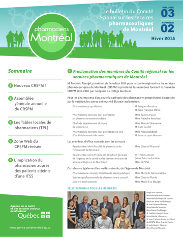 pharmaciens Montréal Sommaire 1 Le bulletin du Comité régional sur les services pharmaceutiques de Montréal 03 02 VOLUME NUMÉRO Hiver 2015 Proclamation des membres du Comité régional sur les services pharmaceutiques de Montréal 1 Nouveau CRSPM ! M. Frédéric Abergel, président de l’élection 2014 pour le comité régional sur les services pharmaceutiques de Montréal (CRSPM) a proclamé les membres formant le nouveau CRSPM 2014-2018, par catégorie de collège électoral. 2 Assemblée générale annuelle du CRSPM Pour les pharmaciens élus, seule la catégorie des pharmaciens propriétaires est passée par la votation; les autres ont tous été élus par acclamation. 3 4 5 Les Tables locales de pharmaciens (TPL) Zone Web du CRSPM révisée L’implication du pharmacien auprès des patients atteints d’une ITSS Pharmaciens propriétaires M. Jacques Gendron M. Jean-François Morin Pharmaciens exerçant leur profession en pharmacie communautaire Mme Sandy Araujo Mme Natacha Beaulieu Chefs de département clinique de pharmacie Mme Maude Villeneuve M. Jude Goulet Pharmaciens exerçant leur profession au sein d’un établissement de santé Mme Nada Dabbagh M. Jean-Jacques Moreau Les membres d’office nommés sont les suivants : Représentant de la Faculté de pharmacie de l’Université de Montréal Mme Chantal Pharand Représentant de la Présidente directrice générale de l’Agence de la santé et des services sociaux de Montréal (Agence de Montréal) M. Frédéric Abergel (Mme Patricia Gauthier étant la PDG) On retrouve également les invités suivants, de l’Agence de Montréal : Pharmacienne-conseil, Direction de Santé publique Services professionnels de pharmacienne-conseil Soutien professionnel Mme Michelle Normandeau Mme Chantal Plante Mme Marie-Ève Mauger FÉLICITATIONS À TOUS LES MEMBRES ! www.agence.santemontreal.qc.ca De gauche à droite : Mme Michelle Normandeau, Mme Nada Dabbagh, M. Jacques Gendron, Mme Sandy Araujo, M. Jean-Jacques Moreau, Mme Natacha Beaulieu, Mme Marie-Ève Mauger, M. Frédéric Abergel. Assis : Mme Maude Villeneuve, M. Jean-François Morin, président du CRSPM, Mme Chantal Plante, M. Jude Goulet. Absente : Mme Chantal Pharand. Le bulletin du Comité régional sur les servicespharmaceutiques de Montréal VOLUME 03 - NUMÉRO 02 - HIVER 2015 - PAGE 2 2 Assemblée générale annuelle du CRSPM 3 Tables locales de pharmaciens Le CRSPM a tenu son assemblée générale annuelle le jeudi 22 mai 2014. Une soixantaine de pharmaciens du territoire montréalais ont assisté à l’évènement. Le 2 décembre dernier, le CRSPM tenait à l’Agence de Montréal la deuxième rencontre des représentants d’une Table locale de pharmaciens (TLP) sur l’île de Montréal. La Direction de la santé publique de l’Agence de Montréal en a profité pour rendre accessibles aux pharmaciens les informations suivantes : Ayant pour but principal la diffusion d’informations et le partage des réalisations de chaque TLP dans les différents réseaux locaux de services sur le territoire montréalais, le CRSPM a permis de réunir encore une fois cette année, des représentants de onze centres de santé et de services sociaux (CSSS). • Trousse MIP (Matériel injectable personnel), avec la participation de Mme Manon Dugas, conseillère clinique, secteur Vigie-protection • Données de monitoring de l’ordonnance collective de la TRN (Thérapie de remplacement de la nicotine), par Mme Michelle Normandeau, pharmacienne-conseil Des sessions d’affichage par des étudiants en pharmacie de l’Université de Montréal précédaient cette rencontre. On y retrouvait les sujets suivants : • Sensibilisation sur la littéracie en santé • InfoPsychose : Informations s’adressant aux proches de patients ayant un trouble psychotique • Guide d’interactions médicamenteuses avec le projet Cumulus (Organisme de prévention de la toxicomanie chez les jeunes) La soirée s’est terminée par la présentation de Dr Jacques Ricard « Le pharmacien au cœur de la 1re ligne montréalaise en action ». Vous retrouverez toutes les informations et les présentations sur l’assemblée générale annuelle 2014 du CRSPM sur le site www.pharmaciensmontreal.ca dans la section « Le CRSP de Montréal » à l’onglet « Assemblées générales annuelles (AGA 2014) ». 4 Zone Web du CRSPM révisée ! La zone Web du CRSPM fait peau neuve! Nous vous invitons à la consulter au : www.pharmaciensmontreal.ca De nouvelles sections ont été insérées, rendant l’information mieux accessible et plusieurs renseignements ont été ajoutés! Nous espérons que les pharmaciens du territoire montréalais sauront en profiter! Par exemple, dans la section « Pour votre pratique », en consultant la sous-section « Outils cliniques », on retrouvera l’ajout d’un volet « Santé publique ». Plusieurs bonifications viennent rehausser la partie sur les « Tables locales de pharmaciens » En date du 30 novembre 2014, on compte maintenant onze TLP actives; la douzième TLP est en préparation. Au cours de la dernière année, plusieurs membres de TLP ont réalisé des démarches afin de consolider cette instance locale. Le CRSPM vous invite à participer à la TLP de votre CSSS. Si vous n’avez pas reçu d’invitation pour assister à une TLP au cours de la dernière année, consulter les informations sur les TLP dans la zone Web du CRSPM, section « Pour votre pratique » afin de connaître les personnes ressources dans votre CSSS. Comité soutenu par un CSSS, le patient est mis au cœur des préoccupations d’une TLP. Une TLP favorise la collaboration intraprofessionnelle, tout comme la collaboration interprofessionnelle. En rafales… • Le CRSPM prendra connaissance des informations découlant de l’adoption de la Loi n° 10. Nous vous informerons des impacts sur le CRSPM au moment opportun. • Pour plus d’information sur la maladie à virus Ebola, veuillez consulter le site : h