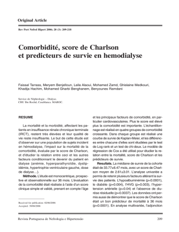 COMORBIDITÉ, SCORE DE CHARLSON ET PREDICTEURS DE SURVIE EN HEMODIALYSE Original Article Rev Port Nefrol Hipert 2006; 20 (3): 209-218 Comorbidité, score de Charlson et predicteurs de survie en hemodialyse Faissal Tarrass, Meryem Benjelloun, Leila Alaoui, Mohamed Zamd, Ghislaine Medkouri, Khadija Hachim, Mohamed Gharbi Benghanem, Benyounes Ramdani Service de Néphrologie – Dialyse. CHU Ibn Rochd, Casablanca. MAROC. RESUME La mortalité et la morbidité, affectant les patients en insuffisance rénale chronique terminale (IRCT), restent très élevées et leur qualité de vie reste insuffisante. Le but de cette étude est d’observer sur une population de sujets incident en hémodialyse, l’impact sur la mortalité de la comorbidité, évaluée par le score de Charlson, et d’étudier la relation entre ceci et les autres facteurs conditionnant le devenir du patient en dialyse (anémie, hyperparathyroïdie, dyslipidémie, hypertrophie ventriculaire gauche, dose de dialyse…). Méthode. L’étude est monocentrique, prospective et observationnelle sur 36 mois. L’évaluation de la comorbidité était réalisée à l’aide d’un score clinique simple et validé, prenant en compte l’âge Received for publication: 02/06/2006 Accepted: 30/06/2006 Revista Portuguesa de Nefrologia e Hipertensão et les principaux facteurs de comorbidité, en particulier cardiovasculaires. Plus le score est élevé plus la comorbidité est importante. L’échantillonnage est réalisé en quatre groupes de comorbidité croissante. Dans chaque groupe est réalisé une courbe de survie de Kaplan-Meier, et les différences entre chacune d’elles sont étudiées par le test de Log rank et un test de chi-deux. Le modèle de régression de Cox a été utilisé pour étudier la relation entre la mortalité, score de Charlson et les prédicteurs de survie. Resultats. La médiane de survie de la cohorte était de 33.77±6.47 mois, avec un score de Charlson moyen de 2.61±3.01. L’analyse univariée a permis de retenir plusieurs facteurs altérant la survie des patients. L’hypoalbuminémie (p<0.0001), le diabète (p=0.004), l’HVG (p=0.003), l’hypertension artérielle (p=0.04) et l’absence de diurése résiduelle (p=0.0037). Les données ont permis aussi de démontrer que le score de Charlson était un bon prédicteur de mortalité à 36 mois (p<0.0001). En analyse multivariée, l’adjonction 209 Faissal Tarrass, Meryem Benjelloun, Leila Alaoui, Mohamed Zamd, Ghislaine Medkouri, Khadija Hachim, Mohamed Gharbi Benghanem, Benyounes Ramdani de l’albuminémie au modèle statistique renforce la valeur prédictive du score. Conclusion. Le score de Charlson présente une bonne valeur prédictive du devenir des patients en hémodialyse. Son utilité pour les cliniciens et les professionnels de la santé peut se faire en leur fournissant des données pronostiques et en leur suggérant des domaines sur lesquels concentrer les interventions visant à allonger l’espérance de vie de ces patients. Mots clés: Insuffisance rénale chronique, hémodialyse, comorbidité, mortalité, score de Charlson, prédicteurs de survie. SUMMARY Comorbidity, Charlson index and predictors of survival in haemodialysis Background. Mortality and morbidity of ESRD patients remain very high and their quality of life remains insufficient. The purpose of this study was to assess the impact on mortality of comorbidity using the Charlson index, in a cohort of incident haemodialysis patients, and to establish the interaction between this and other known predictors of patient outcome, such as anaemia, hyperparathyroidism, dyslipidaemia, left ventricular hypertrophy and dialysis dose). Methods. It is a single centre, prospective, observational study over 36 months. Comorbidity evaluation was performed using a simple and validated index, which includes age and the mean comorbidity factors within the scoring method. Sampling is carried out in four groups of increasing comorbidity. In each group an actuarial survival rate was calculated according to the Kaplan / Meier method. 210 The log-rank test was used to compare survival between comorbid groups. The Cox proportional hazards method was used to evaluate the influence of comorbidity grade when combined with other established predictors of survival. Results. Median survival was 33.77±6.47 months, mean Charlson index was 2.61±3.01. Univariate analysis showed that significant predictors of mortality were hypoalbuminaemia (p<0.0001), diabetes (p=0.004), left ventricular hypertrophy (p=0.003), arterial hypertension (p=0.04) and the loss of residual diuresis (p=0.0037). Data also demonstrated that the Charlson index was a good predictor of mortality at 36 months. In multivariate analysis, the addition of albuminaemia level to the statistical model increased the predictive power of the Charlson index. Conclusion. The Charlson index presents a good predictive value of patient’s outcome in haemodialysis therapy. Its utility for clinicians and health care professionals lies in providing prognostic data and suggesting fields in which to focus interventions aiming to prolong the life expectancy of these patients. Key words: Charlson index, chronic renal failure, comorbidity, haemodialysis, mortality, predictors of survival. INTRODUCTION Si l’évolution des techniques diagnostiques et thérapeutiques a sensiblement amélioré le pronostic de beaucoup de malades chroniques, l’insuffisant rénal présente un problème particulier dans la mesure où il est toujours en attente d’une transplantation rénale, puisque la dialyse n’assure que sa survie. Durant cette période l’amélioration de la qual- Revista Portuguesa de Nefrologia e Hipertensão COMORBIDITÉ, SCORE DE CHARLSON ET PREDICTEURS DE SURVIE EN HEMODIALYSE ité de vie du patient passe par la prise en charge des pathologies associées1. Or, peu d’études se sont intéressées à évaluer l’ampleur de ce problème chez le dialysé et