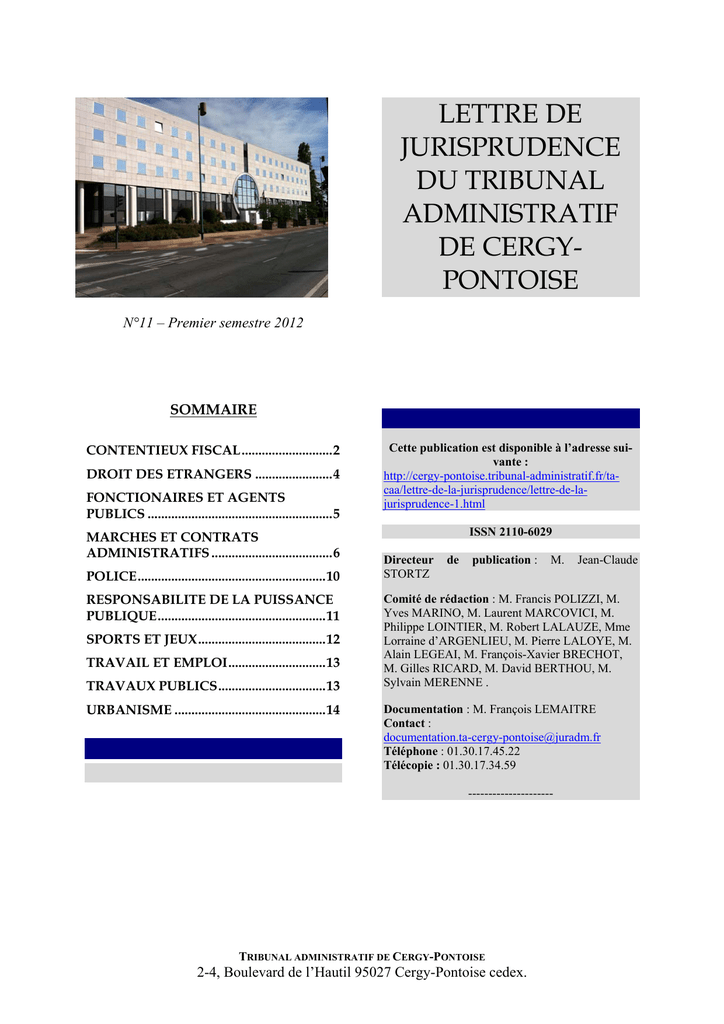 LETTRE DE JURISPRUDENCE DU TRIBUNAL ADMINISTRATIF DE CERGYPONTOISE N°11 – Premier semestre 2012 SOMMAIRE CONTENTIEUX FISCAL...........................2 DROIT DES ETRANGERS .......................4 FONCTIONAIRES ET AGENTS PUBLICS .......................................................5 MARCHES ET CONTRATS ADMINISTRATIFS ....................................6 POLICE........................................................10 RESPONSABILITE DE LA PUISSANCE PUBLIQUE..................................................11 SPORTS ET JEUX......................................12 TRAVAIL ET EMPLOI.............................13 TRAVAUX PUBLICS................................13 URBANISME .............................................14 Cette publication est disponible à l’adresse suivante : http://cergy-pontoise.tribunal-administratif.fr/tacaa/lettre-de-la-jurisprudence/lettre-de-lajurisprudence-1.html ISSN 2110-6029 Directeur STORTZ de publication : M. Jean-Claude Comité de rédaction : M. Francis POLIZZI, M. Yves MARINO, M. Laurent MARCOVICI, M. Philippe LOINTIER, M. Robert LALAUZE, Mme Lorraine d’ARGENLIEU, M. Pierre LALOYE, M. Alain LEGEAI, M. François-Xavier BRECHOT, M. Gilles RICARD, M. David BERTHOU, M. Sylvain MERENNE . Documentation : M. François LEMAITRE Contact : [email protected] Téléphone : 01.30.17.45.22 Télécopie : 01.30.17.34.59 --------------------- TRIBUNAL ADMINISTRATIF DE CERGY-PONTOISE 2-4, Boulevard de l’Hautil 95027 Cergy-Pontoise cedex. SELECTION DE JUGEMENTS CONTENTIEUX FISCAL 21 mars 2012, 8e ch., n°1005059, Mme Olga A…, C+ 19‐04‐01‐02‐05‐01 Impôt sur le revenu. Pensions alimentaires – Convention franco russe du 26 novembre 1996 – Interprétation stricte de la doctrine. L’article 79 du code général des impôts soumet à l’imposition au titre de l’impôt sur le revenu: « Les traitements, indemnités, émoluments, salaires, pensions et rentes viagères ». Des sommes versées pour l’entretien des enfants par un ressortissant russe à la mère des enfants qui réside en France ont la nature de pensions, et sont imposables en France. La circonstance que le débiteur de l’obligation ne puisse pas déduire les sommes en cause ne caractérise pas une double imposition, interdite par l’article 24 de la convention franco russe du 26 novembre 1996. La documentation de base référencée 5F 1242 interdit d’imposer les pensions alimentaires lorsque les sommes ne sont pas déductibles par le débiteur de l’obligation. Mais la requérante ne peut utilement se prévaloir des ces dispositions sur le fondement de l’article L. 80 A du livre des procédures fiscales, dès lors que la doctrine, qui s’interprète strictement, n’autorise une telle déduction que pour « les pensions alimentaires servies en exécution des obligations résultant des dispositions du code civil », ce qui n’est pas le cas des versements en cause. Rejet de la requête. Jugement frappé d’appel 11 avril 2012, 8e Mme Evelyne S…, C+ ch., n°1006041, 19‐01‐05‐01‐03 Fiscal – Recouvrement – Suspension du délai de prescription de l’action en recouvrement jusqu’à l’intervention d’une décision juridictionnelle définitive. Selon l’article L. 277 du livre des procédures fiscales, l'exigibilité de la créance et la prescription de l'action en recouvrement sont suspendues jusqu'à ce qu'une décision définitive ait été prise sur la réclamation soit par l'administration, soit par le tribunal compétent. Dans une procédure antérieure, la requérante a contesté devant le tribunal administratif des actes de poursuite. L’administration les annule et en reprend d’autres. Le contentieux initial suit son cours, et la CAA de Paris juge notamment que l’action de la requérante doit être regardée comme dirigée contre les seconds actes de poursuites, qui ont remplacé les premiers. Devant le tribunal administratif, pour d’autres actes de poursuites, la requérante fait valoir que l’action est prescrite dans la mesure où le contentieux précédent était mal dirigé (puisque dirigé contre les premiers actes, qui ont été annulés par l’administration), et ne pouvait donc pas interrompre la prescription. Par le jugement du 11 avril, le tribunal rejette le moyen, en s’appuyant notamment sur l’arrêt de la CAA qui avait requalifié la requête initiale. Rejet de la requête. Jugement frappé d’appel 30 mai 2012, 5e ch., n°0805917, Sté TRANSDEV SA , C+ 19‐04‐01‐04 ; 15‐02‐01 ; 15‐03‐03 En ce qui concerne les retenues à la source (RAS) prélevées sur les dividendes versés à une société italienne au titre de sa participation de 7 % dans le capital de la SA TRANSDEV. La requérante demande le remboursement de la RAS non imputée sur l'impôt italien acquitté par la bénéficiaire. Ce mécanisme de RAS sur les « dividendes sortants » de la France vers un autre pays de l’Union Européenne a été censuré sur le terrain de la liberté d'établissement protégé par l'article 43 du Traité Européen (CJCE 14 décembre 2006, C-170-05 ; CE 6 avril 2007, 235069, RJF 2007 807 ; CE 13 février 2009, 298108 ; CE 23 mai 2011, 344678 à 344687). La discrimination est également invocable sur le fondement de la liberté TRIBUNAL ADMINISTRATIF DE CERGY-PONTOISE 2-4, Boulevard de l’Hautil 95027 Cergy-Pontoise cedex. 2 de circulation en cas de participation. L'administration a d’ailleurs déchargé les RAS 2005 et 2006. Le service fait état d'une forclusion pour la RAS 2004, la réclamation ayant été déposée le 21 décembre 2007, après le délai normal de réclamation qui expirait le 31 décembre 2006. Toutefois, en l’occurrence, les arrêts CJCE peuvent constituer des événements de nature à rouvrir le délai de réclamation du R. 196-1 LPF (CE 23 décembre 2011, 330094 ; CAA PARIS 13 décembre 2011, 10PA03193). Décharge partielle 7 juin 2012, 5e ch., n°0902996, SAS GROUPE LUCIEN BARRIERE, C+ lui incomba