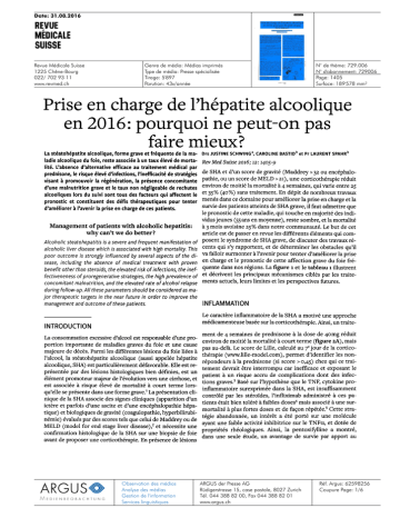Date: 31.08.2016 Revue Médicale Suisse 1225 Chêne-Bourg 022/ 702 93 11 www.revmed.ch Genre de média: Médias imprimés Type de média: Presse spécialisée Tirage: 5'897 Parution: 43x/année N° de thème: 729.006 N° d'abonnement: 729006 Page: 1405 Surface: 189'578 mm² Prise en charge de l'hépatite alcoolique en 2016: pourquoi ne peut-on pas faire mieux? La stéatohépatite alcoolique, forme grave et fréquente de la maladie alcoolique du foie, reste associée à un taux élevé de mortalité. L'absence d'alternative efficace au traitement médical par prednisone, le risque élevé d'infections, l'inefficacité de stratégies visant à promouvoir la régénération, la présence concomitante d'une malnutrition grave et le taux non négligeable de rechutes alcooliques lors du suivi sont tous des facteurs qui affectent le Drs JUSTINE SCHWING', CAROLINE BASTIDb et Pr LAURENT SPAHRb Rev Med Suisse 2016; 12: 1405-9 de SHA et d'un score de gravité (Maddrey > 32 ou encéphalopathie, ou un score de MELD > 21), une corticothérapie réduit environ de moitié la mortalité à 4 semaines, qui varie entre 25 et 35% (4o%) sans traitement. En dépit de nombreux travaux pronostic et constituent des défis thérapeutiques pour tenter menés dans ce domaine pour améliorer la prise en charge et la survie des patients atteints de SHA grave, il faut admettre que d'améliorer à l'avenir la prise en charge de ces patients. le pronostic de cette maladie, qui touche en majorité des individus jeunes (55 ans en moyenne), reste sombre, et la mortalité Management of patients with alcoholic hepatitis: à 3 mois avoisine 25% dans notre communauté. Le but de cet why can't we do better ? article est de passer en revue les différents éléments qui comAlcoholic steatohepatitis is a severe and frequent manifestation of posent le syndrome de SHA grave, de discuter des travaux ré- cents qui s'y rapportent, et de déterminer les obstacles qu'il va falloir surmonter à l'avenir pour tenter d'améliorer la prise sease, including the absence of medical treatment with proven en charge et le pronostic de cette affection grave du foie frébenefit other than steroids, the elevated risk of infections, the inef- quente dans nos régions. La figure i et le tableau 1 illustrent fectiveneness of proregenerative strategies, the high prevalence of et décrivent les principaux mécanismes ciblés par les traiteconcomitant malnutrition, and the elevated rate of alcohol relapse ments actuels, leurs limites et les perspectives futures. alcoholic liver disease which is associated with high mortality. This poor outcome is strongly influenced by several aspects of the di- during follow-up. these parameters should be considered as ma- jor therapeutic targets in the near future in order to improve the management and outcome of these patients. INFLAMMATION Le caractère inflammatoire de la SHA a motivé une approche médicamenteuse basée sur la corticothérapie. Ainsi, un traite- INTRODUCTION ment de 4 semaines de prednisone à la dose de 4omg réduit La consommation excessive d'alcool est responsable d'une proenviron de moitié la mortalité à court terme (figure zA), mais portion importante de maladies graves du foie et une cause pas au-delà. Le score de Lille, calculé au 7' jour de la corticomajeure de décès. Parmi les différentes lésions du foie liées à thérapie (www.lille-model.com), permet d'identifier les non- l'alcool, la stéatohépatite alcoolique (aussi appelée hépatite alcoolique, SHA) est particulièrement défavorable. Elle est re- présentée par des lésions histologiques bien définies, est un élément promoteur majeur de l'évolution vers une cirrhose, et est associée à risque élevé de mortalité à court terme lorsqu'elle se présente dans une forme grave.' La présentation clinique de la SHA associe des signes cliniques (apparition d'un ictère et parfois d'une ascite et d'une encéphalopathie hépatique) et biologiques de gravité (coagulopathie, hyperbilirubi- répondeurs à la prednisone (si score > 0,45) chez qui ce traitement devrait être interrompu car inefficace et exposant le patient à un risque accru de complications dont des infections graves.' Basé sur l'hypothèse que le TNF, cytokine proinflammatoire surexprimée dans la SHA, est insuffisamment contrôlé par les stéroïdes, l'infliximab administré à ces patients était bien toléré à faibles doses' mais associé à une surmortalité à plus fortes doses et de façon répétée.' Cette stra- tégie abandonnée, un intérêt a été porté sur une molécule némie) évalués par des scores tels que celui de Maddrey ou de ayant une faible activité inhibitrice sur le TNFa, et dotée de MELD (model for end stage liver disease),2 et nécessite une propriétés rhéologiques. Ainsi, la pentoxifylline a montré, confirmation histologique de la SHA sur une biopsie de foie dans une seule étude, un avantage de survie par apport au avant de proposer une corticothérapie. En présence de lésions Observation des médias Analyse des médias Gestion de l'information Services linguistiques ARGUS der Presse AG Rüdigerstrasse 15, case postale, 8027 Zurich Tél. 044 388 82 00, Fax 044 388 82 01 www.argus.ch Réf. Argus: 62598256 Coupure Page: 1/6 Date: 31.08.2016 Revue Médicale Suisse 1225 Chêne-Bourg 022/ 702 93 11 www.revmed.ch Genre de média: Médias imprimés Type de média: Presse spécialisée Tirage: 5'897 Parution: 43x/année N° de thème: 729.006 N° d'abonnement: 729006 Page: 1405 Surface: 189'578 mm² Illustration Illustration des des principaux principaux mécanismes mécanismes impliqués impliqués lors lors de de stéatohépatite stéatohépatite alcoolique alcoolique FIG FIG 11 A: A: microenvironnement microenvironnement hépatique hépatique avec avec inflammation, inflammation, fibrose, fibrose, stéatose, stéatose, nécrose, nécrose, stress stress oxydatif, oxydatif, cholestase; cholestase; B: B: défaut défaut de 