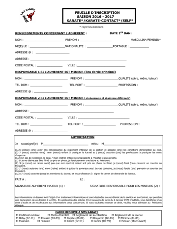 FEUILLE D’INSCRIPTION SAISON 2016 - 2017 KARATE*/KARATE-CONTACT*/SELF* * rayer les mentions DATE 1ER DAN : RENSEIGNEMENTS CONCERNANT L’ADHERENT : NOM : _________________________ PRENOM : ____________________ MASCULIN*/FEMININ* NE(E) LE : ______________________NATIONALITE : ________________PORTABLE : ____________ ADRESSE @ : _____________________ ADRESSE : ____________________________________________________________ CODE POSTAL : ________________ VILLE :______________________________ RESPONSABLE 1 SI L’ADHERENT EST MINEUR (lieu de vie principal) NOM : ___________________________ PRENOM : _____________________QUALITE (père, mère, tuteur) TEL DOM : ____________________ TEL PORT : ____________________ PROFESSION : ADRESSE @ : _____________________ RESPONSABLE 2 SI L’ADHERENT EST MINEUR (si nécessaire et si adresse différente) NOM : ___________________________ PRENOM : _____________________QUALITE (père, mère, tuteur) ADRESSE : ____________________________________________________ CODE POSTAL : ________________ VILLE : ________________________________ TEL DOM : ____________________ TEL PORT : ____________________ PROFESSION : ADRESSE @ : _____________________ AUTORISATION Je soussigné(e) M____________________________ et/ou M____________________________________ (1/2) Déclare (ons) avoir pris connaissance du règlement intérieur de la section et accepte (ons) les conditions d’inscription au club. (2) J’ (nous) autorise (ons) mon (notre) enfant à pratiquer le karaté et j’ (nous) autorise (ons) les professeurs à pratiquer les soins d’urgence. (1/2) En cas de nécessité, je serai / mon (notre) enfant sera transporté à l’hôpital le plus proche. (1) Si je ne désire pas être filmé ou pris en photo, je ferai parvenir une lettre au Président. (2) Si je (nous) ne désire (ons) pas que mon (notre) enfant soit pris en photo ou filmé, je (nous) ferai (ons) parvenir un courrier au Président. (2) J’ (nous) autorise (ons) mon (notre) enfant à quitter le gymnase seul. Le cas contraire, je (nous) ferais (ons) parvenir un courrier au Président. (1/2) J’ (nous) autorise (ons) les membres du bureau et les professeurs à signer le carnet de demande de licence. FAIT A : SIGNATURE ADHERENT MAJEUR (1) : LE : SIGNATURE RESPONSABLE POUR LES MINEURS (2) : Les informations ci-dessus font l’objet d’un traitement informatique et sont destinées au secrétariat de la section et au Central, qui possède une déclaration de ce dossier à la CNIL. En application des articles 39 et suivants de la loi du 6 Janvier 1978 modifiée, vous bénéficiez d’un droit d’accès et de rectification aux informations vous concernant. Si vous souhaitez exercer ce droit, veuillez vous adresser au Président délégué. CADRE RESERVE A SMS KARATE Certificat médical Photo d’identité Règlement de la cotisation Règlement de la licence Baby (12-11) Poussin (10-09) Pupille (08-07) Benjamin (06-05) Minime (04-03) Masculin Féminin Cadet (02-01) Junior (00-99) Senior (98 et avant) MODALITES D’INSCRIPTION La cotisation adulte est due pour les personnes ayant +18 ans et 18 ans sur l’année 2016 ou sur l’année 2017 hors tarif étudiant. La cotisation permet de participer à 2 cours/semaine hors vacances scolaires - Si 1 cours nous consulter. Cotisation : Merci de compléter cette partie « cotisation » sur une seule feuille d’inscription si plusieurs adhérents de la même famille. (La cotisation annuelle comprend l’adhésion de 3€ à SMS CENTRAL et les frais d’enveloppe et de timbres) Cochez la case correspondante : 1 adhésion (né/e en 2011-2012) 1 adhésion (né/e de 2003 à 2010) 1 adhésion (né/e de 2000 à 2002) 1 adhésion (né/e en 1999 et avant) 1 adhésion étudiant avec justificatif de scolarité obligatoire : 100 € : 196 € : 211 € : 259 € si ceinture noire : 208 € : 221 € si ceinture noire : 208 € * Pour 2 inscriptions, déduire 10% de la cotisation la moins chère / A partir de 3 inscriptions, déduire 10% de l’ensemble des cotisations. Cours seul de Self défense à partir de 14 ans Cours seul de karaté contact à partir de 14 ans : 107 € : 107 € (T.Shirt à 10€ sur commande) + La cotisation annuelle (reportez le montant sélectionné) Déduction –10% sur cotisation (hors licence) selon le cas* La licence fédérale (36 € par personne) soit : - ______ X 36 € Nom et prénom du parrain ou de la marraine TOTAUX TOTAL A REGLER en € Modalité de règlement : La cotisation est due pour l’année et son montant est à régler en intégralité à l’inscription (Possibilité de règlements en 3 mensualités successives) Réservé au bureau : Par chèques : 1X: 2X: 3X: € € - Date(s) : € - Date(s) : Coupons sports ou chèques vacances : Espèces : AUCUNE PERSONNE NE POURRA S’ENTRAINER SI ELLE N’A PAS FOURNI AUPARAVANT UN CERTIFICAT MEDICAL (exception faite des nouveaux adhérents pour les deux premières semaines). TOUTE PERSONNE QUI N’AURA PAS REMIS LES DOCUMENTS DEMANDES (le certificat médical, la fiche d’inscription, la photo d’identité, les règlements de la cotisation et de la licence) AVANT LE 30 SEPTEMBRE, NE SERA PLUS ACCEPTEE EN COURS JUSQU'A REGULARISATION DE SA SITUATION.