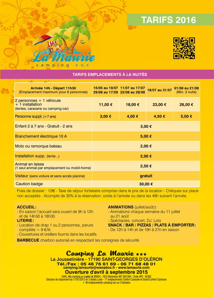 TARIFS 2016 TARIFS EMPLACEMENTS À LA nuitÉE Arrivée 14h - Départ 11h30 (Emplacement maximum pour 6 personnes) 15/05 au 10/07 11/07 au 17/07 01/08 au 21/08 18/07 au 31/07 (Min. 3 nuits) 29/08 au 17/09 22/08 au 28/08 2 personnes + 1 véhicule + 1 installation 11,00 18,00 23,00 26,00 Personne suppl. (+7 ans) 3,00 4,00 4,50 5,00 (tentes, caravane ou camping-car) Enfant 2 à 7 ans - Gratuit - 2 ans 3,00 Branchement électrique 10 A 5,00 Moto ou remorque bateau 2,00 Installation supp. (tente...) 2,00 (1 seul animal par emplacement ou mobil-home) Animal en laisse 2,50 Visiteur (sans voiture et sans accès piscine) gratuit Caution badge 30,00 Frais de dossier : 12€ - Taxe de séjour forfaitaire comprise dans le prix de la location - Chèques sur place non acceptés - Acompte de 30% à la réservation, solde à l’arrivée ou dans les 48h suivant l’arrivée. ACCUEIL : - En saison l’accueil sera ouvert de 9h à 12h et de 14h30 à 18h30. LITERIE : - Location de drap 1 ou 2 personnes, parure complète = 9 /lit. - Couvertures et oreillers fournis dans les locatifs. ANIMATIONS (juillet/août) : - Animations chaque semaine du 11 juillet au 21 août - Spéctacles, concert, DJ, Loto SNACK / BAR / PIZZAS / PLATS À EMPORTER : - De 12h à 14h et de 19h à 21h en saison BARBECUE charbon autorisé en respectant les consignes de sécurité. Camping La Maurie ★★★ La Jousselinière - 17190 SAINT-GEORGES D’OLÉRON Tél./Fax : 05 46 76 61 69 - 06 71 68 48 01 [email protected] - www.lamaurie.com Ouverture d'avril à septembre 2015 SARL Allo camping au capital de 8000 e - RCS Marennes 487 562 894 - Code APE : 5530Z Décision de classement du 17/07/2012 en 3 étoiles Loisir - 77 emplacements Confort Caravane et Grand Confort Caravane + 40 emplacements camping-car sur 3 hectares Descriptifs des locatifs Tarifs à la semaine arrivée à partir de 15h départ jusqu’à 10h. du samedi au samedi ou du dimanche au dimanche (juillet et août) Taxe de séjour comprise dans le prix de la location Mobil-home Standard - 27 m2 - 2 chambres - 4/5 personnes Tarifs pour 4 personnes Salle à manger avec 1 lit d’appoint, placards. Cuisine : réfrigérateur, évier, placards, plaque feux à gaz. Douche, lavabo. Wc indépendants. 1 chambre adulte avec 1 lit deux personnes, placards. 1 chambre enfant avec 2 lits une personne, placards. Salon de jardin, terrasse couverte. 02/04 au 02/07 02 ou 03/07 au 09 ou 10/07 09 ou 10/07 au 23 ou 24/07 23 ou 24/07 au 30 ou 31/07 30 ou 31/07 au 13 ou 14/08 13 ou 14/08 au 20 ou 21/08 20 ou 21/08 au 27 ou 28/08 27 ou 28/08 au 10 ou 11/09 Pers. supplémentaire par jour 2003/2006 - 409 549 605 685 645 455 250 5 2014/2016 278 449 589 645 755 695 495 270 5 Mobil-home Confort - 29 m2 - 2 chambres - 4/6 personnes Tarifs pour 4 personnes Salle à manger, salon avec 1 lit d’appoint, placards. Cuisine : réfrigérateur, évier, placards, plaque feux à gaz. Douche, lavabo. Wc indépendants. 1 chambre adulte avec 1 lit deux personnes, placards. 1 chambre enfant avec 2 lits une personne, placards. Salon de jardin, terrasse couverte. 02/04 au 02/07 02 ou 03/07 au 09 ou 10/07 09 ou 10/07 au 23 ou 24/07 23 ou 24/07 au 30 ou 31/07 30 ou 31/07 au 13 ou 14/08 13 ou 14/08 au 20 ou 21/08 20 ou 21/08 au 27 ou 28/08 27 ou 28/08 au 10 ou 11/09 Pers. supplémentaire par jour 2004/2006 274 425 579 635 725 685 485 290 5 2014/2016 294 465 609 685 780 735 515 310 5 Mobil-home Confort plus - 29 m2 - 3 chambres - 6 personnes ou Grand modèle 6/8 personnes Tarifs pour 6 personnes Grand modèle 2008 - 6/8 personnes Salle à manger, salon, placards. Cuisine : réfrigérateur, évier, placards, plaque feux à gaz. Douche, lavabo, wc indépendants. 1 chambre adulte avec 1 lit deux personnes, placards. 2 chambres enfant avec 2 lits une personne, placards. Salon de jardin, terrasse couverte. 2004 ou 2014 - 6 personnes Plans non contractuels Salle à manger, placards. Cuisine : réfrigérateur, évier, placards, plaque feux à gaz. Douche, lavabo, wc indépendants. 1 chambre adulte avec 1 lit deux personnes, placards. 2 chambres enfant avec 2 lits une personne, placards. Salon de jardin, terrasse couverte. 02/04 au 02/07 02 ou 03/07 au 09 ou 10/07 09 ou 10/07 au 23 ou 24/07 23 ou 24/07 au 30 ou 31/07 30 ou 31/07 au 13 ou 14/08 13 ou 14/08 au 20 ou 21/08 20 ou 21/08 au 27 ou 28/08 27 ou 28/08 au 10 ou 11/09 Pers. supplémentaire par jour 2004 - 473 619 700 795 755 520 320 5 2014 GM 2008 318 509 649 735 855 795 560 340 5 Tarifs des locatifs week-ends (2 nuits minimum) Du 02/04 au 27/06 Tarifs pour 2 nuits Mobil-home Standard Mobil-homeConfort tarif pour 4 pers. 2 ch. - tarif pour 4 pers. Mobil-home Confort Plus - 6 pers ou Grand modèle 6/8 pers 3 ch. - tarif pour 6 pers Mobil-home de 2003-2005 / 135 / Mobil-home de 2014-2016 139 154 173 Nuit supplémentaire 35 40 40 Chèques acceptés uniquement dans le cadre des réservations à l’avance / Paiement sur place uniquement en carte bancaire, espèces, chèques vacances, chèques non acceptés. Personne supplémentaire : 5 e / jour Frais de dossier : 12 e Location TV écran plat : 35 e / semaine (offert pour réservation 15 jours) Location vélos : 35 e / semaine / vélo Location barbecue : 5 e / jour Location de draps (lit 1-2 personnes) : 9 e / lit Location lit bébé : 20 e / semaine Location chaise haute : 20 e / semaine Assurance annulation : 3% du montant de la location Caution à l’arrivée : 300 e pour éventuels dégâts et 80 e pour ménage non fait et badge Acompte 30% à la réservation - Solde 1 mois avant l’arrivée Forfait ménage : 80 e hors vaisselle et sanitaire BAR SÈCHE-LINGE : 3e SNACK SALLE DE BAIN BÉBÉ PLATS À EMPORTER SANITAIRES ACCÈS HANDICAPÉS TUMBLE DRYER PREPARED MEAL TO TAKE AWAY BABY BATHROOM PISCINE PATAUGEOIRE FER À REPASSER SWIMMING POOL 10 h - 20 h de mi-juin à mi-septembre IRON HANDICAPPED PERSON ACCESS TABLE DE PING-PONG TABLE TENNIS AIRE DE JEUX TERRAIN DE PÉTANQUE PLAY AREAS PÉTANQUE FIELD Mini-golf MACHINE À LAVER 