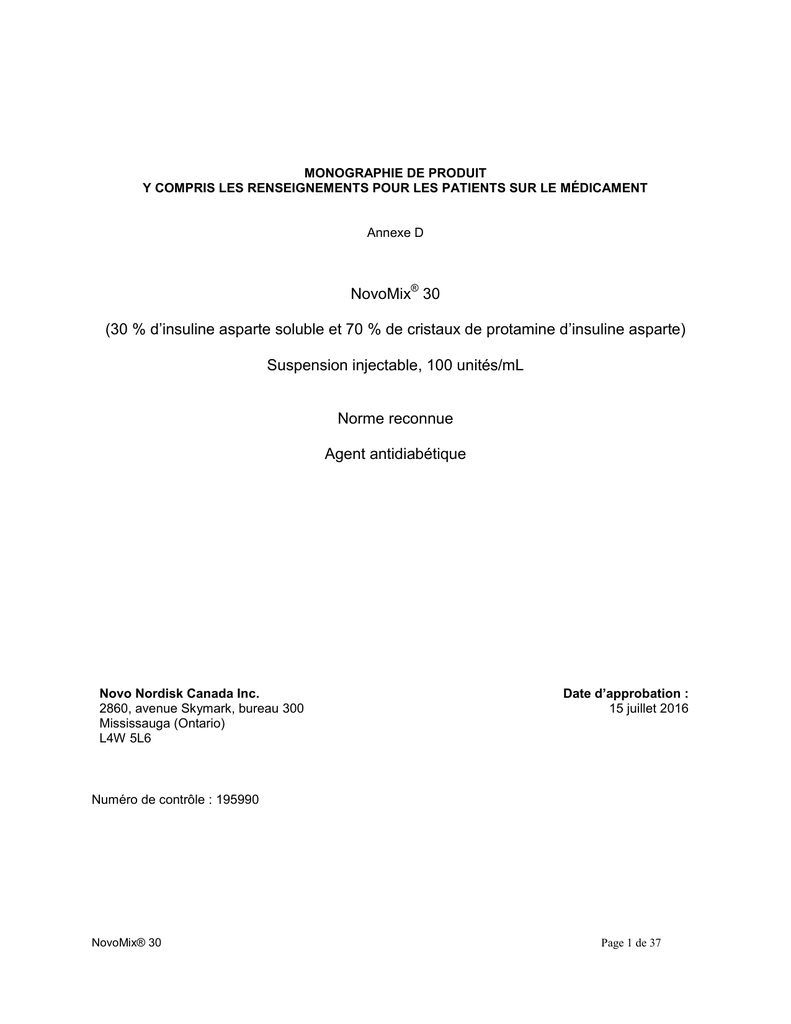 MONOGRAPHIE DE PRODUIT Y COMPRIS LES RENSEIGNEMENTS POUR LES PATIENTS SUR LE MÉDICAMENT Annexe D NovoMix® 30 (30 % d’insuline asparte soluble et 70 % de cristaux de protamine d’insuline asparte) Suspension injectable, 100 unités/mL Norme reconnue Agent antidiabétique Novo Nordisk Canada Inc. 2860, avenue Skymark, bureau 300 Mississauga (Ontario) L4W 5L6 Date d’approbation : 15 juillet 2016 Numéro de contrôle : 195990 NovoMix® 30 Page 1 de 37 Table des matières PARTIE I : RENSEIGNEMENTS POUR LE PROFESSIONNEL DE LA SANTÉ ........................................ 3 RENSEIGNEMENTS SOMMAIRES SUR LE PRODUIT .......................................................................... 3 DESCRIPTION .......................................................................................................................................... 3 INDICATIONS ET UTILISATION CLINIQUE ............................................................................................ 3 CONTRE-INDICATIONS ........................................................................................................................... 3 MISES EN GARDE ET PRÉCAUTIONS .................................................................................................. 4 EFFETS INDÉSIRABLES ......................................................................................................................... 8 INTERACTIONS MÉDICAMENTEUSES ................................................................................................ 12 POSOLOGIE ET ADMINISTRATION ..................................................................................................... 13 SURDOSAGE ......................................................................................................................................... 14 MODE D’ACTION ET PHARMACOLOGIE CLINIQUE ........................................................................... 14 ENTREPOSAGE ET STABILITÉ ............................................................................................................ 18 INSTRUCTIONS PARTICULIÈRES DE MANIPULATION ..................................................................... 18 FORMES POSOLOGIQUES, COMPOSITION ET CONDITIONNEMENT ............................................. 18 PARTIE II : RENSEIGNEMENTS SCIENTIFIQUES................................................................................... 20 RENSEIGNEMENTS PHARMACEUTIQUES ......................................................................................... 20 ESSAIS CLINIQUES ............................................................................................................................... 20 PHARMACOLOGIE DÉTAILLÉE ............................................................................................................ 23 TOXICOLOGIE........................................................................................................................................ 24 RÉFÉRENCES ........................................................................................................................................ 27 PARTIE III : RENSEIGNEMENTS POUR LES PATIENTS SUR LE MÉDICAMENT .... Error! Bookmark not defined. NovoMix® 30 Page 2 de 37 ® NovoMix 30 (30 % d’insuline asparte soluble et 70 % de cristaux de protamine d’insuline asparte) PARTIE I : RENSEIGNEMENTS POUR LE PROFESSIONNEL DE LA SANTÉ RENSEIGNEMENTS SOMMAIRES SUR LE PRODUIT Voie d’administration Forme posologique et concentration Ingrédients non médicinaux cliniquement importants Injection sous-cutanée Suspension injectable, 100 unités/mL Glycérol, phénol, 3-méthylphénol, zinc (sous forme de chlorure), chlorure de sodium, phosphate disodique dihydraté, sulfate de protamine, hydroxyde de sodium, acide chlorhydrique et eau pour injection. Pour obtenir la liste complète, veuillez consulter la section FORMES POSOLOGIQUES, COMPOSITION ET CONDITIONNEMENT. DESCRIPTION ® NovoMix 30 (30 % d’insuline asparte soluble et 70 % de cristaux de protamine d’insuline asparte) est un analogue de l’insuline humaine sous forme de suspension à double libération contenant 30 % d’insuline asparte soluble et 70 % de cristaux de protamine d’insuline asparte. ® NovoMix 30 a comme caractéristique d’être absorbé rapidement. L’insuline asparte soluble contenue ® dans NovoMix 30 est rapidement absorbée à partir du tissu sous-cutanée. Le reste se trouve dans la forme cristalline, en tant que protamine d’insuline asparte, qui présente une absorption prolongée après l’injection sous-cutanée. INDICATIONS ET UTILISATION CLINIQUE ® NovoMix 30 est indiqué pour le traitement des patients adultes atteints de diabète qui ont besoin d’insuline pour contrôler l’hyperglycémie. Gériatrie (> 65 ans) : ® Les études cliniques sur NovoMix 30 n’ayant pas regroupé suffisamment de patients âgés de 65 ans et plus, il n’est pas possible de déterminer si ce type de patients répond au traitement d’une manière différente de celle des patients plus jeunes. Pédiatrie (< 16 ans) : On ne dispose pas de données adéquates pour établir l’efficacité du produit en pédiatrie. CONTRE-INDICATIONS ® NovoMix 30 est contre-indiqué : durant les épisodes d’hypoglycémie; chez les patients présentant une hypersensibilité connue à ce médicament, à l’un des ingrédients de la préparation ou à l’un des composants du récipient. Pour obtenir une liste complète des ingrédients, veuillez consulter la section FORMES POSOLOGIQUES, COMPOSITION ET CONDITIONNEMENT de la monographie. NovoMix® 30 Page 3 de 37 MISES EN GARDE ET PRÉCAUTIONS Mises en garde et précautions importantes L’hypoglycémie est l’effet indésirable le plus fréquent de l’insulinothérapie. Elle peut survenir à différents moments, comme c’est le cas avec toutes les insulines. Tous les patients diabétiques traités avec de l’insuline doivent donc surveiller leur g