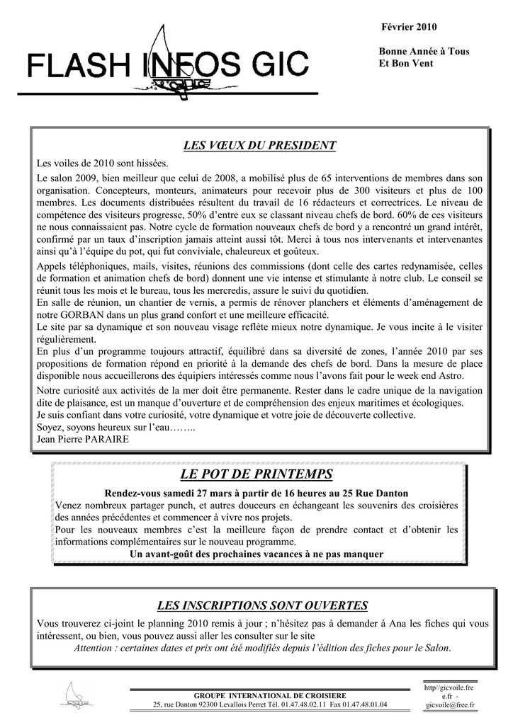 Février 2010 Bonne Année à Tous Et Bon Vent LES VŒUX DU PRESIDENT Les voiles de 2010 sont hissées. Le salon 2009, bien meilleur que celui de 2008, a mobilisé plus de 65 interventions de membres dans son organisation. Concepteurs, monteurs, animateurs pour recevoir plus de 300 visiteurs et plus de 100 membres. Les documents distribuées résultent du travail de 16 rédacteurs et correctrices. Le niveau de compétence des visiteurs progresse, 50% d’entre eux se classant niveau chefs de bord. 60% de ces visiteurs ne nous connaissaient pas. Notre cycle de formation nouveaux chefs de bord y a rencontré un grand intérêt, confirmé par un taux d’inscription jamais atteint aussi tôt. Merci à tous nos intervenants et intervenantes ainsi qu’à l’équipe du pot, qui fut conviviale, chaleureux et goûteux. Appels téléphoniques, mails, visites, réunions des commissions (dont celle des cartes redynamisée, celles de formation et animation chefs de bord) donnent une vie intense et stimulante à notre club. Le conseil se réunit tous les mois et le bureau, tous les mercredis, assure le suivi du quotidien. En salle de réunion, un chantier de vernis, a permis de rénover planchers et éléments d’aménagement de notre GORBAN dans un plus grand confort et une meilleure efficacité. Le site par sa dynamique et son nouveau visage reflète mieux notre dynamique. Je vous incite à le visiter régulièrement. En plus d’un programme toujours attractif, équilibré dans sa diversité de zones, l’année 2010 par ses propositions de formation répond en priorité à la demande des chefs de bord. Dans la mesure de place disponible nous accueillerons des équipiers intéressés comme nous l’avons fait pour le week end Astro. Notre curiosité aux activités de la mer doit être permanente. Rester dans le cadre unique de la navigation dite de plaisance, est un manque d’ouverture et de compréhension des enjeux maritimes et écologiques. Je suis confiant dans votre curiosité, votre dynamique et votre joie de découverte collective. Soyez, soyons heureux sur l’eau…….. Jean Pierre PARAIRE LE POT DE PRINTEMPS Rendez-vous samedi 27 mars à partir de 16 heures au 25 Rue Danton Venez nombreux partager punch, et autres douceurs en échangeant les souvenirs des croisières des années précédentes et commencer à vivre nos projets. Pour les nouveaux membres c’est la meilleure façon de prendre contact et d’obtenir les informations complémentaires sur le nouveau programme. Un avant-goût des prochaines vacances à ne pas manquer LES INSCRIPTIONS SONT OUVERTES Vous trouverez ci-joint le planning 2010 remis à jour ; n’hésitez pas à demander à Ana les fiches qui vous intéressent, ou bien, vous pouvez aussi aller les consulter sur le site Attention : certaines dates et prix ont été modifiés depuis l’édition des fiches pour le Salon. GROUPE INTERNATIONAL DE CROISIERE 25, rue Danton 92300 Levallois Perret Tél. 01.47.48.02.11 Fax 01.47.48.01.04 http//gicvoile.fre e.fr [email protected] A PROPOS DES INSCRIPTIONS Les inscriptions ne sont prises en compte qu’accompagnées de l’acompte correspondant : 300€ par semaine. Comme chaque année, nous vous demandons, ainsi que nous l’impose la réglementation, un certificat médical de non contre indication à la pratique de la voile en équipage. L’assurance obligatoire (22€) est réglable à la première navigation. Nous sommes tenus de vous proposer une assurance complémentaire mais vous pouvez aussi la souscrire auprès de votre assureur habituel. Pour les nouveaux membres, merci de remplir également une demande d’adhésion résumant votre CV nautique. (à demander à Ana) Comme chaque année, nous vous rappelons l’intérêt des inscriptions précoces : - Si nous ne voulons pas perdre nos acomptes, en cas de remplissage insuffisant des bords, nous devons annuler les réservations 3 mois avant le départ, les inscriptions trop tardives risquent donc de n’être pas satisfaites - Plus tôt votre bord sera validé, meilleures seront vos conditions d’achat de billets d’avion. - Il est bon de pouvoir organiser une ou plusieurs réunions d’équipage avant le départ, tant pour régler des dispositions matérielles que pour bien se mettre d’accord sur les attentes de chacun. GORBAN…ET L’APRES GORBAN Comme chaque hiver, Gorban a été bichonné par une équipe aussi motivée que compétente. Après l’intervention du chantier, il doit être remis à l’eau le 4 mars pour entamer sa dernière saison avec nous. Sa mise en vente ne compromet en rien le programme de cette année. Comme vous avez pu voir sur le site, l’annonce en vue de vente est parue et nous avons quelques pistes pour son remplacement. Cependant, toutes les éventualités sont envisageables et si vous avez connaissance d’un bateau répondant à nos critères, merci de nous en faire part (45 pieds de moins de 3 ans, 4 cabines et soute à voiles….). NAVIGATION ASTRONOMIQUE Pour les 11 participants, ce fut un plaisir de partager l’enthousiasme de François Meyrier. Tous ont apprécié la clarté d’un exposé particulièrement vivant et l’alternance des séquences théoriques et des passages à la pratique, dans une atmosphère détendue et ludique (la touche magique de la calculette... les constellations sur parapluie…). Pas un instant, l’intérêt n’a faibli. L’expérience est à renouveler… et pourquoi pas à l’occasion des journées portes ouvertes de l’observatoire de Thiel en juin et d’une semaine embarquée en arrière saison. GROUPE INTERNATIONAL DE CROISIERE 25, rue Danton 92300 Levallois Perret Tél. 01.47.48.02.11 Fax 01.47.48.01.04 http//gicvoile.free.fr - [email protected] LE POINT SUR LES PROGRAMMES Certains bords sont complets, n’hésitez pas à contacter Ana car des places peuvent se libérer suite à des désistements. AVANT SAISON Semaines sur Gorban en Manche : Une zone technique pour prendre en main 