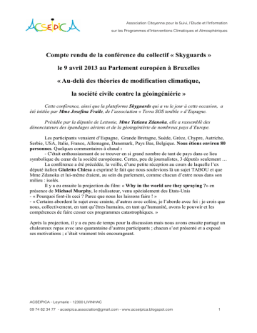 Association Citoyenne pour le Suivi, l’Etude et l’Information sur les Programmes d’Interventions Climatiques et Atmosphériques Compte rendu de la conférence du collectif « Skyguards » le 9 avril 2013 au Parlement européen à Bruxelles « Au-delà des théories de modification climatique, la société civile contre la géoingéniérie » Cette conférence, ainsi que la plateforme Skyguards qui a vu le jour à cette occasion, a été initiée par Mme Josefina Fraile, de l’association « Terra SOS tenible » d’Espagne. Présidée par la députée de Lettonie, Mme Tatiana Zdanoka, elle a rassemblé des dénonciateurs des épandages aériens et de la géoingéniérie de nombreux pays d’Europe. Les participants venaient d’Espagne, Grande Bretagne, Suède, Grèce, Chypre, Autriche, Serbie, USA, Italie, France, Allemagne, Danemark, Pays Bas, Belgique. Nous étions environ 80 personnes. Quelques commentaires à chaud : - C'était enthousiasmant de se trouver en si grand nombre de tant de pays dans ce lieu symbolique du cœur de la société européenne. Certes, peu de journalistes, 3 députés seulement … La conférence a été précédée, la veille, d’une petite réception au cours de laquelle l’ex député italien Giuletto Chiesa a exprimé le fait que nous soulevions là un sujet TABOU et que Mme Zdanoka et lui-même étaient, au sein du parlement, comme chacun d’entre nous dans son milieu : isolés. Il y a eu ensuite la projection du film: « Why in the world are they spraying ?» en présence de Michael Murphy, le réalisateur, venu spécialement des Etats-Unis - « Pourquoi font-ils ceci ? Parce que nous les laissons faire ! » - « Certains abordent le sujet avec crainte, d’autres avec colère, je l’aborde avec foi : je crois que nous, collectivement, en tant qu’êtres humains, en tant qu’humanité, avons le pouvoir et les compétences de faire cesser ces programmes catastrophiques. » Après la projection, il y a eu peu de temps pour la discussion mais nous avons ensuite partagé un chaleureux repas avec une quarantaine d’autres participants ; chacun s’est présenté et a exposé ses motivations ; c’était vraiment très encourageant. ACSEIPICA - Leymarie - 12300 LIVINHAC 09 74 62 34 77 - [email protected] - www.acseipica.blogspot.com 1 Association Citoyenne pour le Suivi, l’Etude et l’Information sur les Programmes d’Interventions Climatiques et Atmosphériques Cette année 2013 est déclarée « année européenne de l’air » et ce jour, 9 avril, « jour des initiatives citoyennes » (on ne l’a pas fait exprès !). Les intervenants à la tribune - Introduction par Mme Tatiana Zdanoka et M Werner Schultz, eurodéputé allemand, membre de la commission des affaires étrangères, vice-président de la délégation à la commission de coopération parlementaire UE-Russie. Au sein du parlement, tous deux sont membres du groupe des Verts/Alliance libre européenne. Résumé en français de l’intervention de Werner Schultz : Il évoque d'abord les risques du nucléaire "c'est comme avoir un avion en vol sans piste d'atterrissage". La pensée officielle des autorités est de sauver la planète avec le nucléaire, les ogm, les chemtrails pour refroidir la planète, la protéger des rayons du soleil sans considérer les conséquences dangereuses de cette idéologie de croissance, cette folie de l'industrialisation. Il évoque la promesse de la géoingéniérie de faire baisser le taux de CO2, l'acidité dans les mers, et protéger la couche d'ozone SANS considérer les risques pour l'environnement et l'humanité Il évoque aussi l'intérêt MILITAIRE POUR CE PROJET. La mise à plat de ces programmes dépend de la société civile ; son rôle est essentiel pour empêcher la poursuite de ces agissements secrets. Elle doit obliger les gouvernements à agir Il s'agit non de recherche mais d'applications! Sans prise en considération d'éventuels dangers pour les populations. ACSEIPICA - Leymarie - 12300 LIVINHAC 09 74 62 34 77 - [email protected] - www.acseipica.blogspot.com 2 Association Citoyenne pour le Suivi, l’Etude et l’Information sur les Programmes d’Interventions Climatiques et Atmosphériques Introduction par Esther Ibeas (Skyguards / Guardacielos – Espagne - qui a assumé l’organisation et l’infrastructure de la conférence ) Remerciements pour la tenue de la conférence, présentation du collectif international Skyguards auquel viennent d’adhérer plusieurs dizaines d’associations, dont l’ACSEIPICA et rappel du cadre de la conférence : • La commission des affaires étrangères, de la sécurité et de la politique de défense du Parlement Européen a adopté, le 14 janvier 1999, une proposition de résolution sur l'environnement, la sécurité et la politique étrangère, dont le rapporteur était Mme Maj Britt Theorin. Cette proposition traite d'une bonne partie des problèmes qui nous rassemblent aujourd'hui. • L'impuissance que nous ressentons face à la politique de nos pays qui réagissent à nos demandes d'informations et à nos dénonciations des épandages clandestins en les ignorant ou en les déclarant sans fondement, ce qui nous laisse totalement sans défense face à la violation de nos droits fondamentaux reconnus par les constitutions et les conventions internationales, approuvées par nos pays. • Nous dénonçons également les programmes dangereux d’ondes haute fréquence, HAARP et similaires, exécutés sans autorisation, en dehors de tout cadre légal et ignorant le principe fondamental de précaution. Elle présente ensuite le déroulement de la conférence, annonce la présentation d’une pétition « Skyguards » au parlement européen et un hommage à Mesdames Maj Britt Theorin et Rosalie Bertell. . Changement climatique et géo-ingéniérie par Wayne Hall (Enouranois – Grèce) La modification du climat a toujours été au centre des espoirs et des rêves depuis que le nomadisme a lais