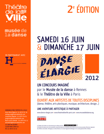 2 ÉDITION e SAMEDI 16 JUIN & DIMANCHE 17 JUIN EN PARTENARIAT AVEC 2012 UN CONCOURS IMAGINÉ par le Musée de la danse à Rennes & le Théâtre de la Ville à Paris OUVERT AUX ARTISTES DE TOUTES DISCIPLINES S (danse, théâtre, arts plastiques, musique, architecture, design…) COMMUNICATION THÉÂTRE DE LA VILLE Anne-Marie Bigorne 01 48 87 87 39 [email protected] Jacqueline Magnier 01 48 87 84 61 [email protected] Marie-Laure Violette 01 48 87 82 73 [email protected] 16, QUAI DE GESVRES 75180 PARIS CEDEX 04 Tél. 01 48 87 54 42 UNE AVENTURE ARTISTIQUE À PARTAGER www.danse-elargie.com I www.theatredelaville-paris.com I www.museedeladanse.org AVEC LE SOUTIEN DE LA Le Théâtre de la Ville est subventionné par la Mairie de Paris. Le Musée de la danse est une association subventionnée par le ministère de la Culture et de la Communication (Direction régionale des Affaires Culturelles / Bretagne), la ville de Rennes, le conseil régional de Bretagne et le conseil général d’Ille-et-Vilaine. Le plateau comme espace de rencontres et d’expérimentation entre les arts Danse élargie, concours imaginé ensemble par Boris Charmatz et Emmanuel DemarcyMota, respectivement directeurs du Musée de la danse à Rennes et du Théâtre de la Ville à Paris, appelle des artistes de tous bords et de toutes disciplines à imaginer le plateau comme espace de rencontres et d’expéri mentation entre les arts. Avec pour seules règles une durée (10 minutes maximum) et un nombre d’interprètes (3 au minimum). La première édition en juin 2010 fut un suc cès au-delà de toute attente : 360 projets venus de 22 pays, dont 20 sélectionnés pour le concours suscitant des débats passionnés au sein du jury et 5 prix décernés. L’attention portée aux candidats ne se limite pas aux deux journées du concours, puis que la plupart de ces artistes ont été suivis et certains accompagnés jusqu’à la produc tion d’une nouvelle pièce. 6 projets ont donné lieu à des résidences au Musée de la danse et à un mois entier de programmation au Théâtre de la Ville-les Abbesses en septembre 2011. La Fondation d’entreprise Hermès soutient et accompagne au plus près les deux temps du projet, le concours et la programmation qui lui fait suite. Danse élargie est une aventure unique qui cherche à résister à toute forme de norma lisation culturelle et à provoquer le débat. 2e édition DANSE ÉLARGIE 2012 Appel à projet t Danse élargie est un concours ouvert aux artistes de toutes disciplines (danse, théâtre, arts plastiques, musique, architecture, design…). Danse élargie est destiné à ouvrir grand les portes du théâtre. Danse élargie emprunte la forme du concours et espère être un essai collectif où le partage importe autant que la sélection. EN 2010 250 personnes ont rempli méthodiquement la scène puis l’ont quittée en 10 minutes. Une improvisation mal ficelée a tourné au miracle. 6 danseurs hip-hop ont évolué en silence et à l’unisson. Une déesse égyptienne a dansé avec Dick Rivers et des alligators. Un batteur a joyeusement fracassé ses 400 baguettes de plâtre. Un vrai mouton a avalé les mots de l’auteur. 4 garçons ont dansé dans le vent. Des robots tout droit sortis de San Ku Kaï ont envahi le plateau. Des créatures masquées et perruquées ont aguiché le public. « Tu danses ou tu meurs » : un concours s’est invité dans le concours. Des dan seurs genevois ont sondé les abîmes vocaux de Diamanda Galás. 6 adorateurs en gre nouillère rouge ont pratiqué le rituel d’un nouveau théisme. On n’a pas eu le temps de comprendre par où passaient les gestes de 3 danseurs guidés par leurs neurones miroirs. De faux cowboys ont dansé. Un acteur a dit : « En scène il n’y a pas Tous, il n’y a pas Tous en scène, en scène il n’y a que les morts ». Une équipe des Beaux-Arts de Cergy a failli gagner à son propre jeu. Une danseuse de cabaret a présenté un numéro de burlesque italo-anglais. Une famille péruvienne a fait le voyage. Une jeune chorégra phe a peint 50 nus en extase devant la mort. 2 filles et 1 garçon en perruque se sont déhanchés sur la musique de Marin Marais. Et Claudia Triozzi a orchestré le tout en exquise maîtresse de cérémonie. EN 2012, COMME EN 2010 Il vous suffira d’avoir envie d’ooccuper le plateau du Théâtre de la Ville pour 10 minutes (au maximum) avec 3 interprètes (au minimum) pour nous soumettre un projet inédit. VOUS PENSEZ QUE LE THÉÂTRE DE LA VILLE A PERDU LA TÊTE ? VOUS PENSEZ QUE TOUTE IDÉE DE CONCOURS EST À VOMIR ? MAIS VOUS AVEZ QUAND MÊME ENVIE DE VOIR CE QUE CELA POURRAIT BIEN DONNER ? VOUS AVEZ ENVIE DE FAIRE, DE VOIR, D’ASSISTER, DE TENTER LE COUP ? VOUS ÊTES LES BIENVENUS, ET NOUS SERONS RAVIS DE VOUS ACCUEILLIR. RÉGLEMENT ET FORMULAIRE D’INSCRIPTION à télécharger su w w w . d a n s e - e l a r g i e . c o m I N S C R I P T I O N J U S Q U ’ A U 2 1 M A R S S 2e édition DANSE ÉLARGIE 2012 Pour la beauté de l’essai Dans un vaisseau amiral comme le Théâtre de la Ville, avec une salle de 1000 places et une autre de 400 places, la question de l’expérimentation est aussi délicate que nécessaire. La politique artistique qui est la nôtre, centrée sur la création et la singularité de chaque auteur, qu’il soit dramatique ou chorégraphique, porte en elle-même une grande part de risques aussi bien esthétiques qu’éthiques. Ne pas se contenter d’organiser du déjà-vu, chercher toujours à révéler des œuvres et des auteurs est une façon de résister à toute forme de normalisation culturelle. Nous cherchons à favoriser la recherche et l’élaboration de formes et de formats nouveaux, nous tenons à défendre les artistes, assez nombreux dans les temps récents, capables de modifier les frontières entre les arts en inventan1t de nouvelles modalités et de nouvelles formes de leurs rencontres. Par là, nous revendiquons une place à l’inhabituel, à 