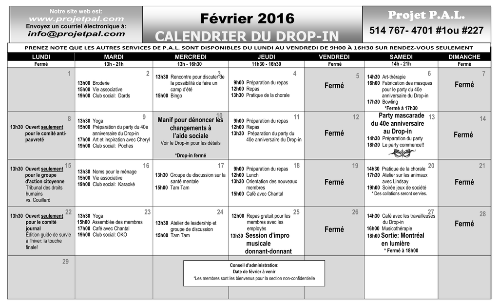 Projet P.A.L. Février 2016 CALENDRIER DU DROP-IN Notre site web est: www.projetpal.com Envoyez un courriel électronique à: [email protected] 514 767- 4701 #1ou #227 PRENEZ NOTE QUE LES AUTRES SERVICES DE P.A.L. SONT DISPONIBLES DU LUNDI AU VENDREDI DE 9H00 À 16H30 SUR RENDEZ-VOUS SEULEMENT LUNDI MARDI MERCREDI JEUDI VENDREDI SAMEDI DIMANCHE Fermé 13h - 21h 13h - 16h30 11h30 - 16h30 Fermé 14h - 21h Fermé 1 2 13h00 Broderie 15h00 Vie associative 19h00 Club social: Dards 8 13h30 Ouvert seulement pour le comité antipauvreté 9 13h30 Yoga 15h00 Préparation du party du 40e anniversaire du Drop-in 17h00 Art et inspiration avec Cheryl 19h00 Club social: Poches 13h30 Rencontre pour discuter3de la possibilité de faire un camp d'été 15h00 Bingo 10 Manif pour dénoncer les changements à l’aide sociale Voir le Drop-in pour les détails 4 9h00 Préparation du repas 12h00 Repas 13h30 Pratique de la chorale 5 Fermé 11 9h00 Préparation du repas 12h00 Repas 13h30 Préparation du party du 40e anniversaire du Drop-in 12 Fermé 6 14h30 Art-thérapie 16h00 Fabrication des masques pour le party du 40e anniversaire du Drop-in 17h30 Bowling *Fermé à 17h30 Party mascarade 13 du 40e anniversaire au Drop-in 14h30 Préparation du party 18h30 Le party commence!! 7 Fermé 14 Fermé *Drop-in fermé 13h30 Ouvert seulement pour le groupe d'action citoyenne Tribunal des droits humains vs. Couillard 15 22 13h30 Ouvert seulement pour le comité journal Édition guide de survie à l'hiver: la touche finale! 29 13h30 Noms pour le ménage 15h00 Vie associative 19h00 Club social: Karaoké 13h30 15h00 17h00 19h00 Yoga Assemblée des membres Café avec Chantal Club social: OKO 17 16 13h30 Groupe du discussion sur la santé mentale 15h00 Tam Tam 23 24 13h30 Atelier de leadership et groupe de discussion 15h00 Tam Tam 18 9h00 Préparation du repas 12h00 Lunch 13h30 Orientation des nouveaux membres 15h00 Café avec Chantal 12h00 Repas gratuit pour les membres avec les employés 13h30 Session d'impro 19 Fermé Conseil d'administration: Date de février à venir *Les membres sont les bienvenus pour la section non-confidentielle 21 Fermé * Des collations seront servies. 25 musicale donnant-donnant 14h30 Pratique de la chorale 20 17h30 Atelier sur les animaux avec Lindsay 19h00 Soirée jeux de société 26 Fermé 27 14h30 Café avec les travailleuses du Drop-in 16h00 Musicothérapie 18h00 Sortie: Montréal en lumière * Fermé à 18h00 28 Fermé F é v r i e r C a l e n d r i e r 2 0 1 6 d u D r o p - i n C’est où au juste P.A.L. ? 861 de l'Église, Verdun, QC H4G 2N3 PROJET PAL Party mascarade du 40e anniversaire au Drop-in - Samedi, 13 février: Vous êtes cordialement invités à venir célébrer le 40e anniversaire de PAL à notre party et danse sous le thème de la mascarade. Que vous portiez un masque ou non, nous garantissons du plaisir avec de la musique, de la danse et des jeux. De petites bouchées seront servies. Référez-vous au calendrier pour les opportunités de participation à la préparation de l'évènement, incluant un atelier de fabrication de masques le samedi, 6 février. Comme toujours, l'implication des membres est appréciée afin de préparer la salle et faire le ménage le jour du party! *Veuillez vous inscrire dans le Drop-in si vous comptez être présent Groupe de discussion sur la santé mentale - 17 février à 17h30: Voici un tout nouveau groupe de discussion au Drop-in afin de donner aux gens l'espace pour partager leur expérience en ce qui concerne leur expérience en santé mentale dans uncontexte de support et d'encouragement mutuel. 10 minutes de marche des stations de métro De l’Église ou Verdun Autobus 108 – Bannantyne, arrêt au coin de De l’Église et marchez au 861 Autobus 107 – Verdun, arrêt au coin de De l’Église et marchez au 861 Heures d’ouverture: Lundi Mardi Mercredi Jeudi Vendredi Samedi Dimanche Drop-in FERMÉ, mais bureaux ouverts 13h - 21h 13h - 16h30 11h30 - 16h30 Drop-in FERMÉ, mais bureaux ouverts 14h - 21h Drop-in FERMÉ Sortie: Planétarium et Biodôme - Samedi, 19 mars: Les billets seront en vente pour cette sortie à partir du mardi, 23 février jusqu'au mardi, 15 mars inclusivement au coût de 6,50$ pour les membres permanents et 9.00$ pour les membres temporaires et communautaires. Une opportunité à ne pas manquer, ce sera extraordinaire! Session d'impro-musicale donnant-donnant - Jeudi, 25 février à 1:30pm: Faites partie du plaisir et venez présenter une chanson ou deux à l'impromusicale! Que ce soit en solo ou duo vocal ou en jouant d'un instrument, tout le monde est le bienvenu! Il y aura une liste d'inscription dans le Drop-in pour les interessés. Musicothérapie - 27 février à 16h00: Venez participer à une séance de musicothérapie et profiter des bénéfices de la musique à travers l'improvisation et l'exploration musicale, relaxation à la musique et la composition de chansons et ce, dans une ambiance amusante, interactive et créative. Aucune expérience précédente en musique n'est requise! Pour plus d'informations, vous pouvez contacter P.A.L. : Téléphone : 514 767- 4701, #1 ou #227 Site web : www.projetpal.com Courriel : [email protected] ***Clinique d'impôts*** Février/Mars Restez à l'affût pour les détails de la clinique d'impôts de P.A.L.