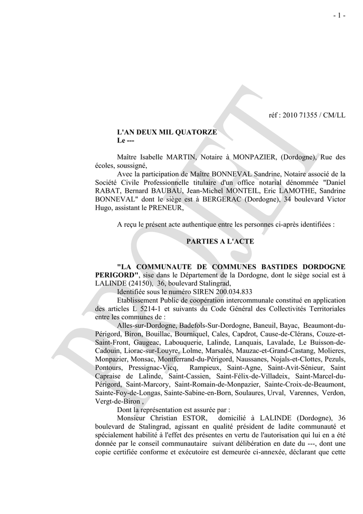 -1- réf : 2010 71355 / CM/LL L'AN DEUX MIL QUATORZE Le --Maître Isabelle MARTIN, Notaire à MONPAZIER, (Dordogne), Rue des écoles, soussigné, Avec la participation de Maître BONNEVAL Sandrine, Notaire associé de la Société Civile Professionnelle titulaire d'un office notarial dénommée "Daniel RABAT, Bernard BAUBAU, Jean-Michel MONTEIL, Eric LAMOTHE, Sandrine BONNEVAL" dont le siège est à BERGERAC (Dordogne), 34 boulevard Victor Hugo, assistant le PRENEUR, A reçu le présent acte authentique entre les personnes ci-après identifiées : PARTIES A L'ACTE "LA COMMUNAUTE DE COMMUNES BASTIDES DORDOGNE PERIGORD", sise dans le Département de la Dordogne, dont le siège social est à LALINDE (24150), 36, boulevard Stalingrad, Identifiée sous le numéro SIREN 200.034.833 Etablissement Public de coopération intercommunale constitué en application des articles L 5214-1 et suivants du Code Général des Collectivités Territoriales entre les communes de : Alles-sur-Dordogne, Badefols-Sur-Dordogne, Baneuil, Bayac, Beaumont-duPérigord, Biron, Bouillac, Bourniquel, Cales, Capdrot, Cause-de-Clérans, Couze-etSaint-Front, Gaugeac, Labouquerie, Lalinde, Lanquais, Lavalade, Le Buisson-deCadouin, Liorac-sur-Louyre, Lolme, Marsalés, Mauzac-et-Grand-Castang, Molieres, Monpazier, Monsac, Montferrand-du-Périgord, Naussanes, Nojals-et-Clottes, Pezuls, Pontours, Pressignac-Vicq, Rampieux, Saint-Agne, Saint-Avit-Sénieur, Saint Capraise de Lalinde, Saint-Cassien, Saint-Félix-de-Villadeix, Saint-Marcel-duPérigord, Saint-Marcory, Saint-Romain-de-Monpazier, Sainte-Croix-de-Beaumont, Sainte-Foy-de-Longas, Sainte-Sabine-en-Born, Soulaures, Urval, Varennes, Verdon, Vergt-de-Biron , Dont la représentation est assurée par : Monsieur Christian ESTOR, domicilié à LALINDE (Dordogne), 36 boulevard de Stalingrad, agissant en qualité président de ladite communauté et spécialement habilité à l'effet des présentes en vertu de l'autorisation qui lui en a été donnée par le conseil communautaire suivant délibération en date du ---, dont une copie certifiée conforme et exécutoire est demeurée ci-annexée, déclarant que cette -2- délibération a été publiée conformément à l’article 2131-1 du Code des Collectivités Territoriales et n’a fait l’objet d’aucun recours devant le Tribunal Administratif. Avis des domaines IL est ici précisé que ladite délibération du Conseil communautaire a été faite au vu de l'avis du directeur des services fiscaux établi le 27 février 2014, conformément aux dispositions de l'article L 2241-1 du Code Général des collectivités Territoriales t désignée ci-dessous par « le Propriétaire », D’une part Et "ASSOCIATION "LES PAPILLONS BLANCS" PARENTS ET AMIS DES HANDICAPES MENTAUX", Association déclarée à but non lucratif fondée le 14 mars 1967 (déclaration numéro 1201 au Journal Official du 8 avril 1967), affiliée à l'U.N.A.P.E.I sous le numéro 393 Ladite association immatriculée au SIREN sous le numéro 775.569.825 ayant son siège social à BERGERAC (24100), 6 avenue Paul Painlevé. Représentée par : Monsieur REY, Président de l'association, en vertu : --Et désignée ci-dessous par « L'OCCUPANT » D’autre part Présence - Représentation 1°) Le représentant susnommé de la personne morale dénommée sous le vocable "LE PROPRIETAIRE" est présent. 2°) Le représentant susnommé de la personne morale dénommée sous le vocable "L'OCCUPANT" est présent. FORME DES ENGAGEMENTS ET DECLARATIONS Les engagements souscrits et les déclarations faites ci-après seront toujours indiqués comme émanant directement des parties au présent acte, même s'ils émanent du représentant légal ou conventionnel de ces dernières. EXPOSE PREALABLE Préalablement à l'acte objet des présentes, il est exposé ce qui suit : Premièrement Aux termes d'un acte reçu par Maître Claude MARTIN, notaire à MONPAZIER (Dordogne) le 29 juin 2011, -3- La "COMMUNAUTE DE COMMUNES DU MONPAZIEROIS" (Dordogne), ayant son siège à MONPAZIER (24540), 1 rue Jean Galmot. Etablissement Public de commune constitué en application des articles L 1671 et suivants du Code des Communes, entre les communes de MONPAZIER, BIRON, CAPDROT, GAUGEAC, LAVALADE, LOLME, MARSALES, SAINT AVIT RIVIERE, SANT CASSIEN, SAINT MARCORY, SAINT ROMAIN, SOULAURES et VERGT DE BIRON Identifiée sous le numéro SIREN 242 400 679, A acquis de : La Congrégation dite "LA CONGREGATION DES SOEURS DE SAINTE MARTHE DE PERIGUEUX", dont le siège est à TRELISSAC (24750), 181 avenue Michel Grandou, et ayant existence légale en vertu des décrets en date des 13 novembre 1810 et 8 novembre 1852 portant reconnaissance légale de la Congrégation des sœurs de Sainte Marthe de Périgueux (Dordogne), du décret du 10 novembre 2006 modifiant les statuts de ladite congrégation, Identifiée au SIREN sous le numéro 781 712 401 00038. Le bien dont la désignation suit : Commune de MONPAZIER (Dordogne) Un ensemble immobilier situé à MONPAZIER (24540), Le Bourg. Ledit ensemble comprenant : - un terrain constructible, - un garage, une remise de jardin et un petit pavillon originairement à usage de chambre et de remise, lesdits biens destinés pour partie à être démolis Ledit immeuble devant figurer au cadastre sous les références suivantes : Préfixe Section N° Adresse ou lieudit Contenance AC 210 Le Bourg (jardin) 07 a 49 ca AC 211 Le Bourg (jardin) 02 a 34 ca AC 221 Le Bourg (sol) 02 a 74 ca AC 618 Le Bourg (jardin) 02 a 03 ca AC 621 Le Bourg (sol) AC 622 Le Bourg (terre) AC 624 6 rue Galmot (sol) 57 ca 01 a 39 ca 44 ca Contenance totale 17 a 00 ca Cette vente a été consentie et acceptée moyennant le prix principal de VINGT MILLE EUROS (20.000,00 €) que la communauté des communes du Monpazierois s'obligeait à payer ce prix aussitôt après l'accomplissement de la formalité de publicité foncière. Lequel prix a été entièrement réglé à ce jour. Une expédition de cet acte a été p
