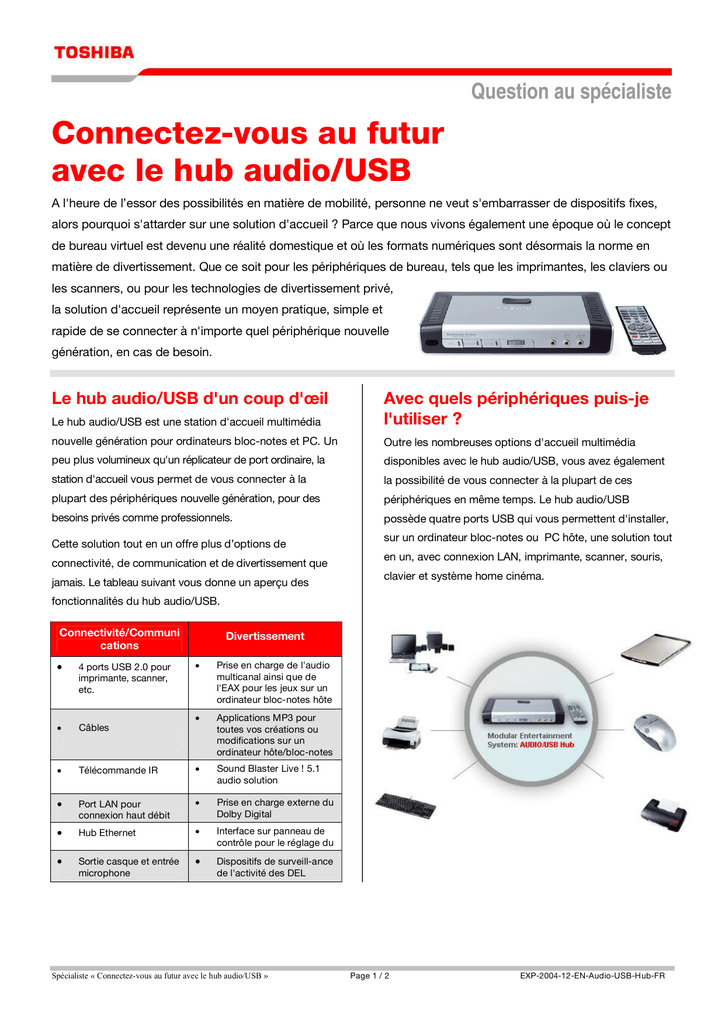 Question au spécialiste Connectez-vous au futur avec le hub audio/USB A l'heure de l’essor des possibilités en matière de mobilité, personne ne veut s'embarrasser de dispositifs fixes, alors pourquoi s'attarder sur une solution d'accueil ? Parce que nous vivons également une époque où le concept de bureau virtuel est devenu une réalité domestique et où les formats numériques sont désormais la norme en matière de divertissement. Que ce soit pour les périphériques de bureau, tels que les imprimantes, les claviers ou les scanners, ou pour les technologies de divertissement privé, la solution d'accueil représente un moyen pratique, simple et rapide de se connecter à n'importe quel périphérique nouvelle génération, en cas de besoin. Le hub audio/USB d'un coup d'œil Le hub audio/USB est une station d'accueil multimédia Avec quels périphériques puis-je l'utiliser ? nouvelle génération pour ordinateurs bloc-notes et PC. Un Outre les nombreuses options d'accueil multimédia peu plus volumineux qu'un réplicateur de port ordinaire, la disponibles avec le hub audio/USB, vous avez également station d'accueil vous permet de vous connecter à la la possibilité de vous connecter à la plupart de ces plupart des périphériques nouvelle génération, pour des périphériques en même temps. Le hub audio/USB besoins privés comme professionnels. possède quatre ports USB qui vous permettent d'installer, Cette solution tout en un offre plus d’options de connectivité, de communication et de divertissement que jamais. Le tableau suivant vous donne un aperçu des sur un ordinateur bloc-notes ou PC hôte, une solution tout en un, avec connexion LAN, imprimante, scanner, souris, clavier et système home cinéma. fonctionnalités du hub audio/USB. Connectivité/Communi cations Divertissement · Prise en charge de l'audio multicanal ainsi que de l'EAX pour les jeux sur un ordinateur bloc-notes hôte · Applications MP3 pour toutes vos créations ou modifications sur un ordinateur hôte/bloc-notes Télécommande IR · Sound Blaster Live ! 5.1 audio solution · Port LAN pour connexion haut débit · Prise en charge externe du Dolby Digital · Hub Ethernet · · Sortie casque et entrée microphone · Interface sur panneau de contrôle pour le réglage du volume Dispositifs de surveill-ance de l'activité des DEL · 4 ports USB 2.0 pour imprimante, scanner, etc. · Câbles · Spécialiste « Connectezvous au futur avec le hub audio/USB » Page 1 / 2 EXP200412ENAudioUSBHubFR Question au spécialiste Options d'accueil Système home cinéma Imprimante Avantage „ „ découvrir vos clips vidéo et vos films préférés en DVD en Dolby Surround (version 5.1). Vous pouvez également Découvrez le nec plus ultra du regarder vos clips vidéo au son Surround sur votre divertissement numérique téléviseur. Imprimez vos documents et vos Amateur de flexibilité ? - Avec le hub audio/USB, photos en un seul clic modifiez vos préférences aussi souvent que vous le souhaitez et utilisez une souris et/ou un clavier quand cela „ Scannez vos images ou vos vous chante. documents pour les afficher Scanner Clavier Souris „ „ rapidement, les stocker, les Fatigué des fils ? - Simplifiez la gestion des fils grâce à envoyer ou les imprimer la première station d'accueil destinée aux séries Qosmio et directement Satellite. Faites de votre ordinateur Papa/maman poule ? - Scannez vos images et portable un ordinateur de bureau photos préférées et envoyez-les immédiatement par Choisissez vos préférences de „ D'autres périphériques peuvent être connectés à votre Autres périphériques pour usage privé ou professionnel ordinateur bloc-notes, que ce soit pour un usage professionnel organisez une soirée projection en famille. Vous travaillez chez vous ? - Installez votre bureau à domicile en connectant votre ordinateur bloc-notes hôte à une imprimante, un scanner, un clavier, une souris ou tout autre appareil de bureau. (scanner de cartes de visite), ou Envie de détente ? - Asseyez-vous confortablement et à titre de divertissement privé laissez-vous porter par votre solution d'accueil tout en un (joystick ou projecteur) en n'utilisant qu'une simple télécommande. Tirez le meilleur profit de votre hub audio/USB Vous doutez encore que la solution d'accueil soit vraiment celle que vous recherchiez ? Prenons quelques exemples afin d'illustrer l'utilisation optimale que vous pouvez faire du nouveau hub audio/USB. Joueur invétéré ? - La solution d'accueil vous permet de connecter votre ordinateur hôte à un joystick, une souris, un clavier, ainsi qu'à un système de haut-parleurs, afin que vous puissiez vous plonger totalement dans vos univers de jeu préférés, grâce à l'audio multicanal et à l'EAX. Cinéphile compulsif ? - Vous pouvez connecter votre ordinateur bloc-notes à un système home cinéma et Spécialiste « Connectezvous au futur avec le hub audio/USB » Page 2 / 2 EXP200412ENAudioUSBHubFR © 2004. Toshiba Europe GmbH. Même si, au moment de la publication, Toshiba a tout mis en œuvre pour assurer la véracité des informations fournies, les spécifications, configurations, tarifs, systèmes, composants ou options des produits sont sujets à modification sans préavis. Pour connaître les toutes dernières informations concernant votre ordinateur ou les différentes options informatiques logicielles et matérielles, visitez le site Web de Toshiba à l'adresse pcsupport.toshiba.com. travail courrier électronique à vos proches, imprimez-les ou