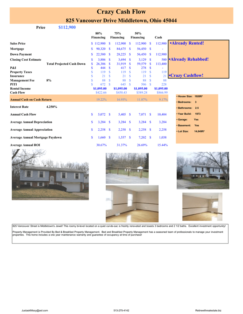Crazy Cash Flow 825 Vancouver Drive Middletown, Ohio 45044 $112,900 Price 80% Financing 75% Financing 50% Financing Cash Sales Price $ 112,900 $ 112,900 $ 112,900 $ Mortgage $ 90,320 $ 84,675 $ 56,450 $ Down Payment $ 22,580 $ 28,225 $ 56,450 $ 112,900 $ $ $ $ $ $ $ 3,806 26,386 444 119 21 88 672 $1,095.00 $422.66 $ $ $ $ $ $ $ 3,694 31,919 417 119 21 88 645 $1,095.00 $450.43 $ $ $ $ $ $ $ 3,129 59,579 278 119 21 88 506 $1,095.00 $589.28 $ $ $ $ $ $ $ 500 113,400 119 21 88 228 $1,095.00 $866.99 Closing Cost Estimate Total Projected Cash Down P&I Property Taxes Insurance Management Fee PITI Rental Income Cash Flow 8% 112,900 ▪Already Rented! - ▪Already Rehabbed! ▪Crazy Cashflow! • House Size: 1926ft² 19.22% Annual Cash on Cash Return Interest Rate 16.93% 11.87% 9.17% 4.250% Annual Cash Flow $ 5,072 $ 5,405 $ 7,071 $ 10,404 Average Annual Depreciation $ 3,284 $ 3,284 $ 3,284 $ 3,284 Average Annual Appreciation $ 2,258 $ 2,258 $ 2,258 $ 2,258 Average Annual Mortgage Paydown $ 1,660 $ 1,557 $ 7,202 $ 1,038 Average Annual ROI 30.67% 31.37% 26.69% • Bedrooms: 3 • Bathrooms: 2.5 • Year Build: 1973 • Garage: Yes • Basement: Yes • Lot Size: 14,649ft² 15.44% 825 Vancouver Street is Middletown's Jewel! This roomy bi-level located on a quiet cul-de-sac is freshly renovated and boasts 3 bedrooms and 2 1/2 baths. Excellent investment opportunity! Property Management is Provided By Bed & Breakfast Property Management. Bed and Breakfast Property Management has a seasoned team of professionals to manage your investment properties. This home includes a one year maintenance warranty and guarantee of occupancy at time of purchase! [email protected] 513-275-4142 Retirewithrealestate.biz