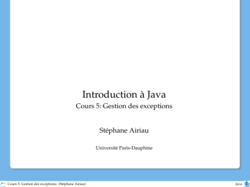 Introduction à Java Cours 5: Gestion des exceptions Stéphane Airiau Université Paris-Dauphine Cours 5: Gestion des exceptions– (Stéphane Airiau) Java 1 Gestion des Exceptions Gérer l’inattendu ! Cours 5: Gestion des exceptions– (Stéphane Airiau) Java 2 Exemple 1 2 3 4 5 public static Random generator = new Random(); public static int randInt(int low, int high){ return low + (int) (generator.nextDouble() * (high-low +1)); } Que se passe-t-il si l’utilisateur écrit randInt(10,5); On pourrait modifier le code de randInt pour prendre en compte ce type d’erreur (mais peut être que l’utilsateur a fait une erreur d’interprétation plus profonde...) Cours 5: Gestion des exceptions– (Stéphane Airiau) Java 3 Exemple (suite) Java nous permet de lever une exception adaptée, par exemple : if (low > high) throws new IllegalArgumentException( ”low should be <= high but low is ” + low + ” and high is ” + high); On lève une exception d’une classe qui porte un nom parlant IllegalArgumentException avec un message qui aidera au deboggage. Quand une exception est levée, l’exécution ”normale” est interrompue. Le contrôle de l’exécution passe à un gestionnaire d’erreur. Cours 5: Gestion des exceptions– (Stéphane Airiau) Java 4 Gestion des erreurs Java possède un mécanisme de gestion des erreurs, ce qui permet de renforcer la sécurité du code. On peut avoir différents niveaux de problèmes : java.lang.Object java.lang.Throwable java.lang.Error java.lang.Exception java.lang.RunTimeException sous classes sont sous classes sont unchecked exceptions checked exceptions Error représente une erreur grave intervenue dans la machine virtuelle (par exemple OutOfMemory) La classe Exception représente des qui sont reportées au développeur. ë le développeur a la possibilité de gérer de telles erreurs et éviter que l’application ne se termine ë on veut gérer les erreurs que l’on peut anticiper Cours 5: Gestion des exceptions– (Stéphane Airiau) Java 5 Gestion des erreurs java.lang.Object java.lang.Throwable java.lang.Error java.lang.Exception java.lang.RunTimeException sous classes sont sous classes sont unchecked exceptions checked exceptions checked Exception représente des cas où on peut anticiper le problème (par exemple entrée-sortie). RunTimeException ne peuvent pas être vérifiée lors de la compilation plutôt des erreurs causées par le programmeur (NullPointerException) que des erreurs causées par une source incontrolable (ex entrée-sortie). Cours 5: Gestion des exceptions– (Stéphane Airiau) Java 6 Gestion des erreurs Utilisez des exceptions pour des conditions exceptionnelles checked exception : conditions pour lesquelles on peut raisonnablement espérer pouvoir récupérer et poursuivre l’exécution ë force le développeur à gérer une condition exceptionnelle (éviter qu’il ne la néglige trop) ë “exception d’utilisation” : ces erreurs doivent être déclarées dans la signature de la fonction si elles ne sont pas capturées par la fonction. running time exception : indique une erreur de programmation NullPointerException est “unchecked” (sinon, il faudra toujours traiter cette erreur car elle peut intervenir partout !) Cours 5: Gestion des exceptions– (Stéphane Airiau) Java 7 Code reuse : utilisez au plus les exceptions de la bibliothèque standard IllegalArgumentException : argument dont la valeur n’est pas appropriée IllegalStateException l’objet n’est pas “prêt” pour faire cet appel . . . on pourrait utiliser seulement ces deux exceptions car la plupart des erreurs correspondent à un argument ou un état illégal NullPointerException IndexOutOfBoundsException ArithmeticException NumberFormatException pas une science exacte : ex : on possède une méthode pour tirer au sort k dominos dans la pioche, k étant un argument de ma méthode. Supposons qu’un utilisateur demande de tirer k dominos alors qu’il y a k − 1 dominos dans la pioche. On peut utiliser IllegalArgumentException : k est trop grand IllegalStateException pas assez de dominos dans la pioche Cours 5: Gestion des exceptions– (Stéphane Airiau) Java 8 Déclarer des checked exceptions On peut utiliser une clause throws pour déclarer une méthode dont on peut anticiper l’échec. public void write(Object obj, String filename) throws IOException, ReflectiveOperationException Dans la déclaration, on peut grouper les erreurs dans une super classe, ou bien les lister. Dans l’exemple, on lève des exceptions de type IO, mais on pourrait nommer plus précisemment toutes les types possibles (sous classes de IOException). Cours 5: Gestion des exceptions– (Stéphane Airiau) Java 9 Levée d’exception Lors de la détection d’une erreur un objet qui hérite de la classe Exception est créé ë ce qui s’appelle lever une exception l’exception est propagé à travers la pile d’exécution jusqu’à ce qu’elle soit traitée. 1 2 int[] tab = new int[5]; tab[5]=0; Exception in thread "main" java.lang.ArrayIndexOutOfBoundsException: 5 at Personnage.main(Personnage.java:2) 1 2 int d=10,t1=5,t2=5; System.out.println("vitesse:" + d / (t2-t1)); Exception in thread "main" java.lang.ArithmeticException: / by zero at Personnage.main(Personnage.java:21) Dans ces exemples, l’application s’est terminée ! Cours 5: Gestion des exceptions– (Stéphane Airiau) Java 10 Le bloc try . . . catch bloc try : le code qui est susceptible de produire des erreurs on récupère l’exception créée avec le catch. on peut avoir plusieurs blocs catch pour capturer des erreurs de types différentes. en option, on peut ajouter un bloc finally qui sera toujours exécuté (qu’une exception ait été levée ou non) Lorsqu’une erreur survient dans le bloc try, la suite des instructions du bloc est abandonnée les clauses catch sont testés séquentiellement le premier bloc catch correspondant à l’erreur est exécuté. ë l’ordre des blocs catc