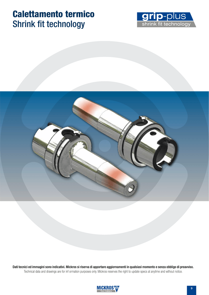 Calettamento termico Shrink fit technology Dati tecnici ed immagini sono indicativi. Mickros si riserva di apportare aggiornamenti in qualsiasi momento e senza obbligo di preavviso. Technical data and drawings are for inf ormation purposes only. Mickros reserves the right to update specs at anytime and without notice. 9 Calettamento termico Shrink fit technology Nuove applicazioni del sistema di fissaggio a caldo New shrink fixing system applications Il calettamento a caldo è una tecnica nota fin dall’antichità nel campo degli accoppiamenti permanenti. Oggi sono finalmente disponibili sul mercato sistemi per il bloccaggio reversibile di utensili da taglio a gambo cilindrico su mandrini portautensili per lavorazioni ad alta velocità. Per ottenere un bloccaggio efficace e sicuro, occorre ridurre al minimo il tempo di dilatazione dei portautensili. Il riscaldamento induttivo con campo energetico elevato consente di effettuare il cambio dell’utensile in pochi secondi. Questo sistema di bloccaggio garantisce prestazioni straordinarie nelle lavorazioni ad alta velocità, dove sono richiesti valori ottimali della concentricità e della coppia di serraggio. Il bloccaggio dell’utensile nel mandrino si basa fondamentalmente sulla variazione volumetrica della struttura molecolare dell’acciaio, in funzione della temperatura.L’aumento della temperatura determina un proporzionale aumento del diametro interno del mandrino, che consente l’inserimento dell’utensile a gambo cilindrico. Dopo il raffreddamento il mandrino tornerà alla sua dimensione originale, creando su tutta la superficie di contatto un’elevata forza radiale di bloccaggio. Se la deformazione è compresa nel campo di elasticità del materiale di cui è costituito il mandrino, il processo può essere ripetuto da un punto di vista teorico infinite volte. I fattori fondamentali che regolano questo processo sono: il tempo di riscaldamento, la temperatura risultante ed il flusso di energia termica che attraversa il mandrino. Grazie al campo elettromagnetico localizzato, si ottiene velocemente la dilatazione voluta nell’area di bloccaggio del mandrino, trasferendo pochissima energia al portautensile. I corretti tempi di induzione e la precisa localizzazione del campo elettromagnetico, riducono in maniera significativa la propagazione del calore nel mandrino, con un conseguente riscaldamento contenuto dell’utensile rispetto ai tradizionali sistemi ad aria calda. La maggiore differenza di temperatura tra mandrino ed utensile consente un più facile smontaggio dell’utensile. Shrink coupling heating has been a well-known technique in the field of permanent couplings since antiquity. Today it’s finally available on the reversible blocking system market of cylindrical stem cutting tools on high speed work toolholder. To obtain effective and safe blocking, reducing to the minimum the expansion time of the toolholder is necessary. The inductive heating with high-energy field allows one to exchange the tools in just a few seconds. This blocking system guarantees extraordinary performance in high-speed manufacturing, where high values of concentricity and coupling tightening are required. The blocking of the tool in the spindle is based on the volumetric variation of steel’s molecular structure regarding temperature. The increase in temperature determines a proportional increase in the internal diameter of the spindle, which allows the insertion of the cylindrical stem tool. After cooling, the spindle will return to its original size, creating high radial blocking strength over the entire contact surface. If the deformation is included in the material’s elasticity field of which the spindle is made up, the process can theoretically be repeated endlessly. The fundamental factors that regulate this process are: the heating time, resulting temperature and the flow of thermal energy that crosses the spindle. Thanks to the localized electromagnetic field, the desired expansion in the spindle’s blocking area is quickly obtained while transferring very little energy to the toolholder. Correct induction times and the precise location of the electromagnetic field significantly reduce the heat propagation in the spindle, with resulting contained tool heating with respect to the traditional hot-air systems. The greater temperature difference between spindle and tool allows easier disassembly of the tool. Con l’utilizzo delle macchine ad induzione e dei mandrini Grip plus by Mickros, del tipo CT e CTP, è possibile montare e smontare a caldo utensili in acciaio super rapido e metallo duro. Grazie alla breve fase di riscaldamento del mandrino, l’utensile non ha il tempo di riscaldarsi, permettendo l’estrazione anche nel caso di coefficiente di dilatazione termica uguale a quello del mandrino. Utilizzando un acciaio legato resistente ad alte temperature e grazie all’applicazione di trattamenti termici sofisticati, il mandrino portautensili mantiene le proprie caratteristiche di precisione ed elasticità anche dopo un numero elevato di cicli. Le temperature massime che si registrano durante il riscaldamento, pari a circa 300°C-340°C, sono molto inferiori alla temperatura che potrebbe generare una variazione strutturale del materiale. Ecco perché il nostro slogan è “PRECISIONE NEL TEMPO”. With the use of the induction machines and Grip plus by Mickros CT and CTP spindles, mounting and dismantling shrink tools in quick super steel and hard metal is possible. Thanks to the spindle’s short heating phase the tool doesn’t have the time to heat up, allowing extraction also in the event of coefficient thermal expansion the same as that of the spindle. Using heat resistant rimmed steel and thanks the application of sophisticated thermal treatments, the toolbox spindle keeps its precise characteristics and elasticity even after many cycles. The maximum temperatures registered during the heating are somewhere around 300°C-340