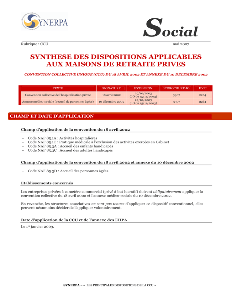 Social Rubrique : CCU mai 2007 SYNTHESE DES DISPOSITIONS APPLICABLES AUX MAISONS DE RETRAITE PRIVES CONVENTION COLLECTIVE UNIQUE (CCU) DU 18 AVRIL 2002 ET ANNEXE DU 10 DECEMBRE 2002 TEXTE SIGNATURE Convention collective de l’hospitalisation privée 18 avril 2002 Annexe médico-sociale (accueil de personnes âgées) 10 décembre 2002 EXTENSION N°BROCHURE JO IDCC 3307 2264 3307 2264 29/10/2003 (JO du 15/11/2003) 29/10/2003 (JO du 15/11/2003) CHAMP ET DATE D’APPLICATION Champ d’application de la convention du 18 avril 2002 - Code NAF 85.1A : Activités hospitalières Code NAF 85.1C : Pratique médicale à l’exclusion des activités exercées en Cabinet Code NAF 85.3A : Accueil des enfants handicapés Code NAF 85.3C : Accueil des adultes handicapés Champ d’application de la convention du 18 avril 2002 et annexe du 10 décembre 2002 - Code NAF 85.3D : Accueil des personnes âgées Etablissements concernés Les entreprises privées à caractère commercial (privé à but lucratif) doivent obligatoirement appliquer la convention collective du 18 avril 2002 et l’annexe médico-sociale du 10 décembre 2002. En revanche, les structures associatives ne sont pas tenues d’appliquer ce dispositif conventionnel, elles peuvent néanmoins décider de l’appliquer volontairement. Date d'application de la CCU et de l’annexe des EHPA Le 1er janvier 2003. SYNERPA – « LES PRINCIPALES DISPOSITIONS DE LA CCU » CONTENU L’ensemble des textes conventionnels applicables aux établissements pour personnes âgées privés à caractère commercial est donc constitué : • de la convention collective du 18 avril 2002 ; • de l’annexe du 10 décembre 2002 qui vient remplacer, pour certains articles, les dispositions de la convention du 18 avril 2002, et notamment la classification des emplois • le protocole de transposition spécifique aux établissements privés accueillant des personnes âgées (c'est-à-dire le passage d’une des 3 anciennes conventions FIEHP, UHP ou CRRR ou du Code du travail aux nouvelles dispositions de la CCU) • les grilles de transpostions CCU – anciennes conventions (UHP – FIEHP – CRRR) A ce texte, il convient d’ajouter : • L’accord de branche du 27 janvier 2000 sur la réduction et l’aménagement du temps de travail du secteur de l’hospitalisation privée et du secteur social et médico-social à caractère commercial : dispositions relatives à l’aménagement du temps de travail • les accords sur la formation professionnelle (accord du 22 décembre 1994, accord du 15 février 1996 et son avenant du 29 juillet 1997, et l’accord du 23 décembre 2004) : FORMAHP et CPNE DISPOSITIONS TEXTES DE REFERENCE Dispositions générales Champ d’application, durée, adhésion, dénonciation, … Convention du 18 avril 2002 Annexe du 10 décembre 2002 Droit syndical et liberté d’opinion Délégués syndicaux, crédit d’heures, … Convention du 18 avril 2002 Institutions représentatives du personnel Délégués du personnel, comité d’entreprise, CHSCT Convention du 18 avril 2002 Contrat de travail Recrutement, contenu du contrat, démission et licenciement, départ à la retraite Convention du 18 avril 2002 Accord RTT du 27/01/2000 (contrat de travail à temps partiel) Durée et aménagement du temps de travail Convention du 18 avril 2002 (équivalence, travail de nuit) Annexe du 10 décembre 2002 (repos hebdomadaire, compensation au travail de nuit) Accord RTT du 27/01/2000 (cycle, modulation, durée journalière, temps partiel, …) Congés Congés Payés, jours fériés, congés pour événements familiaux, congés pour enfants malades, congés maternité, … Rémunération Salaire conventionnel, ancienneté, primes de sujétions (nuit, dimanche, JF, astreinte, …) Convention du 18 avril 2002 Annexe du 10 décembre 2002 Convention du 18 avril 2002 Annexe du 10 décembre 2002 Prévoyance Maladie, incapacité, décès Convention du 18 avril 2002 Annexe du 10 décembre 2002 Formation professionnelle Convention du 18 avril 2002 Accord du 22/12/1994 Accord du 15/02/1996 Accord du 23/12/2004 Conditions de travail Convention du 18 avril 2002 Classification des emplois Annexe du 10 décembre 2002 Grilles de classification pour les EHPA Dispositions relatives aux cadres Convention du 18 avril 2002 Annexe du 10 décembre 2002 Mise en œuvre de la Convention et de l’annexe Protocole de transposition spécifique aux établissements accueillant des personnes âgées SYNERPA – « LES PRINCIPALES DISPOSITIONS DE LA CCU » 2 TABLEAU RECAPITULATIF Remarque Les articles mentionnés sont ceux de la convention collective du 18 avril 2002. Les articles « bis » résultent de l’annexe médico-sociale du 10 décembre 2002 qui concerne les établissements accueillant des personnes âgées. DISPOSITIONS CONTENU TITRE 2 : DROIT SYNDICAL ET LIBERTE D’OPINION Local syndical Art.12 > 500 salariés : mise à disposition d’un local par section syndicale spécifique et permanent > 150 salariés : mise à disposition d’un local commun spécifique et permanent < 150 salariés : mise à disposition périodique d’un local Crédit d’heures syndicales Art.15 20 à 49 salariés : 5 heures / mois 50 à 150 salariés : 10 heures/ mois 151 à 500 salariés : 15 heures/ mois > 500 salariés : 25 heures/ mois Délégué syndical central Art.15 20h / mois Absence pour raisons syndicales Art.18 / 19 Congé formation économique Art.21 Congrès et assemblées générales : 5 jours ouvrés par an dont 3 rémunérés par organisation Exercice d’un mandat électif : 5 jours ouvrés non rémunérés par an 0,025 % de la masse salariale brute TITRE 3 : INSTITUTIONS REPRESENTATIVES DU PERSONNEL Mise en place Art.23 / 24 / 25 / 26 / 27 Application des règles légales Voir fiche technique n°27 Attributions Art.28 / 29 / 30 / 31 / 32 Application des règles légales Voir fiche technique n°29 Moyens d’action Délégué du personnel Art.34 Moyens d’action Comité d’e