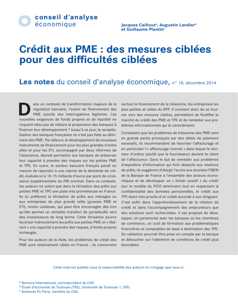 Jacques Caillouxa, Augustin Landierb et Guillaume Plantinc Crédit aux PME : des mesures ciblées pour des difficultés ciblées Les notes du conseil d’analyse économique, n° 18, décembre 2014 D ans un contexte de transformation majeure de la régulation bancaire, l’avenir du financement des PME suscite des interrogations légitimes. Les nouvelles exigences de fonds propres et de liquidité ne risquent-elles pas de réduire la propension des banques à financer leur développement ? Jusqu’à ce jour, la recapitalisation des banques françaises ne s’est pas faite au détriment des PME. Par ailleurs, le développement de nouveaux instruments de financement pour les plus grandes d’entre elles et pour les ETI, accompagné par deux réformes de l’assurance, devrait permettre aux banques de préserver leur capacité à prendre des risques sur les petites PME et TPE. En outre, le secteur bancaire français paraît en mesure de répondre à une reprise de la demande de crédit, évaluée ici à 10-15 milliards d’euros par point de croissance supplémentaire du PIB nominal. Dans ce contexte, les auteurs ne voient pas dans la titrisation des prêts aux petites PME et TPE une piste très prometteuse en France. Ils lui préfèrent la titrisation de prêts aux ménages ou aux entreprises de plus grande taille (grosses PME et ETI), moins coûteuse, qui peut être encouragée dès lors qu’elle permet un véritable transfert de portefeuille vers des investisseurs de long terme. Cette titrisation pourra favoriser indirectement les prêts aux petites PME en « libérant » une capacité à prendre des risques, à fonds propres inchangés. Pour les auteurs de la Note, les problèmes de crédit des PME sont relativement ciblés en France : ils concernent surtout le financement de la trésorerie, les entreprises les plus petites et celles du BTP. Il convient donc de se tourner vers des mesures ciblées, permettant de fluidifier le marché du crédit des PME et TPE et de remédier aux problèmes informationnels qui le caractérisent. Constatant que les problèmes de trésorerie des PME sont en grande partie provoqués par des délais de paiement excessifs, ils recommandent de favoriser l’affacturage et en particulier l’« affacturage inversé » dans lequel le donneur d’ordres (plutôt que le fournisseur) devient le client de l’affactureur. Dans le but de remédier aux problèmes d’asymétrie d’information qui font obstacle aux relations de prêts, ils suggèrent d’élargir l’accès aux données FIBEN de la Banque de France à l’ensemble des acteurs économiques et de développer un « fichier positif » du crédit (sur le modèle du FICO américain) tout en respectant la confidentialité des données personnelles, le crédit aux TPE étant très proche d’un crédit accordé à son dirigeant. C’est enfin dans l’approfondissement de la relation de crédit et dans l’accompagnement des emprunteurs que des solutions sont recherchées. Il est proposé de développer, en partenariat avec les banques ou les chambres de commerce, un outil de formation aux problématiques financières et comptables de base à destination des TPE. Sa validation pourrait être prise en compte par la banque et déboucher sur l’obtention de conditions de crédit plus favorables. Cette note est publiée sous la responsabilité des auteurs et n’engage que ceux-ci. a Nomura International, correspondant du CAE. École d’économie de Toulouse (TSE), Université de Toulouse 1, IDEI. c Sciences Po Paris, membre du CAE. b 2 Crédit aux PME : des mesures ciblées pour des difficultés ciblées Introduction Depuis le début de la crise financière à l’automne 2008, le nombre de défaillances d’entreprises – principalement des petites et moyennes entreprises (PME) – est d’environ 60 000 par an en France, contre environ 48 000 avant crise1. Il est tentant d’attribuer cette forte hausse des défaillances aux difficultés que rencontrent les PME dans leur accès aux financements et, plus particulièrement, au crédit bancaire. Cependant, la crise financière s’est rapidement transformée en crise économique, de sorte que nombre de défaillances sont dues à l’insuffisance des carnets de commande plutôt qu’à celle des financements. Il faut ainsi d’emblée distinguer la détresse financière d’une entreprise de sa non-viabilité économique. Une entreprise cesse d’être économiquement viable lorsque la somme actualisée de ses flux de revenus anticipés passe au-dessous de ses coûts. Bien sûr, le calcul est par nature incertain. Mais lorsque le constat de non-viabilité est établi, l’entreprise ne peut voir ses besoins financés autrement qu’à perte. La puissance publique peut vouloir retarder la fermeture de l’entreprise2, mais il s’agit alors d’une subvention, dont le montant ne sera pas recouvré. La situation est toute différente pour une entreprise économiquement viable, mais dont la création ou la continuation sont menacées par des contraintes financières liées à un mauvais fonctionnement du marché du crédit. Ainsi, une entreprise viable peut être temporairement illiquide si la poursuite de son activité requiert un financement externe immédiat qu’elle est quasiment sûre de pouvoir rembourser dans quelques mois. Si le système financier n’est pas en mesure de lui procurer ce financement, l’entreprise entre en situation de détresse financière. Une entreprise viable peut également devenir insolvable, si la valeur de ses actifs devient inférieure à celle de ses dettes. Il lui faut alors trouver le moyen de restructurer son bilan (c’est-à-dire de renégocier sa dette), ce qui implique que les créanciers et actionnaires « prennent leurs pertes », et nécessite donc un effort de coordination important et rapide de leur part. Dans les deux cas – illiquidité ou insolvabilité – l’entreprise est viable mais peut cesser de l’êt