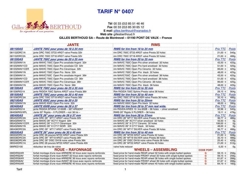 TARIF N° 0407 Tél 00 33 (0)3 85 51 46 46 Fax 00 33 (0)3 85 30 65 12 E mail [email protected] Web site gillesberthoud.fr GILLES BERTHOUD SA – Route de Montrevel – 01190 PONT DE VAUX – France 0800A JANTE RIMS 081100AS JANTE 700C pour pneu de 18 à 24 mm RIMS for tire from 18 to 24 mm Prix TTC Poids 081132DRC1A jante DRC 700C ST22 ARGT valve Presta 32tr rim DRC 700C ST22 ARGT valve Presta 32 holes 21,00 € 540g. 081132DRC2A jante DRC 700C ST18 ARGT valve Presta 32tr rim DRC 700C ST18 ARGT valve Presta 32 holes 21,00 € 486g. 081200AS JANTE 700C pour pneu de 20 à 25 mm RIMS for tire from 20 to 25 mm Prix TTC Poids 081232MAV1A 081232MAV1CD 081232MAV1CER 081232MAV1N 081236MAV1A 081236MAV1CD 081236MAV1CER 081236MAV1N jante MAVIC 700C Open Pro anodisée Argent 32tr jante MAVIC 700C Open Pro anodisée CD 32tr jante MAVIC 700C Open Pro Céramique 32tr jante MAVIC 700C Open Pro Noire 32tr jante MAVIC700C Open Pro anodisée Argent 36tr jante MAVIC 700C Open Pro anodisée CD 36tr jante MAVIC 700C Open Pro Céramique 36tr jante MAVIC 700C Open Pro Noire 36tr rim MAVIC 700C Open Pro silver anodised 32 holes rim MAVIC 700C Open Pro hard anodised 32 holes rim MAVIC 700C Open Pro Céramic 32 holes rim MAVIC 700C Open Pro black 32 holes rim MAVIC700C Open Pro silver anodised 36 holes rim MAVIC 700C Open Pro hard anodised 36 holes rim MAVIC 700C Open Pro Céramic 36 holes rim MAVIC 700C Open Pro black 36 holes 081300AS JANTE 700C pour pneu de 25 à 35 mm RIMS for tire from 25 to 35 mm 081336RIG1A jante RIGIDA 700C Sphinx ARGT valve Presta 36tr Rim RIGIDA 700C Sphinx Presta valve 36 holes 081500AS JANTE 700C pour pneu de 30 à 40 mm RIMS for tire from 30 to 40 mm 081536DRC3A jante DRC 700C ST19 ARGT valve Presta 36tr rim DRC 700C ST19 SILVER valve Presta 36 holes 082100AS JANTE 650C pour pneu de 20 à 25 RIMS for tire from 20 to 25mm 082132MAV1N jante MAVIC 650C Open Pro noire 32tr rim MAVIC 650C Open Pro black 32 holes 083400AS JANTE 650B pour pneu de 28 à 37 RIMS for tire from 28 to 37 mm real wide. 083436RIG1A 084036RIG/XPL jante RIGIDA SPHINX 12 650B – 36T ARGENT Jante 20" Rigida – X PLORER – noir 36 trs – rim RIGIDA ARIES 12- tire 650B – 36 holes – silver anodised RIMS 20" Rigida X PLORER – 36 holes 085400AS JANTE 26" pour pneu de 28 à 37 mm RIMS for tire from 28 to 37mm 085432DRC2A 085432MAV1A 085432MAV1CER 085432MAV1N 085436DRC2A jante DRC 26" MT17 ARGT valve Presta 32tr jante MAVIC 26" XC717 Argent 32tr jante MAVIC 26" X C717 Céramique 32tr jante MAVIC 26" X C717 NOIR 32tr jante DRC 26" MT17 ARGT valve Presta 36tr rim DRC 26" MT17 SILVER valve Presta 32 holes rim MAVIC 26" XC717 silver anodised 32 holes rim MAVIC 26" X C717 Céramic 32 holes rim MAVIC 26" X C717 black 32 holes rim DRC 26" MT17 SILVER valve Presta 36 holes 085500AS JANTE 26" pour pneu de 30 à 40 mm RIMS for tire from 30 to 40 mm 085532DRC1A 085536DRC3A 085536DRC4N 085540DRC1A jante DRC 26 pouces MT22 ARGT valve Presta 32tr jante DRC 26" MT19 ARGT valve Presta 36tr jante DRC 26" DISC DH18 noire valve Presta 36tr jante DRC 26 pouces MT22 ARGT valve Presta 40tr rim DRC 26" MT22 ARGT valve Presta 32 holes rim DRC 26" MT19 SILVER valve Presta 36 holes rim DRC 26" DISC DH18 noire valve Presta 36 holes rim DRC 26" MT22 ARGT valve Presta 40 holes 089RED100 réducteur de trou de valve valve hole reducer 0900A 090DIR32AR 090DIR32AV 090DIR36AR 090DIR36AV 090DIR40AR Tarif ROUE – RAYONNAGE forfait montage d'une roue ARRIERE 32 trous avec rayons renforcés forfait montage d'une roue AVANT 32 trous avec rayons renforcés forfait montage d'une roue ARRIERE 36 trous avec rayons renforcés forfait montage d'une roue AVANT 36 trous avec rayons renforcés forfait montage d'une roue ARRIERE 40 trous avec rayons renforcés WHEELS – ASSEMBLING fixed price for hand-made REAR wheel 32 holes with single butted spokes fixed price for hand-made FRONT wheel 32 holes with single butted spokes fixed price for hand-made REAR wheel 36 holes with single butted spokes fixed price for hand-made FRONT wheel 36 holes with single butted spokes fixed price for hand-made REAR wheel 40 holes with single butted spokes 1 43,50 51,00 99,00 48,00 43,50 51,00 99,00 48,00 € € € € € € € € 425g. 425g. 425g. 425g. 425g. 425g. 425g. 425g. Prix TTC Poids 28,15 € 564g. Prix TTC Poids 35,10 € 486g. Prix TTC Poids 48,00 € 390g. Prix TTC Poids 32,96 € 19,11 € 540g. 476g. Prix TTC Poids 36,77 43,50 106,00 48,00 36,77 € € € € € 486g. 0g. 0g. 0g. 486g. Prix TTC Poids 21,00 35,10 25,45 21,00 CODE PORT G G G G G € € € € 508g. 486g. 420g. 512g. 0,20 € 0g. 59,15 59,15 61,67 61,67 64,19 € € € € € 256g. 256g. 288g. 288g. 160g. 090DIR40AV 090DIR48AR 090DIR48AV 090LIG100 090RET28AR 090RET28AV 090RET32AR 090RET32AV 090RET36AR forfait montage d'une roue AVANT 40 trous avec rayons renforcés forfait montage d'une roue ARRIERE 48 trous avec rayons renforcés forfait montage d'une roue AVANT 48 trous avec rayons renforcés ligaturage des rayons pour une paire de roues forfait montage d'une roue ARRIERE 28 trous avec rayons rétreints forfait montage d'une roue AVANT 28 trous avec rayons rétreints forfait montage d'une roue ARRIERE 32 trous avec rayons rétreints forfait montage d'une roue AVANT 32 trous avec rayons rétreints forfait montage d'une roue ARRIERE 36 trous avec rayons rétreints fixed price for hand-made FRONT wheel 40 holes with single butted spokes fixed price for hand-made REAR wheel 48 holes with single butted spokes fixed price for hand-made FRONT wheel 48 holes with single butted spokes fixed price for hand-made spokes ligature (wheel pair) fixed price for hand-made REAR wheel 28 holes with double butted spokes fixed price for hand-made FRONT wheel 28 holes with double butted spokes fixed price for hand-made REAR wheel 32holes with double butted spokes fixed price for hand-made FRONT wheel 32holes with double butted spokes fixed price for hand-made REAR wheel 36holes with double butted spokes G G G 