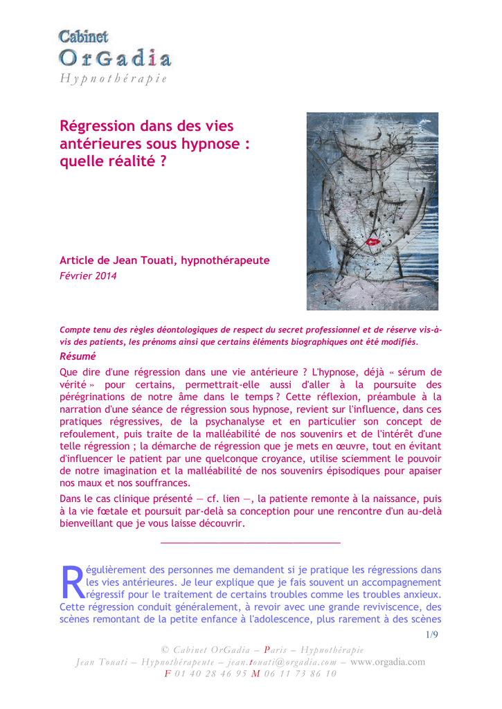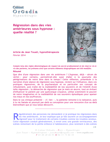 Hypnothérapie Régression dans des vies antérieures sous hypnose : quelle réalité ? Article de Jean Touati, hypnothérapeute Février 2014 Compte tenu des règles déontologiques de respect du secret professionnel et de réserve vis-àvis des patients, les prénoms ainsi que certains éléments biographiques ont été modifiés. Résumé Que dire d'une régression dans une vie antérieure ? L'hypnose, déjà « sérum de vérité » pour certains, permettrait-elle aussi d'aller à la poursuite des pérégrinations de notre âme dans le temps ? Cette réflexion, préambule à la narration d'une séance de régression sous hypnose, revient sur l'influence, dans ces pratiques régressives, de la psychanalyse et en particulier son concept de refoulement, puis traite de la malléabilité de nos souvenirs et de l'intérêt d'une telle régression ; la démarche de régression que je mets en œuvre, tout en évitant d'influencer le patient par une quelconque croyance, utilise sciemment le pouvoir de notre imagination et la malléabilité de nos souvenirs épisodiques pour apaiser nos maux et nos souffrances. Dans le cas clinique présenté — cf. lien —, la patiente remonte à la naissance, puis à la vie fœtale et poursuit par-delà sa conception pour une rencontre d'un au-delà bienveillant que je vous laisse découvrir. __________________________________ R égulièrement des personnes me demandent si je pratique les régressions dans les vies antérieures. Je leur explique que je fais souvent un accompagnement régressif pour le traitement de certains troubles comme les troubles anxieux. Cette régression conduit généralement, à revoir avec une grande reviviscence, des scènes remontant de la petite enfance à l'adolescence, plus rarement à des scènes 1/9 © C ab i ne t O r Ga d i a – P ar is – H y p no t h é r a p ie Je a n To u at i – H y p no t h é ra pe ut e – je a n . t o u at i @ o rg a d ia .c o m – www.orgadia.com F 0 1 4 0 2 8 4 6 9 5 M 0 6 1 1 73 8 6 1 0 Hypnothérapie de la vie fœtale et parfois plus « avant » encore. Je leur précise que cette démarche ne vise pas à rechercher, dans un évènement du passé, la cause d'un trouble mais à faire, en quelque sorte, un travail de « réparation » sur des évènements ayant laissé une empreinte émotionnelle néfaste. Souvent ces personnes sont soucieuses de savoir si je crois personnellement à la réalité des vies antérieures. Tout en leur précisant quel peut-être l'intérêt de cette démarche vis-à-vis de leur attente, je leur explique que je suis vigilant, autant que possible, à ce que mes propres croyances n’influencent pas mon approche thérapeutique. Je précisais dans l'article Hypnose éricksonienne : sa singularité que l'hypnose éricksonienne, contrairement à la plupart des approches psychothérapeutiques et en particulier la psychanalyse, ne se réfère pas à une théorie figée et unique des troubles psychopathologiques et de leur étiologie. Bien que la psychanalyse accorde peu d'intérêt à ce type de régression, les prémices de celle-ci, mettent en exergue certains facteurs agissant probablement dans ces régressions. Rappelons-nous qu'après avoir accordé, dans un premier temps, une réalité objective aux récits d'abus sexuels de ses patients, Freud comprit, dans un second temps, qu'il s'agissait de scénarios fantasmatiques : « Quand je dus reconnaître que ces scènes de séduction n’avaient jamais eu lieu, qu’elles n’étaient que des fantasmes imaginés par mes patients, imposés à eux peut-être par moi-même, je fus pendant quelque temps désemparé » (Freud, 1925 p.26). L'accumulation de cas de parents incestueux et de pervers sexuels dans la société viennoise en cette fin du 19ème siècle devenait, en effet, assez peu crédible. Mais plutôt que de simplement rejeter ces « faux souvenirs », Freud, le premier, réalisa leur importance dans l'économie psychique des patients. Il écrit : « Ces fantaisies possèdent une réalité psychique en opposition à la réalité matérielle et nous apprenons peu à peu à comprendre que dans le monde des névroses, la réalité psychique est la réalité déterminante » (Freud, 1916-1917). Il introduit ainsi cette notion de « réalité psychique » qu'il oppose à la réalité biographique. Cependant, s'il semble envisager qu'il ait pu, « sous la pression de son procédé technique », induire ces scènes d'abus sexuels, il conclut sans détour en disant : « Je ne crois pas encore aujourd'hui avoir imposé, "suggéré" à mes patients ces fantasmes de séduction » — il utilise ce terme pour abus sexuel infantile — (Freud, 1925). On retrouve pourtant dans ses textes des termes relevant davantage de l'extorsion. A l'époque de ses premières expériences thérapeutiques il écrit : « On ne réussit à réveiller la trace psychique de l’évènement sexuel précoce que sous la pression la plus énergique du procédé analyseur et contre une résistance énorme » (Freud, 1896), mais toujours 29 ans plus tard : « Il fallait déployer soi-même des efforts, afin de faire pression sur celui-ci [le patient] et de le contraindre » ou encore : « J'avais donc obtenu l'aveu de ces scènes » (Freud, 1925). Au-delà de ces processus coercitifs, ses écrits témoignent également de mécanismes d'auto-persuasion : « Leur contenu [ces scènes] était incontestablement en rapport avec les symptômes » (Freud, ibid.). 2/9 © C ab i ne t O r Ga d i a – P ar is – H y p no t h é r a p ie Je a n To u at i – H y p no t h é ra pe ut e – je a n . t o u at i @ o rg a d ia .c o m – www.orgadia.com F 0 1 4 0 2 8 4 6 9 5 M 0 6 1 1 73 8 6 1 0 Hypnothérapie A propos de ces deux réflexions sur la réalité des évènements remémorés et sur l'influence du thérapeute, Stephanatos (2004) nous dit, tout de même et fort heureusement, qu'aujourd'hui : « Un grand nombre de psychanalystes admettent que, dans la p