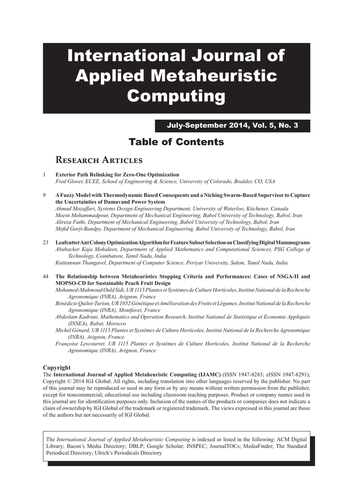 International Journal of Applied Metaheuristic Computing July-September 2014, Vol. 5, No. 3 Table of Contents Research Articles 1 Exterior Path Relinking for Zero-One Optimization Fred Glover, ECEE, School of Engineering & Science, University of Colorado, Boulder, CO, USA 9 A Fuzzy Model with Thermodynamic Based Consequents and a Niching Swarm-Based Supervisor to Capture the Uncertainties of Damavand Power System Ahmad Mozaffari, Systems Design Engineering Department, University of Waterloo, Kitchener, Canada Moein Mohammadpour, Department of Mechanical Engineering, Babol University of Technology, Babol, Iran Alireza Fathi, Department of Mechanical Engineering, Babol University of Technology, Babol, Iran Mofid Gorji-Bandpy, Department of Mechanical Engineering, Babol University of Technology, Babol, Iran 23 LeafcutterAnt Colony Optimization Algorithm for Feature Subset Selection on Classifying Digital Mammograms Abubacker Kaja Mohideen, Department of Applied Mathematics and Computational Sciences, PSG College of Technology, Coimbatore, Tamil Nadu, India Kuttiannan Thangavel, Department of Computer Science, Periyar University, Salem, Tamil Nadu, India 44 The Relationship between Metaheuristics Stopping Criteria and Performances: Cases of NSGA-II and MOPSO-CD for Sustainable Peach Fruit Design Mohamed-Mahmoud Ould Sidi, UR 1115 Plantes et Systèmes de Culture Horticoles, Institut National de la Recherche Agronomique (INRA), Avignon, France Bénédicte Quilot-Turion, UR 1052 Génétique et Amélioration des Fruits et Légumes, Institut National de la Recherche Agronomique (INRA), Montfavet, France Abdeslam Kadrani, Mathematics and Operation Research, Institut National de Statistique et Economie Appliquée (INSEA), Rabat, Morocco Michel Génard, UR 1115 Plantes et Systèmes de Culture Horticoles, Institut National de la Recherche Agronomique (INRA), Avignon, France Françoise Lescourret, UR 1115 Plantes et Systèmes de Culture Horticoles, Institut National de la Recherche Agronomique (INRA), Avignon, France Copyright The International Journal of Applied Metaheuristic Computing (IJAMC) (ISSN 1947-8283; eISSN 1947-8291), Copyright © 2014 IGI Global. All rights, including translation into other languages reserved by the publisher. No part of this journal may be reproduced or used in any form or by any means without written permission from the publisher, except for noncommercial, educational use including classroom teaching purposes. Product or company names used in this journal are for identification purposes only. Inclusion of the names of the products or companies does not indicate a claim of ownership by IGI Global of the trademark or registered trademark. The views expressed in this journal are those of the authors but not necessarily of IGI Global. The International Journal of Applied Metaheuristic Computing is indexed or listed in the following: ACM Digital Library; Bacon’s Media Directory; DBLP; Google Scholar; INSPEC; JournalTOCs; MediaFinder; The Standard Periodical Directory; Ulrich’s Periodicals Directory