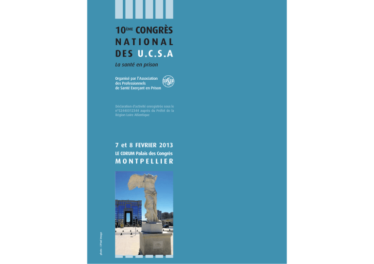 10ÈME CONGRÈS NATIONAL DES U C S A La santé en prison Organisé par l’Association des Professionnels de Santé Exerçant en Prison 7 et 8 FEVRIER 2013 LE CORUM Palais des Congrès photo : ©Pixel Image MONTPELLIER PROGRAMME Jeudi 7 Février ÉDITO DOUBLE DIX À MONTPELLIER 08H30 – 09H15 ACCUEIL DES PARTICIPANTS Sans aucune superstition, mais avec sérieux, nous sommes heureux de vous accueillir à Montpellier les 7 et 8 février 2013 pour le 10ème Congrès National des UCSA, et ce, 10 ans après le 4ème Congrès qui a eu lieu en 2003 à Montpellier. Ce dixième congrès reflète bien la dynamique de l'Association des Professionnels de Santé Exerçant en Prison (APSEP), pour une reconnaissance de notre spécificité et de notre engagement quotidien. Bientôt nous fêterons aussi les 20 ans d'existence "juridique" des UCSA (loi 1994), et ce passage de l'adolescence à l'âge adulte sera une étape clef pour l'ensemble des Professionnels de Santé exerçant en milieu carcéral de s'approprier, de garantir, dans les meilleurs conditions les missions qui leur sont confiées. Les débats et l'interaction entre tous les participants seront favorisés et souhaités par l'organisation : pendant la communication des actualités (CPU, guide méthodologique, partage d'information…) et aussi pendant les sessions orales, où le nombre de communications sera réduite afin d'augmenter les temps d'échanges. La soirée de Gala sera une surprise et nous espérons que vous serez nombreux à venir partager ce moment de convivialité pour fêter ses dix étoiles. Enfin, nous clôturerons ce congrès par une session internationale, chère à l'APSEP, en accueillant le Sénégal, l'Algérie et un consortium Européen. La réussite de ce congrès se fera avec vous, votre participation témoignant de votre engagement dans ce milieu d'enfermement si particulier. Dr Fadi MEROUEH 09H15 – 10H00 ALLOCUTIONS D’OUVERTURE Salle Pasteur Le Le Le Le Le Le Le Le Maire de Montpellier ou son représentant Directeur de l'ARS ou son représentant Directeur Général du CHU de Montpellier ou son représentant représentant du Conseil Général représentant du Conseil Régional représentant de la Direction Inter-Régionale des Services Pénitentiaires Président de l'APSEP Chef de service de l’UCSA de Montpellier 10H00 – 10H45 ACTUALITÉS : 1ère Partie Salle Pasteur Modérateur : V. BRULET Avec les représentants du Ministère de la Santé et de la Justice (sous réserve) 10H45 – 11H15 PAUSE 11H15 – 12H00 ACTUALITÉS : 2ème Partie Salle Pasteur Modérateur : F. MOREAU Avec les représentants du Ministère de la Santé et de la Justice (sous réserve) 12H15 – 13H00 SYMPOSIUM RECKITT BENKISER PHARMACEUTICALS Salle Pasteur ADDICTIONS AUX OPIACÉS EN MILIEU CARCÉRAL : REGARD SUR UNE NOUVELLE ALTERNATIVE Dr. Saman SARRAM (Psychiatre - Bordeaux) - Dr Fadi Meroueh (Médecin Généraliste - UCSA Montpellier) Comité Scientifique 13H00 – 14H15 DÉJEUNER 14H15 – 14H45 INTERVENTION DE MONSIEUR JM DELARUE Salle Pasteur Contrôleur Général des Lieux Privatifs de Liberté. Dr. Patrick SERRE Dr. Valérie KANOUI Dr. Virginie BRULET Dr. Fabienne LE MONNIER Dr. Laura HARCOUËT Dr. Anne BÉCART Dr. Emeline CHAIGNE Pr. Valery HÉDOUIN Dr. Fadi MEROUEH Dr. François MOREAU 14H45 - 16H00 SESSION 1 Salle Pasteur Modérateurs : V. KANOUI, JM. QUIGNARD 1 Le soin IDE au sens large : prévenir – dépister – éviter : exemple de la prise en soins des patients diabétiques et du dépistage dans le cadre du plan cancer. P. JAOUL, N. LEMOINE (Villeneuve les Maguelonne) 2 Rôle et engagement de l'infirmier dans les actions d'éducation à la santé à partir d'une expérience depuis de nombreuses années.dans une U.C.S.A. B. CHAUFFRAY (Saint Quentin Fallavier) 3 Organisation, bilan et évaluation d’une consultation de suivi des patients détenus en maison d’arrêt. B. DUMOUILLA, S. DURIEUX (Versailles) PROGRAMME Jeudi 7 Février PROGRAMME Vendredi 8 Février 08H30 - 09H45 SESSION 5 Salle Pasteur SESSION 2 Salle Antigone Modérateurs : P. BEAUPERE, L. HARCOUET 1 Prise en charge des patients diabétiques insulinodépendants en milieu pénitentiaire en France en 2012. C. BUCHAILLET, D. MAUILLON, N. JOUSE, C. ROUGÉ-MAILLART (Angers) Modérateurs : A. LEBON HUBERT, D. MAUILLON 1 Les enjeux et les défis de la prise en charge du VIH en milieu carcéral aujourd’hui. Dr V. FAUCHERRE (Villeneuve les Maguelonne) 2 Le patient atteint du VHC en prison a t il une perte de chance ? Dr F. MEROUEH, MC. NEPPER (IDE), H. MARTEAU (CDS) (Villeneuve les Maguelonne) 2 Un atelier thérapeutique par le sport. R.PERISSE, S.DURAY (Roanne) 3 Education Thérapeutique du Patient détenu et Hépatite C chronique au sein des Centres Pénitentiaires lillois : une activité de soin au quotidien. V. CLAYEMENS (Sequedin), Dr JC. GUICHARD, V. GURY (Annoeullin), Dr E. LUNEAU, F. ROMBEAUX, Pr V. HEDOUIN. 16H00 - 16H30 PAUSE ET POSTERS 3 Le Centre Pour Peines Aménagées au Centre pénitentiaire de Bordeaux-Gradignan : une prise en charge spécifique pluridisciplinaire. Dr F. LE MONNIER, A. HUBERT (ASE) SESSION 6 Salle Antigone Modérateurs : E. CHAIGNE, V. HEDOUIN 1 Art. 717-1 du CPP et traitement psychique en UCSA. F. MASSON (Casabianda) 2 Benzodiazépines en prison : ange ou démon ? DR M. LACAMBRE (Villeneuve les Maguelonne) 16H30 - 17H45 SESSION 3 Salle Pasteur Modérateurs : G. LE PORT, F. LE MONNIER 1 Prise en charge des addictions,infections et RDR en prison en France, le «French Paradox». Dr F. MEROUEH (Villeneuve les Maguelonne) 2 Evaluation des usages de substances psychoactives chez les mineurs incarcérés à l’EPM d’Orvault en 2011. Dr C. GOUBIN, V. BRULET, Dr C. DUPAS (Nantes) 3 Quelle place de l’infirmier dans l’accompagnement d’un patient privé de liberté ayant une problématique addictive ? A. DUQUESNEY, D. MAUILLON, C. ROUGÉ-MAILLART (Angers) SESSION 4 Salle Antigone Modérateurs : A. BECART, F. MOREAU 3 Questions de 