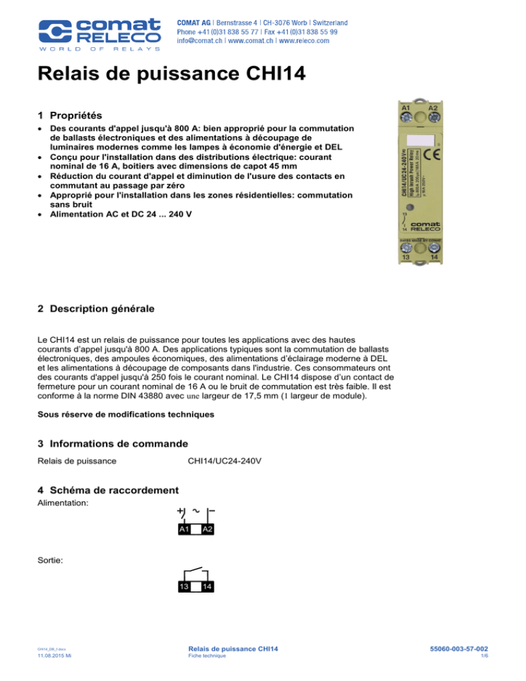 Relais de puissance CHI14 1 Propriétés Des courants d'appel jusqu'à 800 A: bien approprié pour la commutation de ballasts électroniques et des alimentations à découpage de luminaires modernes comme les lampes à économie d'énergie et DEL Conçu pour l'installation dans des distributions électrique: courant nominal de 16 A, boitiers avec dimensions de capot 45 mm Réduction du courant d'appel et diminution de l'usure des contacts en commutant au passage par zéro Approprié pour l'installation dans les zones résidentielles: commutation sans bruit Alimentation AC et DC 24 ... 240 V 2 Description générale Le CHI14 est un relais de puissance pour toutes les applications avec des hautes courants d’appel jusqu'à 800 A. Des applications typiques sont la commutation de ballasts électroniques, des ampoules économiques, des alimentations d’éclairage moderne à DEL et les alimentations à découpage de composants dans l'industrie. Ces consommateurs ont des courants d'appel jusqu'à 250 fois le courant nominal. Le CHI14 dispose d’un contact de fermeture pour un courant nominal de 16 A ou le bruit de commutation est très faible. Il est conforme à la norme DIN 43880 avec une largeur de 17,5 mm (1 largeur de module). Sous réserve de modifications techniques 3 Informations de commande Relais de puissance CHI14/UC24-240V 4 Schéma de raccordement Alimentation: A1 A2 13 14 Sortie: CHI14_DB_f.docx Relais de puissance CHI14 11.08.2015 Mi Fiche technique 55060-003-57-002 1/6 5 Spécifications 5.1 Données générales 5.1.1 Données mécaniques Boîtier Branchement Couple de serrage max. Type de protection Matériau du boîtier Poids Fixation Boîtier DIN, L x H x P: 17.5 x 75 x 64 mm 2 Borne à vis 2.5 mm 0.4 Nm IP20 Lexan EXL9330 env. 70 g TS35 DIN/EN 60715 ou fixation à vis M4 5.1.2 Conditions d’environnement Température de stockage Température de service Humidité relative -40 °C ... +85 °C -40 °C ... +60 °C 10% ... +95% (non-condensé) 5.1.3 Durée de fonctionnement Durée de vie prévue (Contacts du relais: voir 5.4 Circuit de sortie) > 100 000 h (à 25 °C) 5.2 Données électriques 5.2.1 Alimentation UB (A1 – A2) Tension de service nominale (AC/DC) Tension de service (AC/DC) Gamme de fréquence Consommation de courant Courant de démarrage Consommation de puissance 24 ... 240 V 16.8 ... 250 V 16 ... 63 Hz 23 mA 2.5 A, = 100 µs AC: 1.2 VA; DC: 430 mW 5.3 Comportement dans le temps Temps de montée de l’alimentation max. Sécurité en cas d’interruption du secteur min. 60 ms 20 ms CHI14_DB_f.docx Relais de puissance CHI14 11.08.2015 Mi Fiche technique 55060-003-57-002 2/6 5.4 Circuit de sortie Sortie Commutation au pass. par zéro Courant nominal à 40 °C Courant nominal à 60 °C Courant de démarrage Tension nominale Matériau de contact Charge minimale recommandée Durée de vie des contacts Durée de vie mécanique Stabilité en tension Excitation – Contact N.O. Oui 16 A 13 A 165 A / 20 ms 800 A / 200 µs 250 V W / AgSnO2 100 mA / 12 V 3 5 x 10 (16 A, 250 V AC-1) 6 5 x 10 2.5 kV (RMS, 1 min.) 5.5 Performances typiques CHI14 - Pouvoir de coupure CHI14 - Durée de vie électrique CHI14 - Courant de sortie CHI14_DB_f.docx Relais de puissance CHI14 11.08.2015 Mi Fiche technique 55060-003-57-002 3/6 5.5.1 Lamp loads Maximum number of lamps per contact at 230V. Utilization category AC-5a. The following information applies to 100 000 cycles. Last Lampes fluorescentes compactes avec ballaste électronique intégré (ampoules économiques) Lampes fluorescentes avec ballaste électronique externe Puissance [W] 7 9 11 13 18 26 18 2x18 21 2x21 28 2x28 35 2x35 54 2x54 58 2x58 80 2x80 Courant [I] 0.08 0.10 0.12 0.14 0.20 0.27 0.09 0.17 0.11 0.22 0.14 0.27 0.17 0.34 0.26 0.52 0.25 0.48 0.40 0.76 Nombre des lampes [n] 64 50 41 35 25 17 39 21 32 16 25 13 21 10 13 7 14 7 9 5 - - n = 4 A / In Lampes DEL / Alimentations pour DEL n: Nombre des lampes ou alimentations pour DEL In: Consommation de courant des lampes ou alimentations pour DEL CHI14_DB_f.docx Relais de puissance CHI14 11.08.2015 Mi Fiche technique 55060-003-57-002 4/6 6 Application Vue frontale Plaquette signalétique matière synthétique, inscriptible LED jaune Affiche l’état de la sortie et l’écoulement du temps 6.1 Affichage de l’état par LED La LED jaune affiche l’état de la sortie. LED Relais Ne pas allumé Désexcité Allumé en permanence Excité CHI14_DB_f.docx Relais de puissance CHI14 11.08.2015 Mi Fiche technique 55060-003-57-002 5/6 7 Dimensions 8 Normes Résistance aux perturbations EN 61000-6-2:2005 EN 61000-4-2:1995 Niveau 3 (Air: 8 kV) EN 61000-4-4:2004 Niveau 3 (2 kV) EN 61000-4-5:2006 Niveau 3 (2 kV) Emission de perturbations EN 61000-6-3:2007 EN 55022:2006 Classe B Sécurité EN 60730-1:2000 EN 61812-1:1996+A11:1999 EN 50155:2007 Admission UL recognized Conformité, Identification CE 9 Historique des révisions Version 55060-003-57-001 55060-003-57-002 Date de changement Responsable Changement 22.07.2014 Mi Première édition 11.08.2015 Mi UL recognized, Chapitre 5.5.1 CHI14_DB_f.docx Relais de puissance CHI14 11.08.2015 Mi Fiche technique 55060-003-57-002 6/6