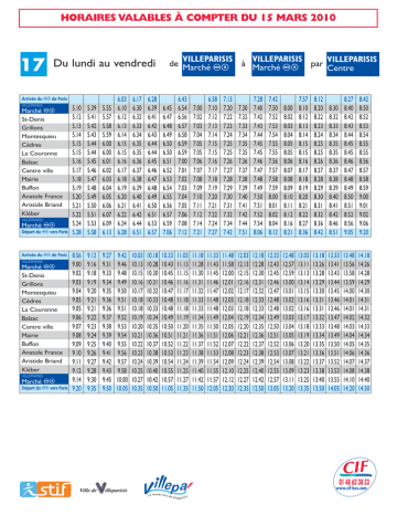HORAIRES VALABLES À COMPTER DU 15 MARS 2010 17 Du lundi au vendredi Arrivée du RB de Paris VILLEPARISIS Marché RB St-Denis Grillons Montesquieu Cèdres La Couronne Balzac Centre ville Mairie Buffon Anatole France Aristide Briand Kléber VILLEPARISIS Marché RB Départ du RB vers Paris Arrivée du RB de Paris VILLEPARISIS Marché RB St-Denis Grillons Montesquieu Cèdres La Couronne Balzac Centre ville Mairie Buffon Anatole France Aristide Briand Kléber VILLEPARISIS Marché RB Départ du RB vers Paris 5.10 5.12 5.13 5.14 5.15 5.15 5.16 5.17 5.18 5.19 5.20 5.21 5.22 5.24 5.28 5.39 5.41 5.42 5.43 5.44 5.44 5.45 5.46 5.47 5.48 5.49 5.50 5.51 5.53 5.58 5.55 5.57 5.58 5.59 6.00 6.00 6.01 6.02 6.03 6.04 6.05 6.06 6.07 6.09 6.13 6.03 6.10 6.12 6.13 6.14 6.15 6.15 6.16 6.17 6.18 6.19 6.20 6.21 6.22 6.24 6.28 8.56 9.00 9.02 9.03 9.04 9.05 9.05 9.06 9.07 9.08 9.09 9.10 9.11 9.12 9.14 9.20 9.12 9.16 9.18 9.19 9.20 9.21 9.21 9.22 9.23 9.24 9.25 9.26 9.27 9.28 9.30 9.35 9.27 9.31 9.33 9.34 9.35 9.36 9.36 9.37 9.38 9.39 9.40 9.41 9.42 9.43 9.45 9.50 9.42 9.46 9.48 9.49 9.50 9.51 9.51 9.52 9.53 9.54 9.55 9.56 9.57 9.58 10.00 10.05 6.17 6.30 6.32 6.33 6.34 6.35 6.35 6.36 6.37 6.38 6.39 6.40 6.41 6.42 6.44 6.51 6.28 6.39 6.41 6.42 6.43 6.44 6.44 6.45 6.46 6.47 6.48 6.49 6.50 6.51 6.53 6.57 10.03 10.13 10.15 10.16 10.17 10.18 10.18 10.19 10.20 10.21 10.22 10.23 10.24 10.25 10.27 10.35 10.18 10.28 10.30 10.31 10.32 10.33 10.33 10.34 10.35 10.36 10.37 10.38 10.39 10.40 10.42 10.50 VILLEPARISIS VILLEPARISIS de Marché à Marché par VILLEPARISIS RB RB Centre 6.45 6.47 6.48 6.49 6.50 6.50 6.51 6.52 6.53 6.54 6.55 6.56 6.57 6.59 7.06 6.43 6.54 6.56 6.57 6.58 6.59 6.59 7.00 7.01 7.02 7.03 7.04 7.05 7.06 7.08 7.12 10.33 10.43 10.45 10.46 10.47 10.48 10.48 10.49 10.50 10.51 10.52 10.53 10.54 10.55 10.57 11.05 11.03 11.13 11.15 11.16 11.17 11.18 11.18 11.19 11.20 11.21 11.22 11.23 11.24 11.25 11.27 11.35 7.00 7.02 7.03 7.04 7.05 7.05 7.06 7.07 7.08 7.09 7.10 7.11 7.12 7.14 7.21 6.58 7.10 7.12 7.13 7.14 7.15 7.15 7.16 7.17 7.18 7.19 7.20 7.21 7.22 7.24 7.27 7.13 7.20 7.22 7.23 7.24 7.25 7.25 7.26 7.27 7.28 7.29 7.30 7.31 7.32 7.34 7.42 11.18 11.28 11.30 11.31 11.32 11.33 11.33 11.34 11.35 11.36 11.37 11.38 11.39 11.40 11.42 11.50 11.33 11.43 11.45 11.46 11.47 11.48 11.48 11.49 11.50 11.51 11.52 11.53 11.54 11.55 11.57 12.05 11.48 11.58 12.00 12.01 12.02 12.03 12.03 12.04 12.05 12.06 12.07 12.08 12.09 12.10 12.12 12.20 7.30 7.32 7.33 7.34 7.35 7.35 7.36 7.37 7.38 7.39 7.40 7.41 7.42 7.44 7.51 7.28 7.40 7.42 7.43 7.44 7.45 7.45 7.46 7.47 7.48 7.49 7.50 7.51 7.52 7.54 8.06 7.42 7.50 7.52 7.53 7.54 7.55 7.55 7.56 7.57 7.58 7.59 8.00 8.01 8.02 8.04 8.12 12.03 12.13 12.15 12.16 12.17 12.18 12.18 12.19 12.20 12.21 12.22 12.23 12.24 12.25 12.27 12.35 12.18 12.28 12.30 12.31 12.32 12.33 12.33 12.34 12.35 12.36 12.37 12.38 12.39 12.40 12.42 12.50 12.33 12.43 12.45 12.46 12.47 12.48 12.48 12.49 12.50 12.51 12.52 12.53 12.54 12.55 12.57 13.05 8.00 8.02 8.03 8.04 8.05 8.05 8.06 8.07 8.08 8.09 8.10 8.11 8.12 8.16 8.21 7.57 8.10 8.12 8.13 8.14 8.15 8.15 8.16 8.17 8.18 8.19 8.20 8.21 8.22 8.27 8.36 8.12 8.20 8.22 8.23 8.24 8.25 8.25 8.26 8.27 8.28 8.29 8.30 8.31 8.32 8.36 8.42 12.48 12.57 12.59 13.00 13.01 13.02 13.02 13.03 13.04 13.05 13.06 13.07 13.08 13.09 13.11 13.20 13.03 13.11 13.13 13.14 13.15 13.16 13.16 13.17 13.18 13.19 13.20 13.21 13.22 13.23 13.25 13.35 13.18 13.26 13.28 13.29 13.30 13.31 13.31 13.32 13.33 13.34 13.35 13.36 13.37 13.38 13.40 13.50 8.30 8.32 8.33 8.34 8.35 8.35 8.36 8.37 8.38 8.39 8.40 8.41 8.42 8.46 8.51 8.27 8.40 8.42 8.43 8.44 8.45 8.45 8.46 8.47 8.48 8.49 8.50 8.51 8.52 8.56 9.05 8.42 8.50 8.52 8.53 8.54 8.55 8.55 8.56 8.57 8.58 8.59 9.00 9.01 9.02 9.06 9.20 13.33 13.41 13.43 13.44 13.45 13.46 13.46 13.47 13.48 13.49 13.50 13.51 13.52 13.53 13.55 14.05 13.48 13.56 13.58 13.59 14.00 14.01 14.01 14.02 14.03 14.04 14.05 14.06 14.07 14.08 14.10 14.20 14.18 14.26 14.28 14.29 14.30 14.31 14.31 14.32 14.33 14.34 14.35 14.36 14.37 14.38 14.40 14.50 01 48 62 38 33 www.cif-bus.com HORAIRES VALABLES À COMPTER DU 15 MARS 2010 17 Du lundi au vendredi Arrivée du RB de Paris VILLEPARISIS Marché RB St-Denis Grillons Montesquieu Cèdres La Couronne Balzac Centre ville Mairie Buffon Anatole France Aristide Briand Kléber VILLEPARISIS Marché RB Départ du RB vers Paris Arrivée du RB de Paris VILLEPARISIS Marché RB St-Denis Grillons Montesquieu Cèdres La Couronne Balzac Centre ville Mairie Buffon Anatole France Aristide Briand Kléber VILLEPARISIS Marché RB Départ du RB vers Paris VILLEPARISIS VILLEPARISIS de Marché à Marché par VILLEPARISIS RB RB Centre 14.33 14.41 14.43 14.44 14.45 14.46 14.46 14.47 14.48 14.49 14.50 14.51 14.52 14.53 14.55 15.05 14.48 14.56 14.58 14.59 15.00 15.01 15.01 15.02 15.03 15.04 15.05 15.06 15.07 15.08 15.10 15.20 15.03 15.11 15.13 15.14 15.15 15.16 15.16 15.17 15.18 15.19 15.20 15.21 15.22 15.23 15.25 15.35 15.33 15.41 15.43 15.44 15.45 15.46 15.46 15.47 15.48 15.49 15.50 15.51 15.52 15.53 15.55 16.05 15.48 15.56 15.58 15.59 16.00 16.01 16.01 16.02 16.03 16.04 16.05 16.06 16.07 16.08 16.10 16.21 16.18 16.26 16.28 16.29 16.30 16.31 16.31 16.32 16.33 16.34 16.35 16.36 16.37 16.38 16.40 16.52 16.33 16.41 16.43 16.44 16.45 16.46 16.46 16.47 16.48 16.49 16.50 16.51 16.52 16.53 16.55 17.06 16.48 17.00 17.02 17.03 17.04 17.05 17.05 17.06 17.07 17.08 17.09 17.10 17.11 17.12 17.16 17.21 17.03 17.10 17.12 17.13 17.14 17.15 17.15 17.16 17.17 17.18 17.19 17.20 17.21 17.22 17.26 17.36 17.12 17.20 17.22 17.23 17.24 17.25 17.25 17.26 17.27 17.28 17.29 17.30 17.31 17.32 17.36 17.52 17.19 17.30 17.32 17.33 17.34 17.35 17.35 17.36 17.37 17.38 17.39 17.40 17.41 17.42 17.46 17.52 19.04 19.10 19.12 19.13 19.14 19.15 19.15 19.16 19.17 19.18 19.19 19.20 19.21 19.22 19.24 19.35 19.12 19.20 19.22 19.23 19.24 19.25 19.25 19.26 19.27 19.28 19.29 19.30 19.31 19.32 19.34 19.50 19.19 19.30 19.32 19.33 19.34 19.35 19.35 19.36 19.37 19.38 19.39 19.40 19.41 19.42 19.44 19.50 19.34 19.40 19.42 19.43 19.44 19.