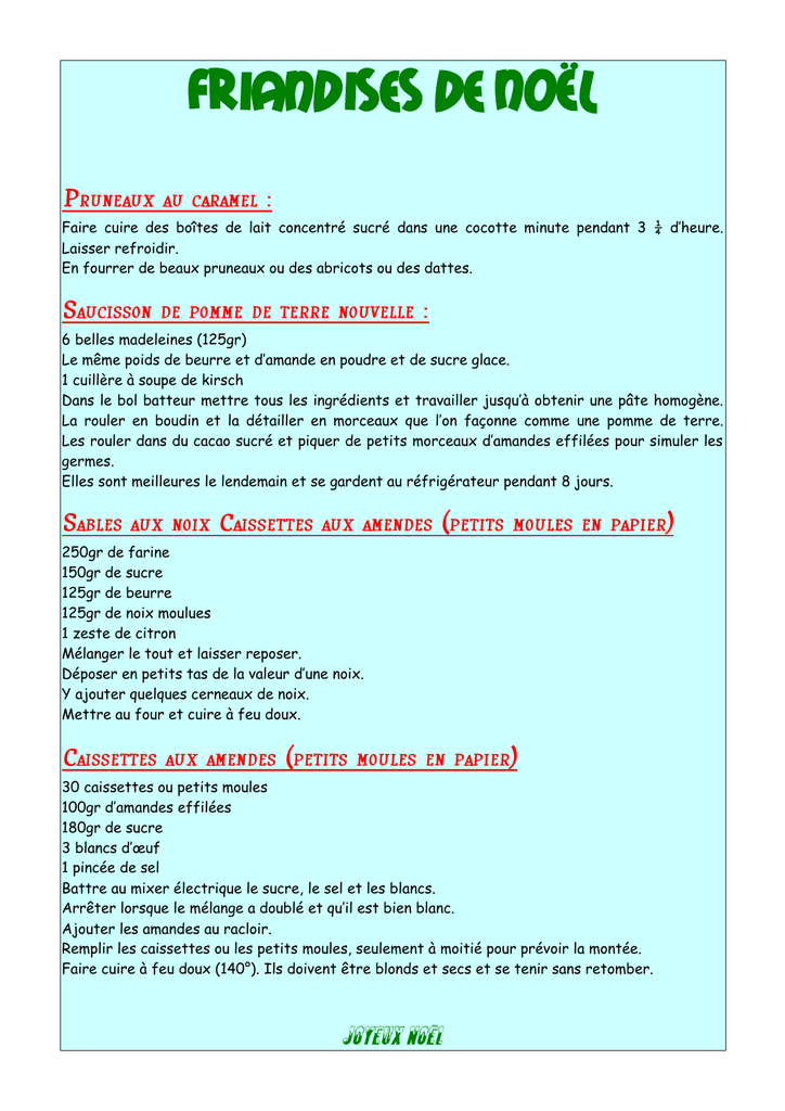 Friandises de Noël PRUNEAUX AU CARAMEL : SAUCISSON DE POMME DE TERRE NOUVELLE Faire cuire des boîtes de lait concentré sucré dans une cocotte minute pendant 3 ¼ d’heure. Laisser refroidir. En fourrer de beaux pruneaux ou des abricots ou des dattes. : 6 belles madeleines (125gr) Le même poids de beurre et d’amande en poudre et de sucre glace. 1 cuillère à soupe de kirsch Dans le bol batteur mettre tous les ingrédients et travailler jusqu’à obtenir une pâte homogène. La rouler en boudin et la détailler en morceaux que l’on façonne comme une pomme de terre. Les rouler dans du cacao sucré et piquer de petits morceaux d’amandes effilées pour simuler les germes. Elles sont meilleures le lendemain et se gardent au réfrigérateur pendant 8 jours. SABLES AUX NOIX CAISSETTES AUX AMENDES (PETITS MOULES EN PAPIER) 250gr de farine 150gr de sucre 125gr de beurre 125gr de noix moulues 1 zeste de citron Mélanger le tout et laisser reposer. Déposer en petits tas de la valeur d’une noix. Y ajouter quelques cerneaux de noix. Mettre au four et cuire à feu doux. CAISSETTES AUX AMENDES (PETITS MOULES EN PAPIER) 30 caissettes ou petits moules 100gr d’amandes effilées 180gr de sucre 3 blancs d’œuf 1 pincée de sel Battre au mixer électrique le sucre, le sel et les blancs. Arrêter lorsque le mélange a doublé et qu’il est bien blanc. Ajouter les amandes au racloir. Remplir les caissettes ou les petits moules, seulement à moitié pour prévoir la montée. Faire cuire à feu doux (140°). Ils doivent être blonds et secs et se tenir sans retomber. Joyeux Noël PETITS CREUSOIS (POUR 24 PETITS GÂTEAUX ENVIRON) 100gr de noisettes en poudre 150gr de sucre 100gr de farine 1 sachet de vanille 100gr de beurre fondu 4 blancs d’œuf montés en neige Pour la déco : pâte d’amande, noisettes ou fraises en bonbon. Mélanger les poudres dans un bol mixeur. Y ajouter le beurre fondu. Incorporer délicatement les blancs en neige. Mettre dans de petits moules beurrés et faire cuire à feu doux. Décorer selon l’envie. Les petits gâteaux se gardent bien et se congèlent. SAUCISSON ROSE : 24 biscuits roses de Reims 100gr de beurre en pommade 20gr de pistaches 2 cuillères à soupe de rhum Dans un bol mixer de 3 litres, écraser les biscuits sans les mixer. Ajouter le beurre mou, les pistaches et le rhum Etaler sur du papier aluminium. Le plier en deux. Placer la préparation 1 heure au réfrigérateur. Découper en tranches. Se garde une semaine au réfrigérateur. FIGUES FARCIES AU CHOCOLAT : 500gr de figues (Les petites figues rondes de Smyrne conviennent mieux que les figues plates en paquet.) 250gr de chocolat fondu 50gr de beurre Quelques amandes Faire fondre le chocolat. Y ajouter le beurre. Dès que le mélange épaissit, fourrer les figues avec une boulette de chocolat. Décorer d’une amande et garder au frais. BUCHES OU PETIT FOUR SAUCISSON : 1 boîte de biscuits cuillère 250gr de beurre mou 230gr de chocolat 1 tasse de café fort Joyeux Noël rhum 6 œufs Ecraser très grossièrement les biscuits avec le rouleau ou au mixer. Mélanger au mixer le beurre ramolli, le café et le rhum. Faire fondre le chocolat et y ajouter les jaunes d’œuf. Mélanger les 2 préparations et y incorporer les blancs montés en neige. Mettre dans un moule carré et plat. Laisser raffermir quelques heures. (2 jours au plus) Découper des petits carrés et décorer. PETITS LIMOUSINS : 125gr de chocolat 100gr de beurre mou 250gr de crème de marron 2 cuillères à soupe de rhum Faire fondre le chocolat, y ajouter le beurre, la crème de marron et le rhum. Travailler sans excès et tasser dans ne tartinette ou une favorite mouillée. Laisser refroidir et découper en cubes. Servir dans des caissettes et décorer avec un petit bonbon ou un pois de crème au beurre. Se garde très bien au réfrigérateur. CONGOLAIS : 4 blancs d’œuf 200gr de sucre 100gr de noix de coco râpée 1 pincée de sel Battre les blancs avec le sel et le sucre. Lorsque le mélange est mousseux et à peine coulant, y ajouter la noix de coco. Remplir les caissettes au 2/3 et les disposer sur une plaque Les faire cuire environ 20mn à feu doux. PRALINES OU TRUFFES allant au four. : 150gr de chocolat 150gr de noix hachées ½ boîte de lait concentré non sucré 50gr de noix de coco hachée 15ml de cacao 15ml de sucre glace Faire fondre le chocolat, y ajouter les noix hachées et le lait concentré bien frais. Dans une ravière, mélanger le cacao amer et la noix de coco. A l’aide d’une petite cuillère, former des petites boulettes de la première préparation et les rouler dans la seconde. Les disposer dans des caissettes. Se conservent 3 jours au réfrigérateur. Joyeux Noël BOULETTES AUX FRUITS SECS : 200gr de pâte d’amande verte ou blanche Un sirop fait avec 100gr de sucre et 50ml d’eau refroidi Divers fruits secs (noisettes, pignons de pin, pistaches…) Faire des boulettes de pâte d’amande de la taille d’une noix. Les passer dans le sirop. Et les rouler dans les fruits secs préalablement écrasés. Laisser sécher. CORNES DE GAZELLES : 230gr de poudre d’amande 150gr de sucre glace 50gr de beurre fondu Un peu d’eau 50ml de fleur d’oranger Mélanger le tout. Former des petits croissants avec la pâte. Les passer au four 20mn à 190°. Les sortir et les saupoudrer de sucre glace. PETITS FOURS : 2 blancs d’œuf 125gr de sucre 200gr de poudre d’amande 1 goutte d’essence d’amande amère Décor : demies cerises confites et bâtonnets d’angélique Mélanger tous les ingrédients dans un grand bol batteur. La pâte obtenue doit être épaisse pour tenir un dessin avec la poche douille cannelée. (Essayer au four, si elle s’étale, rajouter de la poudre d’amande) Disposer sur une tôle avec du papier aluminium. Laisser dorer en surveillant le four. Les retirer et les faire briller avec du lait concentré passé au pinceau. Joyeux Noël
