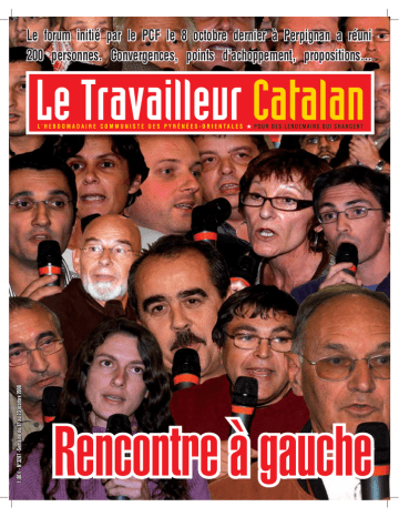 Le forum initié par le PCF le 8 octobre dernier à Perpignan a réuni 200 personnes. Convergences, points d’achoppement, propositions… Le Travailleur Catalan 1,80 C - N°3287 -Semaine du 17 au 23 ocotbre 2008 L ’ H E B D O M A D A I R E C O M M U N I S T E D E S P Y R É N É E S - O R I E N T A L E S ★ POUR DES LENDEMAINS QUI CHANGENT Rencontre à gauche • TC 3287 15/10/08 20:55 Page 2 2 lu - vu - entendu 7 sur 7 Consultez le Travailleur Catalan en ligne Dès le mardi sur le site www.letc.fr L’eau publique peut-elle être moins chère ? La moyenne du prix de l’eau dans les villes qui sont en régie publique est de 2,19 euros le m3 contre 2,93 euros à celles qui ont délégué le service au privé. A Perpignan où Veolia est sous contrat jusqu’en 2011, l’eau valait il y a peu encore 3,30 euros le m3. Elle vient de baisser à 3 euros, mais demeure encore largement au dessus de la moyenne la plus haute. Par rapport à des villes comme Lille ou Bordeaux, qui ont renouvelé leur contrat avec le privé, Perpignan est la moins bien lotie puisque la première a perçu 140 millions d’euros de son fermier et la seconde 233 millions d’euros au titre de «trop perçu» et des marges bénéficiaires «excessives» des sociétés fermières. En 2011 la capitale du département pourra renégocier son contrat avec l’objectif de fournir à l’usager une eau de bonne qualité au prix le plus juste, espérerons que ce sera le cas. Manifestement si ce critère prévaut, la régie fera son retour sur les berges de la Basse. Espérons qu’au cours de prochaines élections municipales, qui auront lieu en 2009 suite à l’invalidation de Jean-Paul Alduy, la gauche portera clairement sur son programme la municipalisation de l’eau en 2011. Ce sera aussi ça l’alternative à gauche. Alexandre Reynal président Un Catalan dénonce les gestions socialistes Le maire socialiste d’Amélie vient d’être brillamment réélu à la présidence de l’association régionale Languedoc-Roussillon des maires des stations classées et des communes touristiques. L’édile de la 5e ville thermale de France se voit récompensé pour son action en faveur du thermalisme… Avec la création du label « Famille plus » auquel sa ville va adhérer, un nouveau pas va être franchi dans la qualité de l’accueil et le tout nouveau président, qui entame son deuxième mandat, entend travailler cette question avec les communes labellisées. A noter qu’entre au conseil d’administration de la même association Christian Olive le maire du Boulou, ce qui montre bien aux pouvoirs publics et à tout le monde qu’en Vallespir il ne faut pas laisser tomber le thermalisme. L’homme est bien meilleur professionnel que politique mais il n’est pas le seul dans ce cas. Rivesaltais d’origine, Jacques Domergue, par ailleurs grand bonhomme de la médecine régionale, n’est guère heureux en politique. Après avoir conquis de haute lutte un siège de député, occupé avant lui par un certain George Frêche, il a vécu plusieurs expériences malheureuses, notamment celle de la municipale de Montpellier face à une Hélène Mandroux qu’il a largement sous-estimée. Le plus Montpelliérain des Catalans vient à nouveau de s’emmêler les bistouris en présentant ce que l’on hésite à appeler un livre. « Le livre noir de la gestion des villes socialistes », c’est comme ça qu’il s’appelle, copié d’une idée originale d’un certain Roger Karoutchi, ami personnel de Sarkozy et secrétaire d’Etat chargé des relations avec le Parlement, ne devrait pas faire une longue carrière dans les librairies. Tout juste les choux gras des petits journaux qui sévissent çà et là sur l’hexagone. Entouré de quelques grands élus et quelques grands battus comme lui, Jacques Domergue veut démontrer dans cette production les dérives gestionnaires des villes socialistes. Que ce soit clair, le TC ne veut pas venir au secours des édiles socialistes mis en cause, ils seront de taille à se défendre, cela ne fait aucun doute. Mais nous devons à la vérité de dire que l’initiative de l’exilé catalan tient plus de la paille détectée dans l’oeil du voisin … En effet, les grandes villes qui ont fait à ce jour l’actualité avec des scandales étaient dirigées par des élus de droite comme Domergue. Rappelons-nous Paris, Lyon, Nice, Grenoble… sans parler de la chaussette perpignanaise. ✄ Bulletin d’abonnement Nom: Hebdomadaire édité par la Fédération des Pyrénées-Orientales du Parti Communiste Français Prénom: Adresse: Rédaction - Administration Maison communiste 44 av. de Prades - 66000 Perpignan Tél. 04 68 67 00 88 - Fax 04 68 67 56 14 Courriel : [email protected] Commission Paritaire N° 0409 I 84 621 N° ISSN 1279-2039 Je souhaite recevoir à mon adresse pendant : 3 mois (19 €) Je règl e: 6 mois (36 €) Par chèque à l’ordre du Travailleur Catalan 1 an (70 €) Par prélèvement automatique (18 €/trimestre) Service abonnements: Tel 04 68 67 00 88 44 av de Prades - 66000 Perpignan N°3287 - Semaine du 17 au 23 octobre 2008 Gérant : Rémi Cathala Directeur de publication : Sébastien Pouilly Rédaction : Michèle Devaux, Annette Dieguez, Robert Escaro, Philippe Galano, Nicolas Garcia, Nicole Gaspon, Paul Hallenaut, Roger Hillel, Yvette Lucas, Jacques Majester, Sébastien Pouilly, Raymonde Pumareda, Jean Quillio (Photo), Nicole Santasusana, Jean-Pierre Ventura Correction : Pierre Régnaud Mise en page : Jean-Claude Assalit Impression : Imprimerie Salvador Webmaster : Christian Dieguez Abonnement : Tél : 04 68 67 00 88 Régie publicitaire : Richard Siméon Le Travailleur Catalan - Inter Perpignan Publicité 44 av. de Prades - 66000 Perpignan Tél. 04 68 67 00 88 - Fax 04 68 67 56 14 Courriel : [email protected] Georges Frêche pourrait revenir au PS Le vin est bon, il faudra le boire… avec modération Il est vraiment atypique le président du Conseil régional. I