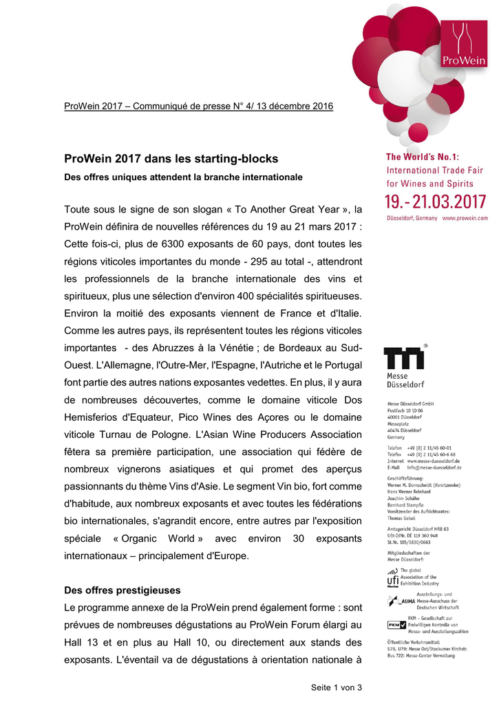 ProWein 2017 – Communiqué de presse N° 4/ 13 décembre 2016 ProWein 2017 dans les starting-blocks Des offres uniques attendent la branche internationale Toute sous le signe de son slogan « To Another Great Year », la ProWein définira de nouvelles références du 19 au 21 mars 2017 : Cette fois-ci, plus de 6300 exposants de 60 pays, dont toutes les régions viticoles importantes du monde - 295 au total -, attendront les professionnels de la branche internationale des vins et spiritueux, plus une sélection d'environ 400 spécialités spiritueuses. Environ la moitié des exposants viennent de France et d'Italie. Comme les autres pays, ils représentent toutes les régions viticoles importantes - des Abruzzes à la Vénétie ; de Bordeaux au SudOuest. L'Allemagne, l'Outre-Mer, l'Espagne, l'Autriche et le Portugal font partie des autres nations exposantes vedettes. En plus, il y aura de nombreuses découvertes, comme le domaine viticole Dos Hemisferios d'Equateur, Pico Wines des Açores ou le domaine viticole Turnau de Pologne. L'Asian Wine Producers Association fêtera sa première participation, une association qui fédère de nombreux vignerons asiatiques et qui promet des aperçus passionnants du thème Vins d'Asie. Le segment Vin bio, fort comme d'habitude, aux nombreux exposants et avec toutes les fédérations bio internationales, s'agrandit encore, entre autres par l'exposition spéciale « Organic World » avec environ 30 exposants internationaux – principalement d'Europe. Des offres prestigieuses Le programme annexe de la ProWein prend également forme : sont prévues de nombreuses dégustations au ProWein Forum élargi au Hall 13 et en plus au Hall 10, ou directement aux stands des exposants. L'éventail va de dégustations à orientation nationale à Seite 1 von 3 des combinaisons dépassant les origines, comme la zone de dégustation du Grand Prix International du Vin MUNDUS VINI. Des points forts thématiques seront par exemple le Champagne Lounge, unique au monde et au design noble, avec 40 maisons de champagne riches en traditions. Il se trouve au centre de la zone Champagne, où exposent 150 autres marques. L'exposition spéciale « same but different » montre des idées hors du commun autour du thème Vins et spiritueux. Dix participants en tout y présentent leurs idées innovantes dans le domaine de la production et de la commercialisation du vin, et par là fournissent plein d'inspiration. Une autre exposition spéciale de la ProWein se consacre au thème Packaging & Design et montre les tendances et développements actuels dans ce domaine. Au fizzz Lounge, des barmen branchés comme Tom Weinberger mettent l'accent sur le café, le vin et les bières Craft. Jusque-là les nouveaux ingrédients tenaient un rôle principal en tant que solistes, à présent leurs arômes individuels fusionnent avec des spiritueux de haute qualité afin d'aboutir à des expériences gustatives exceptionnelles. Les bières Craft se marient avec le whiskey ou la tequila, servent de remplisseur ou remplacement d'amers classiques, ou fournissent la base pour des sirops particuliers. Les partenaires parfaits du vin sont les spiritueux vieillis comme le rhum, les eaux-de-vie de vin ou les liqueurs. Le café est non seulement découvert en tant que complément idéal des spiritueux, mais apporte au bar une sensation gustative toute nouvelle par de nouveaux modes de préparation comme Cold Drip, Coldbrew ou en tant que Nitro-Café enrichi en azote. Des services améliorés pour les visiteurs Afin que tous les visiteurs du salon puissent passer les jours de salon bien restaurés, la zone Gastro de la ProWein a été agrandie. La nouvelle offre, dont font aussi partie quelques FoodTrucks, se Seite 2 von 3 trouve sur le terrain entre les Halls 9 à 17. Une orientation parfaite est fournie à tous les visiteurs par le nouveau Visitor‘s Guide, distribué gratuitement à toutes les entrées de la ProWein et qui comprend un plan des halls ainsi qu'une liste de tous les exposants. Afin de vous préparer au mieux à votre visite à Düsseldorf, le site Web redessiné de la ProWein à l'adresse www.prowein.de fournit plein d'informations utiles et importantes, de la base de données des exposants au Ticketshop en ligne en passant par l'ExportGuide. Contact presse: Messe Düsseldorf GmbH, Pressereferat ProWein Christiane Schorn, Brigitte Küppers (assistance) tél.: +49 (0)211/4560 –991/–929 [email protected], [email protected] Plus d'informations sous: www.prowein.de ou dans les réseaux sociaux Facebook: www.facebook.com/ProWein.tradefair Twitter: https://twitter.com/ProWein Vous trouverez des images en haute résolution dans notre vaste base de données photo dans la partie «Presse» sur www.prowein.de. Seite 3 von 3