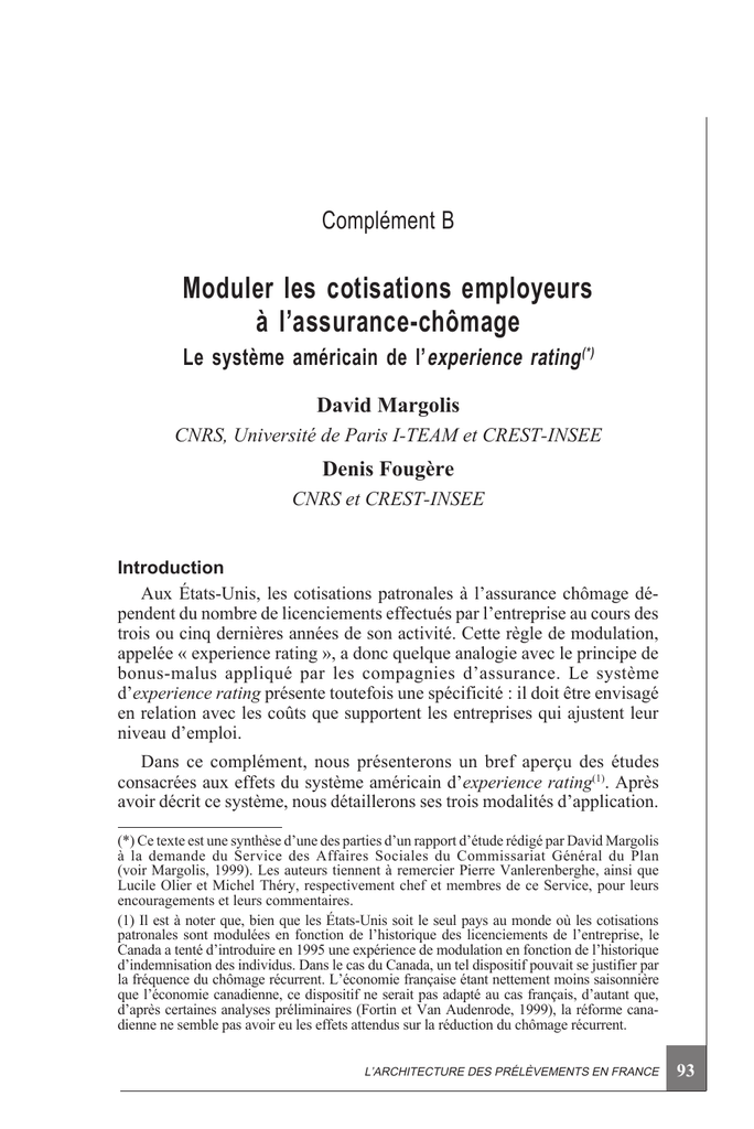 Complément B Moduler les cotisations employeurs à l’assurance-chômage Le système américain de l’ experience rating (*) David Margolis CNRS, Université de Paris I-TEAM et CREST-INSEE Denis Fougère CNRS et CREST-INSEE Introduction Aux États-Unis, les cotisations patronales à l’assurance chômage dépendent du nombre de licenciements effectués par l’entreprise au cours des trois ou cinq dernières années de son activité. Cette règle de modulation, appelée « experience rating », a donc quelque analogie avec le principe de bonus-malus appliqué par les compagnies d’assurance. Le système d’experience rating présente toutefois une spécificité : il doit être envisagé en relation avec les coûts que supportent les entreprises qui ajustent leur niveau d’emploi. Dans ce complément, nous présenterons un bref aperçu des études consacrées aux effets du système américain d’experience rating(1). Après avoir décrit ce système, nous détaillerons ses trois modalités d’application. (*) Ce texte est une synthèse d’une des parties d’un rapport d’étude rédigé par David Margolis à la demande du Service des Affaires Sociales du Commissariat Général du Plan (voir Margolis, 1999). Les auteurs tiennent à remercier Pierre Vanlerenberghe, ainsi que Lucile Olier et Michel Théry, respectivement chef et membres de ce Service, pour leurs encouragements et leurs commentaires. (1) Il est à noter que, bien que les États-Unis soit le seul pays au monde où les cotisations patronales sont modulées en fonction de l’historique des licenciements de l’entreprise, le Canada a tenté d’introduire en 1995 une expérience de modulation en fonction de l’historique d’indemnisation des individus. Dans le cas du Canada, un tel dispositif pouvait se justifier par la fréquence du chômage récurrent. L’économie française étant nettement moins saisonnière que l’économie canadienne, ce dispositif ne serait pas adapté au cas français, d’autant que, d’après certaines analyses préliminaires (Fortin et Van Audenrode, 1999), la réforme canadienne ne semble pas avoir eu les effets attendus sur la réduction du chômage récurrent. L’ARCHITECTURE DES PRÉLÈVEMENTS EN FRANCE 93 Puis nous ferons un bilan de l’état actuel de ce système en insistant sur son efficacité. Les études empiriques, principalement celles ayant examiné les effets de la modulation des cotisations, seront brièvement présentées dans la quatrième partie. Nous résumerons les effets de ce système sur le niveau du chômage, en particulier sur le chômage partiel, et sur sa distribution au travers des secteurs, mais aussi sur le lissage de ses fluctuations saisonnières et au cours du cycle économique. Nous conclurons en évoquant ce que pourraient être les réactions des entreprises françaises à la mise en place d’un tel système. Pour ce faire, nous résumerons les résultats des travaux qui ont examiné la façon dont elles adaptent actuellement l’emploi aux variations de leurs coûts d’ajustement, mais surtout aux spécificités institutionnelles en matière de fonctionnement du marché de travail. Le fonctionnement de l’assurance chômage aux États-Unis L’assurance chômage aux États-Unis a été conçue comme un véritable dispositif d’assurance, le volet d’assistance sociale étant réservé à d’autres programmes. Les indemnisations sur lesquelles les taux de cotisation sont basés sont limitées dans le temps (en général, pas plus de vingt-six semaines sauf cas exceptionnel) et leur versement est soumis à des conditions d’éligibilité strictes. En particulier, les allocations ne peuvent être versées qu’à la suite d’un licenciement pour raison économique, et les employeurs ont le droit de contester toute demande d’indemnisation faite par un de leurs ex-employés. Parce que la modulation des taux de cotisation est au cœur du système de financement de l’assurance chômage, les entreprises profitent de ce droit de contrôle pour tenter de réduire les taux de cotisation auxquels elles seront soumises dans le futur (Anderson et Meyer,1998). Aujourd’hui, il existe principalement trois formules d’application du principe de modulation des cotisations patronales à l’assurance chômage. Ces approches sont le ratio de réserves (reserve ratio), le ratio de versements (benefit ratio) et le ratio des salaires des allocataires (benefit wage ratio). Certains États (notamment la Pennsylvanie) ont adopté des méthodes de calcul des taux qui mélangent certaines de ces trois modalités(2). Tous ces systèmes fonctionnent essentiellement de la même façon. L’État calcule un ratio (selon une formule pré-établie) pour chaque entreprise, en fonction de son historique de licenciement. Ce ratio est ensuite comparé à un barème des taux, qui dépend de la solvabilité globale de la caisse d’assurance chômage. Cette comparaison fournit un taux de cotisation, auquel (2) L’Alaska utilise un système fondé sur la « masse salariale décroissante » (declining payroll), dans lequel les taux sont fonction de la taille de la réduction de la masse salariale. Étant donné que l’Alaska est le seul État à proposer un tel système, nous n’en parlerons pas ici. Tous les détails sur le système de l’Alaska sont disponibles sur le site internet http://www.labor.state.ak.us/esd_tax_handbook/taxbook.htm 94 CONSEIL D’ANALYSE ÉCONOMIQUE viendront s’ajouter éventuellement des pénalités en cas de paiement tardif des cotisations. Par ailleurs, tous les États ont mis en place des taux de cotisation plafond et plancher, qui limitent le degré de modulation pour les ratios les plus et les moins élevés. Le ratio de réserves Cette formule, adoptée par trente-trois États (dont le District de Colombie, Porto Rico et les Îles Vierges), est la plus répandue aux États-Unis. Ce système est fondé sur des comptes fictifs(3) étab