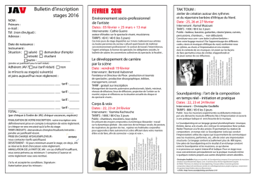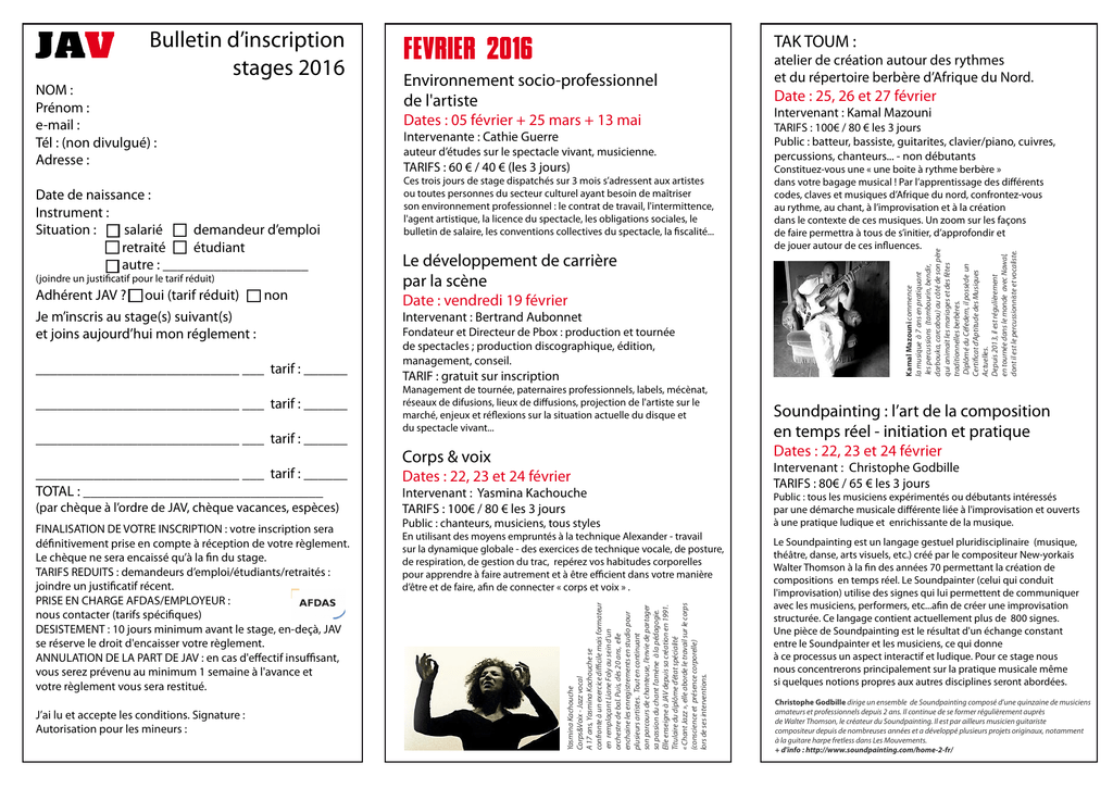 Date de naissance : Instrument : Situation : salarié demandeur d’emploi retraité étudiant autre : ____________________ (joindre un justificatif pour le tarif réduit) Adhérent JAV ? oui (tarif réduit) non Je m’inscris au stage(s) suivant(s) et joins aujourd’hui mon réglement : ____________________________ ___ tarif : ______ ____________________________ ___ tarif : ______ ____________________________ ___ tarif : ______ ____________________________ ___ tarif : ______ TOTAL : _________________________________ (par chèque à l’ordre de JAV, chèque vacances, espèces) FINALISATION DE VOTRE INSCRIPTION : votre inscription sera définitivement prise en compte à réception de votre règlement. Le chèque ne sera encaissé qu’à la fin du stage. TARIFS REDUITS : demandeurs d’emploi/étudiants/retraités : joindre un justificatif récent. PRISE EN CHARGE AFDAS/EMPLOYEUR : nous contacter (tarifs spécifiques) DESISTEMENT : 10 jours minimum avant le stage, en-deçà, JAV se réserve le droit d'encaisser votre règlement. ANNULATION DE LA PART DE JAV : en cas d'effectif insuffisant, vous serez prévenu au minimum 1 semaine à l'avance et votre règlement vous sera restitué. J’ai lu et accepte les conditions. Signature : Autorisation pour les mineurs : TAK TOUM : Environnement socio-professionnel de l'artiste Date : 25, 26 et 27 février Dates : 05 février + 25 mars + 13 mai Intervenante : Cathie Guerre auteur d’études sur le spectacle vivant, musicienne. TARIFS : 60 € / 40 € (les 3 jours) Ces trois jours de stage dispatchés sur 3 mois s’adressent aux artistes ou toutes personnes du secteur culturel ayant besoin de maîtriser son environnement professionnel : le contrat de travail, l'intermittence, l'agent artistique, la licence du spectacle, les obligations sociales, le bulletin de salaire, les conventions collectives du spectacle, la fiscalité... Le développement de carrière par la scène Date : vendredi 19 février Intervenant : Bertrand Aubonnet Fondateur et Directeur de Pbox : production et tournée de spectacles ; production discographique, édition, management, conseil. TARIF : gratuit sur inscription Management de tournée, paternaires professionnels, labels, mécènat, réseaux de difusions, lieux de diffusions, projection de l'artiste sur le marché, enjeux et réflexions sur la situation actuelle du disque et du spectacle vivant... atelier de création autour des rythmes et du répertoire berbère d’Afrique du Nord. Intervenant : Kamal Mazouni TARIFS : 100€ / 80 € les 3 jours Public : batteur, bassiste, guitarites, clavier/piano, cuivres, percussions, chanteurs... - non débutants Constituez-vous une « une boite à rythme berbère » dans votre bagage musical ! Par l’apprentissage des différents codes, claves et musiques d’Afrique du nord, confrontez-vous au rythme, au chant, à l’improvisation et à la création dans le contexte de ces musiques. Un zoom sur les façons de faire permettra à tous de s’initier, d’approfondir et de jouer autour de ces influences. Kamal Mazouni commence la musique à 7 ans en pratiquant les percussions (tambourin, bendir, darbouka, carcabou) au côté de son père qui animait les mariages et des fêtes traditionnelles berbères. Diplômé du Céfedem, il possède un Certificat d'Aptitude des Musiques Actuelles. Depuis 2013, il est régulièrement en tournée dans le monde avec Nawal, dont il est le percussionniste et vocaliste. NOM : Prénom : e-mail : Tél : (non divulgué) : Adresse : FEVRIER 2016 Soundpainting : l’art de la composition en temps réel - initiation et pratique Dates : 22, 23 et 24 février Corps & voix Dates : 22, 23 et 24 février Intervenant : Yasmina Kachouche TARIFS : 100€ / 80 € les 3 jours Public : chanteurs, musiciens, tous styles En utilisant des moyens empruntés à la technique Alexander - travail sur la dynamique globale - des exercices de technique vocale, de posture, de respiration, de gestion du trac, repérez vos habitudes corporelles pour apprendre à faire autrement et à être efficient dans votre manière d’être et de faire, afin de connecter « corps et voix » . Yasmina Kachouche Corps&Voix - Jazz vocal A 17 ans, Yasmina Kachouche se confronte à un exercice difficile mais formateur en remplaçant Liane Foly au sein d’un orchestre de bal. Puis, dès 20 ans, elle enchaine les enregistrements en studio pour plusieurs artistes. Tout en continuant son parcours de chanteuse, l’envie de partager sa passion du chant l’amène à la pédagogie. Elle enseigne à JAV depuis sa création en 1991. Titulaire du diplôme d’état spécialité « Chant Jazz », elle aborde le travail sur le corps (conscience et présence corporelle) lors de ses interventions. Bulletin d’inscription stages 2016 Intervenant : Christophe Godbille TARIFS : 80€ / 65 € les 3 jours Public : tous les musiciens expérimentés ou débutants intéressés par une démarche musicale différente liée à l'improvisation et ouverts à une pratique ludique et enrichissante de la musique. Le Soundpainting est un langage gestuel pluridisciplinaire (musique, théâtre, danse, arts visuels, etc.) créé par le compositeur New-yorkais Walter Thomson à la fin des années 70 permettant la création de compositions en temps réel. Le Soundpainter (celui qui conduit l'improvisation) utilise des signes qui lui permettent de communiquer avec les musiciens, performers, etc...afin de créer une improvisation structurée. Ce langage contient actuellement plus de 800 signes. Une pièce de Soundpainting est le résultat d'un échange constant entre le Soundpainter et les musiciens, ce qui donne à ce processus un aspect interactif et ludique. Pour ce stage nous nous concentrerons principalement sur la pratique musicale même si quelques notions propres aux autres disciplines seront abordées. Christophe Godbille dirige un ensemble de Soundpainting composé d’une quinzaine de musiciens amateurs et professio