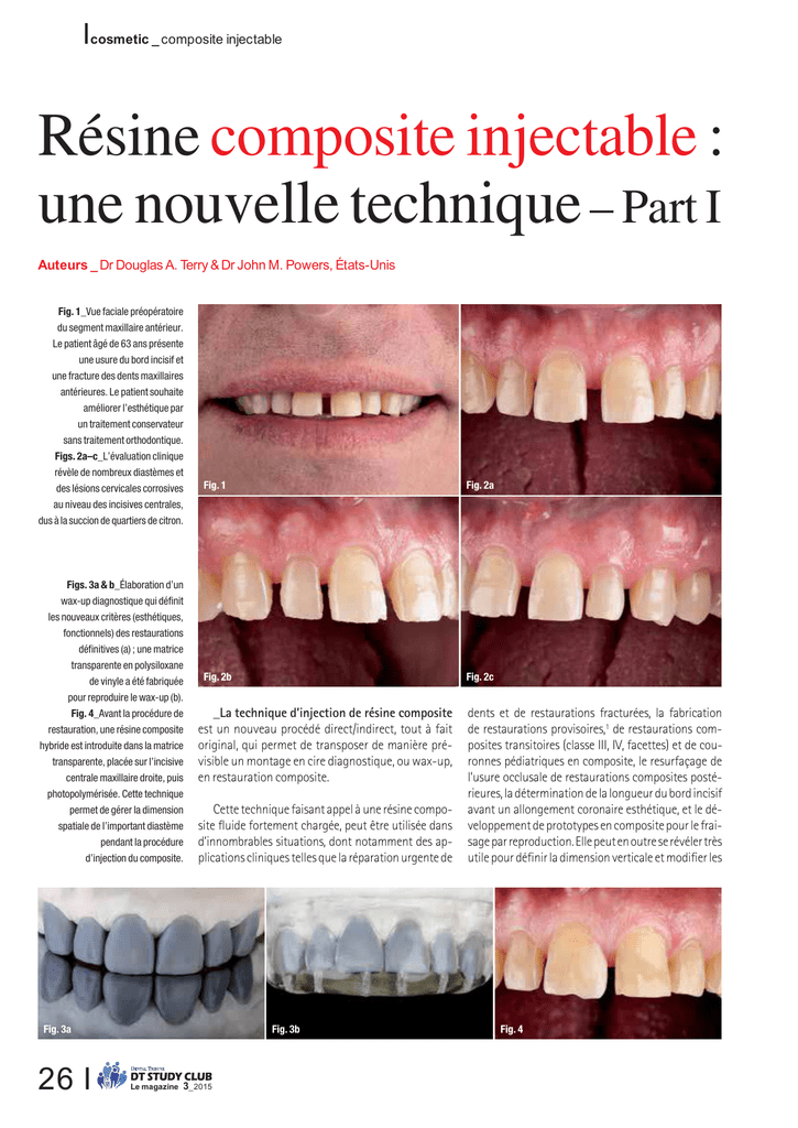 Icosmetic _ composite injectable Résine composite injectable : une nouvelle technique – Part I Auteurs _ Dr Douglas A. Terry & Dr John M. Powers, États-Unis Fig. 1_Vue faciale préopératoire du segment maxillaire antérieur. Le patient âgé de 63 ans présente une usure du bord incisif et une fracture des dents maxillaires antérieures. Le patient souhaite améliorer l’esthétique par un traitement conservateur sans traitement orthodontique. Figs. 2a–c_L’évaluation clinique révèle de nombreux diastèmes et des lésions cervicales corrosives au niveau des incisives centrales, dus à la succion de quartiers de citron. Figs. 3a & b_Élaboration d’un wax-up diagnostique qui définit les nouveaux critères (esthétiques, fonctionnels) des restaurations définitives (a) ; une matrice transparente en polysiloxane de vinyle a été fabriquée pour reproduire le wax-up (b). Fig. 4_Avant la procédure de restauration, une résine composite hybride est introduite dans la matrice transparente, placée sur l’incisive centrale maxillaire droite, puis photopolymérisée. Cette technique permet de gérer la dimension spatiale de l’important diastème pendant la procédure d’injection du composite. Fig. 1 Fig. 2a Fig. 2b Fig. 2c _La technique d’injection de résine composite est un nouveau procédé direct/indirect, tout à fait original, qui permet de transposer de manière prévisible un montage en cire diagnostique, ou wax-up, en restauration composite. Cette technique faisant appel à une résine composite fluide fortement chargée, peut être utilisée dans d’innombrables situations, dont notamment des applications cliniques telles que la réparation urgente de Fig. 3a 26 I Fig. 3b Le magazine 3_2015 dents et de restaurations fracturées, la fabrication de restaurations provisoires,1 de restaurations composites transitoires (classe III, IV, facettes) et de couronnes pédiatriques en composite, le resurfaçage de l’usure occlusale de restaurations composites postérieures, la détermination de la longueur du bord incisif avant un allongement coronaire esthétique, et le développement de prototypes en composite pour le fraisage par reproduction. Elle peut en outre se révéler très utile pour définir la dimension verticale et modifier les Fig. 4 cosmetic _ composite injectable Fig. 5b Fig. 5a Fig. 6a Fig. 5c Fig. 5d Fig. 5e Fig. 6b Fig. 7a Fig. 7b schémas d’occlusion (guidage antérieur et désocclusion postérieure) avant les restaurations définitives. Cette technique non-invasive est de plus un outil à part entière, pour améliorer la communication entre le patient et l’équipe chargée de la restauration pendant la planification du traitement. Le présent article porte sur une étude de cas dont les restaurations transitoires en résine composite ont été élaborées au moyen de résine composite injectable. L’utilisation de la technique d’injection pour fabriquer des restaurations transitoires en résine composite est un excellent moyen de mieux faire comprendre la procédure clinique planifiée et le résultat définitif prévu au patient.2 Les maquettes en résine transitoires permettent au patient et à l’équipe dentaire de définir les paramètres de la fonction occlusale,3 la position et l’alignement des dents,4 la forme de la restauration et le contour physiologique,5 la teinte et la texture du matériau de restauration, le profil labial, la composante phonétique, la position du bord incisif et l’orientation de la gencive. Ce procédé écarte aussi tout malentendu entre le patient et l’équipe dentaire pendant la phase de planification du traitement.2 La technique d’injection peut en outre être utilisée pour la détermination des profils des tissus mous et leur prise en charge, ainsi que pour la conception de la restauration définitive.6–9 Réversible et sans préparation, elle peut servir de guide au clini- Fig. 8 I Figs. 5a–e_Avant la préparation de la surface adhésive, la dent est isolée des dents adjacentes au moyen d’une bande de téflon (a) ; un semi-gel d’acide phosphorique à 37,5 % (Gel Etchant, Kerr/Sybron) est appliqué sur la surface de l’émail pendant 30 secondes, rincé pendant 5 secondes, et séché doucement à l’air (b) ; un adhésif monocomposant est étalé avec un applicateur sur la surface de l’émail, laissé en place pendant 10 secondes (c), séché à l’air pendant 5 secondes (d) et photopolymérisé pendant 10 secondes au moyen d’une lampe LED/halogène (e). Figs. 6a & b_La matrice transparente en polysiloxane a été placée sur l’arcade et une résine composite fluide de teinte A2 opaque (G-ænial Universel Flo, GC) est d’abord injectée par un petit orifice situé au-dessus de la surface dentaire, suivie par une Fig. 7c résine composite fluide de teinte B1 (a) ; la résine composite est polymérisée à travers la matrice transparente pendant 40 secondes (b). Figs. 7a–c_L’excès de résine composite polymérisée est éliminé à l’aide d’une lame de scalpel (BD Bard-Parker™ no 12, BD Medical) (a) ; la tige de coulée du composite au niveau du bord incisif est éliminée au moyen d’une fraise à finir conique à 30 cannelures (b) ; le tissu gingival est rétracté avec un protecteur gingival et une fraise à finir diamantée conique est utilisée pour la finition de l’interface dent/résine composite (c). Fig. 8_Le montage en composite hybride élaboré initialement sur l’incisive centrale maxillaire droite est éliminé à l’aide d’une lame de scalpel (BD Bard-Parker™ no 12, BD Medical). Le magazine 3_2015 I 27 Icosmetic _ composite injectable Fig. 9a Fig. 9b Figs. 9a & b_Les faces et contours proximaux sont polis avec une fraise à finir diamantée conique et des bandes de finition/polissage. Chaque dent a été complètement restaurée avant de passer à la dent suivante. Figs. 10a & b_Après avoir isolé les dents adjacentes avec une bande de téflon, 