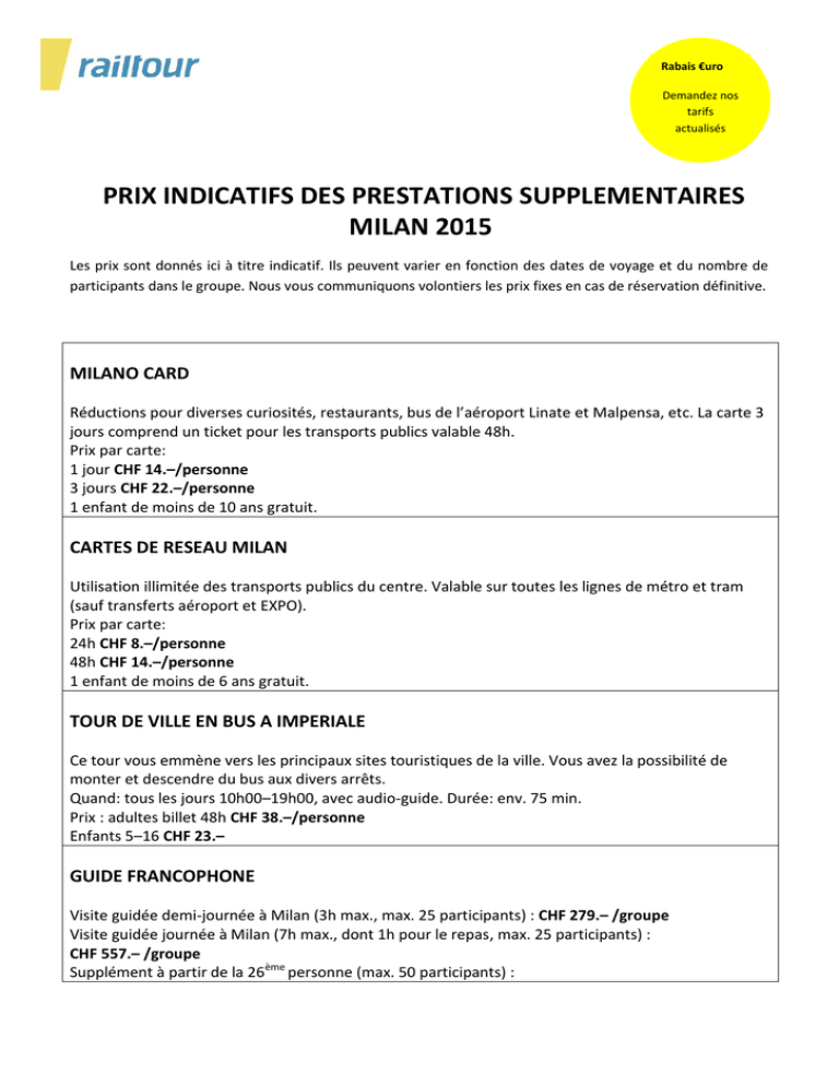 Rabais €uro Demandez nos tarifs actualisés PRIX INDICATIFS DES PRESTATIONS SUPPLEMENTAIRES MILAN 2015 Les prix sont donnés ici à titre indicatif. Ils peuvent varier en fonction des dates de voyage et du nombre de participants dans le groupe. Nous vous communiquons volontiers les prix fixes en cas de réservation définitive. MILANO CARD Réductions pour diverses curiosités, restaurants, bus de l’aéroport Linate et Malpensa, etc. La carte 3 jours comprend un ticket pour les transports publics valable 48h. Prix par carte: 1 jour CHF 14.–/personne 3 jours CHF 22.–/personne 1 enfant de moins de 10 ans gratuit. CARTES DE RESEAU MILAN Utilisation illimitée des transports publics du centre. Valable sur toutes les lignes de métro et tram (sauf transferts aéroport et EXPO). Prix par carte: 24h CHF 8.–/personne 48h CHF 14.–/personne 1 enfant de moins de 6 ans gratuit. TOUR DE VILLE EN BUS A IMPERIALE Ce tour vous emmène vers les principaux sites touristiques de la ville. Vous avez la possibilité de monter et descendre du bus aux divers arrêts. Quand: tous les jours 10h00–19h00, avec audio-guide. Durée: env. 75 min. Prix : adultes billet 48h CHF 38.–/personne Enfants 5–16 CHF 23.– GUIDE FRANCOPHONE Visite guidée demi-journée à Milan (3h max., max. 25 participants) : CHF 279.– /groupe Visite guidée journée à Milan (7h max., dont 1h pour le repas, max. 25 participants) : CHF 557.– /groupe Supplément à partir de la 26ème personne (max. 50 participants) : Visite guidée demi-journée à Milan (3h max.) : CHF 344.– /groupe Visite guidée journée à Milan (7h max., dont 1h pour le repas) : CHF 623.– /groupe Heure supplémentaire : CHF 91.– /groupe Supplément pour des jours fériés : CHF 82.– /groupe Assistance francophone demi-journée : CHF 344.– /groupe Assistance francophone journée : CHF 623.– /groupe Assistance francophone pendant le transfert aéroport Malpensa – Milan ou vice-versa : CHF 312.– /groupe /trajet Assistance francophone pendant le transfert aéroport Linate – Milan ou vice-versa : CHF 246.– /groupe /trajet Service de transfert et visite guidée demi-journée à Milan (3h max.) : CHF 508.– /groupe Service de transfert et visite guidée journée à Milan (7h max., dont 1h pour le repas) : CHF 705.– /groupe BUS AVEC CHAUFFEUR (30 PLACES) Transfert gare – hôtel (ou vice-versa) : CHF 328.– /groupe /trajet Transfert aéroport Linate – hôtel (ou vice-versa) : CHF 328.– /groupe /trajet Transfert aéroport Malpensa – hôtel (ou vice-versa) : CHF 475.– /groupe /trajet Transfert hôtel – foire (ou vice-versa) : CHF 328.– /groupe /trajet Transfert aéroport Linate/Malpensa – Como (ou vice-versa) : CHF 713.– /groupe /trajet Transfert aéroport Linate/Malpensa – Stresa (ou vice-versa) : CHF 713.– /groupe /trajet Tour de ville de Milan demi-journée (4h max.) : CHF 541.– /groupe Tour de ville de Milan journée (8h max.) : CHF 754.– /groupe Transfert hôtel – restaurant – hôtel (50 km max., de 19h à minuit) : CHF 582.– /groupe Transfert aéroport Linate – hôtel (ou vice-versa) et tour de ville de Milan demi-journée : CHF 713.– /groupe Transfert aéroport Linate – hôtel (ou vice-versa) et tour de ville de Milan journée : CHF 934.– /groupe Transfert aéroport Malpensa – hôtel (ou vice-versa) et tour de ville de Milan demi-journée : CHF 819.– /groupe Transfert aéroport Malpensa – hôtel (ou vice-versa) et tour de ville de Milan journée : CHF 1040.– /groupe Supplément férié (journée) : CHF 115.– /groupe Supplément férié (demi-journée) : CHF 66.– /groupe Supplément repas chauffeur : CHF 41.– /groupe Heure supplémentaire : CHF 99.– /groupe Supplément nuit (de 20h à 06h) : supplément de 15% sur les prix mentionnés ci-dessus Remarque : tarifs sur demande pour les autres capacités de bus (19 ou 50 places). EXCURSION AU LAC DE COME (JOURNEE) Visite à pied du centre-ville de Côme (y compris de la cathédrale s’il n’y a pas de célébration religieuse). Croisière sur le lac à la découverte des villas et des personnages historiques qui ont marqué la vie politique, sociale et culturelle de la région. Visite de Bellagio, petite ville connue comme la “perle du lac” grâce à sa situation privilégiée sur le promontoire qui sépare les deux bras du lac. Elle offre une vue magnifique à 360°. A Tremezzo, visite de la luxueuse Villa Carlotta sur les bords du lac avec son magnifique jardin botanique. Bus + guide Milan – Côme – Milan : CHF 1680.– /groupe Bus Milan – Côme – Milan + guide local à Côme : CHF 1614.– /groupe Billet croisière : CHF 25.– /personne EXCURSION A BERGAME (JOURNEE OU DEMI-JOURNEE) Visite à pied du centre-ville historique, situé au sommet d’une colline et entouré de fortifications du XVIe siècle, offrant une vue magnifique sur la partie plus moderne de la ville et la Plaine du Pô. Découverte du quartier médiéval et de la très belle Piazza Vecchia, au centre de la cité, qui est entourée de nombreux édifices historiques. Bus + guide Milan – Bergame – Milan (journée) : CHF 1598.– /groupe Bus Milan – Bergame – Milan + guide local à Bergame (journée) : CHF 1532.– /groupe Bus Milan – Bergame – Milan + guide local à Bergame (demi-journée) : CHF 992.– /groupe EXCURSION A PAVIE, LA CHARTREUSE ET VIGEVANO (JOURNEE) Pavie est une ville très agréable à visiter. De nombreux monuments (son château, son université, ses églises et son pont couvert) témoignent de l’importance de la ville, surtout au Moyen Age, quand elle fut la capitale du royaume lombard. Visite de la Chartreuse de Pavie, le plus important monument du gothique tardif en Italie. Continuation vers Vigevano, ville natale du duc Ludovico Sforza, connue aujourd’hui pour être la capitale italienne de la chaussure. Bus + guide Milan – Pavie – Vigevano – Milan : CHF 1639.– /groupe Bus Milan – Pavie – Vigevan