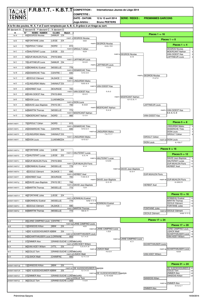 COMPETITION : F.R.B.T.T. - K.B.T.T.B. Internationaux Jeunes de Liège 2014 COMPETITIE : DATE - DATUM: 12 & 13 avril 2014 Juge-Arbitre : Bruno PEETERS SERIE / REEKS : PREMINIMES GARCONS A la fin des poules, W, X, Y et Z sont remplacés par A, B, C, D grâce à un tirage au sort. W devient A ; Z devient B ; Y devient C ; X devient D H 1er A N° NOMS - NAMEN 69 DEGROS Nicolas CLUBS Match NAMUR C6 match a 4e B 48 FONTAINE Jules LIEGE 3e D 75 GROULT Célian NORD E4 Places 1 -> 16 DEGROS Nicolas Places 1 -> 8 5,8,6 match i match b 2e C 47 HAUTERAT Lucas LIEGE DEGROS Nicolas 815 E2 Places 1 -> 4 -6,4,6,-13,5 GROULT Célian match q 2e D 90 ZUR MUHLEN Floris DEGROS Nicolas PAYS-BAS 5,7,9 match c 3e C 70 LAFFINEUR Louis NAMUR 4e A 63 BONNEAU Ezekiel MOSELLE DEGROS Nicolas MOERCANT Nathan VAN OOEST Kas LAFFINEUR Louis 6,2,8 D4 25 DEMARCHE Théo CENTRE 836 1er C 4 CECILE Clément ALSACE 696 11,9,9 DEMARCHE Théo -5,10,-3,-6 match y match e 4e D 41 LINGURSKI Maiko HAINAUT E0 3e B 20 HERBST Axel BOURGOGNE 2e A 89 VAN OOEST Kas PAYS-BAS 2e B 58 DION Louis LUXEMBOURG D4 -11,4,7,4 -5,8,9,-8,-9 VAN OOEST Kas 705 match f VAN OOEST Kas -5,-9,-2 -8,-6,-3 match r PAYS DE LOIRE 799 DION Louis LAFFINEUR Louis 8,-6,9,8 match l MOSELLE 76 MOERCANT Nathan NORD 988 perdant match i 75 GROULT Célian NORD 815 perdant match j 25 DEMARCHE Théo CENTRE match u 836 -5,-4,-9 58 DION Louis Places 5 -> 8 DEMARCHE Théo LINGURSKI Maiko DEMARCHE Théo DION Louis GROULT Célian -9,10,-6,-3 LINGURSKI Maiko -7,4,-7,7,-7 LUXEMBOURG D4 LINGURSKI Maiko 48 FONTAINE Jules LIEGE -9,10,12,7 match ad match m 47 HAUTERAT Lucas LIEGE perdant match c 90 ZUR MUHLEN Floris PAYS-BAS perdant match d 63 BONNEAU Ezekiel MOSELLE E2 HAUTERAT Lucas 779 ALSACE ZUR MUHLEN Floris 4,1,4 perdant match f 20 HERBST Axel BOURGOGNE 705 perdant match g 86 DAVID Jean-Baptiste PAYS DE LOIRE 799 MOSELLE perdant match m 48 FONTAINE Jules LIEGE 773 63 BONNEAU Ezekiel MOSELLE ZUR MUHLEN Floris 4 CECILE Clément 64 MARTIN Thomas match ab 779 ALSACE -6,-9,8,8,10 DAVID Jean-Baptiste HERBST Axel 7,2,9 BONNEAU Ezekiel 773 BONNEAU Ezekiel MARTIN Thomas CECILE Clément FONTAINE Jules forfait -0 -0 -0 BONNEAU Ezekiel 696 MOSELLE ZUR MUHLEN Floris Places 13 -> 16 match x perdant match p DAVID Jean-Baptiste -3,-5,-10 match ae perdant match o 6,8,7 MARTIN Thomas 26 LAINE CAMPINO Louis CENTRE 6e B 13 DANDOIS Killian -9,6,-6,-11 match af 6e D 14 DE VLEESCHOUWER Hippolyte BBW E6 LAINE CAMPINO Louis match ak LAINE CAMPINO Louis CECILE Clément SCHAFFHAUSER Louis 9,-7,-4,-5 match ao 5e B 37 ZIMMER Alex 6e A 96 VAN HOEY Willem 6e C 36 COLLE Tom LAINE CAMPINO Louis LISACK Maël SCHAFFHAUSER Louis VAN HOEY Willem 1,12,9 809 match al 5e D 31 LISACK Maël GRAND-DUCHE LUXEMBOURG match aj LISACK Maël -5,-11,1,-9 CHAMPAGNE-ARDENNE 666 perdant match ag 13 DANDOIS Killian BBW perdant match ai 37 ZIMMER Alex perdant match aj 36 COLLE Tom E6 18 19 20 4,7,1 SCHAFFHAUSER Louis LISACK Maël match ap -10,-8,-9 SCHAFFHAUSER Louis 12,9,9 VAN HOEY Willem Places 21 -> 24 E6 match am 14 DE VLEESCHOUWER Hippolyte BBW 17 LAINE CAMPINO Louis GRAND-DUCHE LUXEMBOURG match ai VAN HOEY Willem 5,-9,-4,11,-8 VTTL E6 perdant match ah 16 Places 17 -> 20 E6 54 SCHAFFHAUSER Louis LORRAINE 5e C 15 forfait -0 -0 -0 4,9,5 match ah 14 Places 17 -> 24 829 match ag BBW 13 FONTAINE Jules CECILE Clément 5e A 12 7,-8,9,-6,-9 E4 match w perdant match n 11 -6,-9,-4 HERBST Axel match t match p 9 10 DAVID Jean-Baptiste 696 match o 64 MARTIN Thomas DION Louis DAVID Jean-Baptiste HAUTERAT Lucas ZUR MUHLEN Floris HERBST Axel 3,-6,4,6 match aa perdant match h 8 Places 9 -> 12 -5,-5,-14 match n 4 CECILE Clément 7 -6,-15,8,-7 HAUTERAT Lucas match s perdant match e 6 Places 9 -> 16 E4 perdant match b 5 GROULT Célian DION Louis perdant match a VAN OOEST Kas 6,9,-6,-5,-8 VAN OOEST Kas -3,-4,-9 HAINAUT E0 match v perdant match l match z MOERCANT Nathan match ac 41 LINGURSKI Maiko MOERCANT Nathan 773 match h perdant match k MOERCANT Nathan -6,11,5,-8,-11 match g 1er D DEGROS Nicolas LINGURSKI Maiko match k 64 MARTIN Thomas 4 LAFFINEUR Louis 779 1er B 4e C 3 -9,-6,-8 match d 86 DAVID Jean-Baptiste 2 LAFFINEUR Louis match j 3e A 1 DE VLEESCHOUWER Hippolyte DE VLEESCHOUWER Hippolyte 21 COLLE Tom 22 ZIMMER Alex 23 DANDOIS Killian 24 -5,-7,11,-6 match aq GRAND-DUCHE LUXEMBOURG match an COLLE Tom GRAND-DUCHE LUXEMBOURG -7,-9,-8 DE VLEESCHOUWER Hippolyte -6,-10,10,8,8 DANDOIS Killian match ar ZIMMER Alex -4,7,5,-6,-7 ZIMMER Alex Préminimes Garçons 14/04/2014
